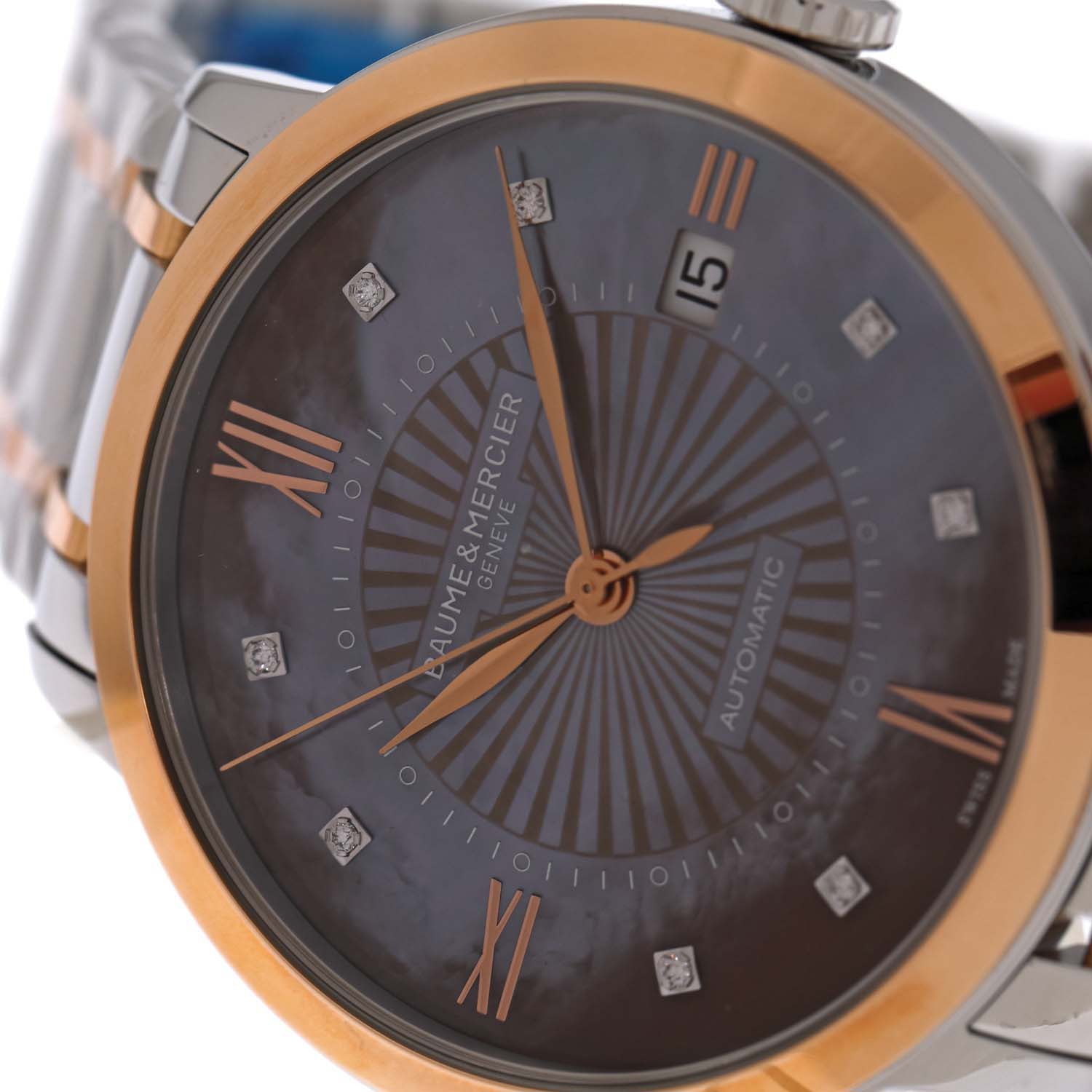 Baume&Mercier Classima gold-plated steel wristwatch for ladies, new, reference M0A10297. Automatic movement, caliber ETA 2892-A2. Brown dial, Roman numeral hour markers, date register at 3 o'clock. Original gold-plated steel bracelet with deployant clasp. Accessories: original box, warranty card.