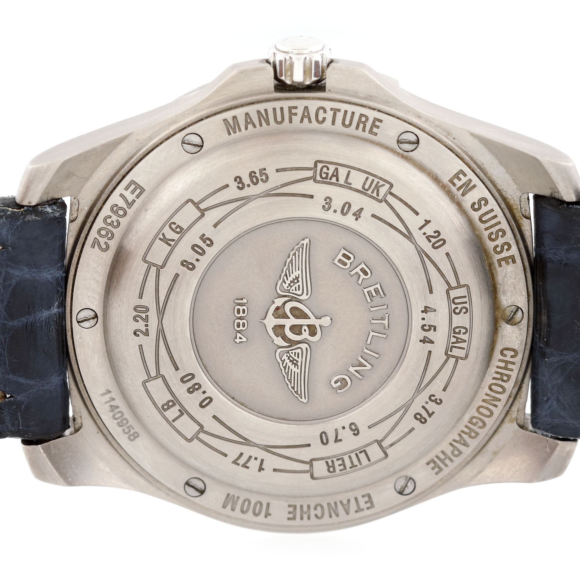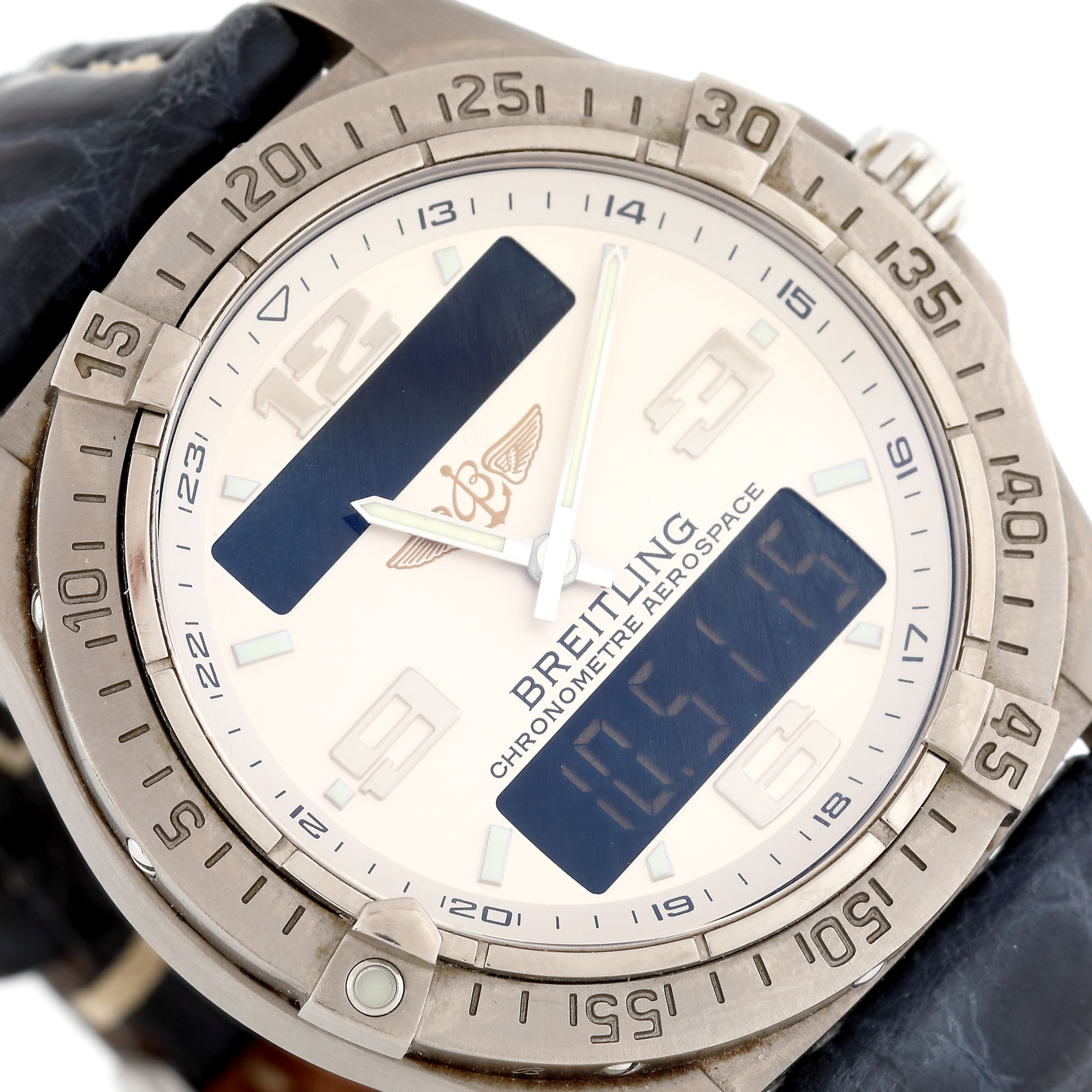 Ceas Breitling Aerospace Avantage, din titan, de mână, bărbătesc, referință E79362, mecanism quartz, calibru Breitling 79. Cadran de culoare alb, cu indecși luminiscenți, numerale arabe și două ecrane LCD. Bezel rotativ unidirecțional. Brățară din piele, de culoare albastră și cataramă din titan, originale.