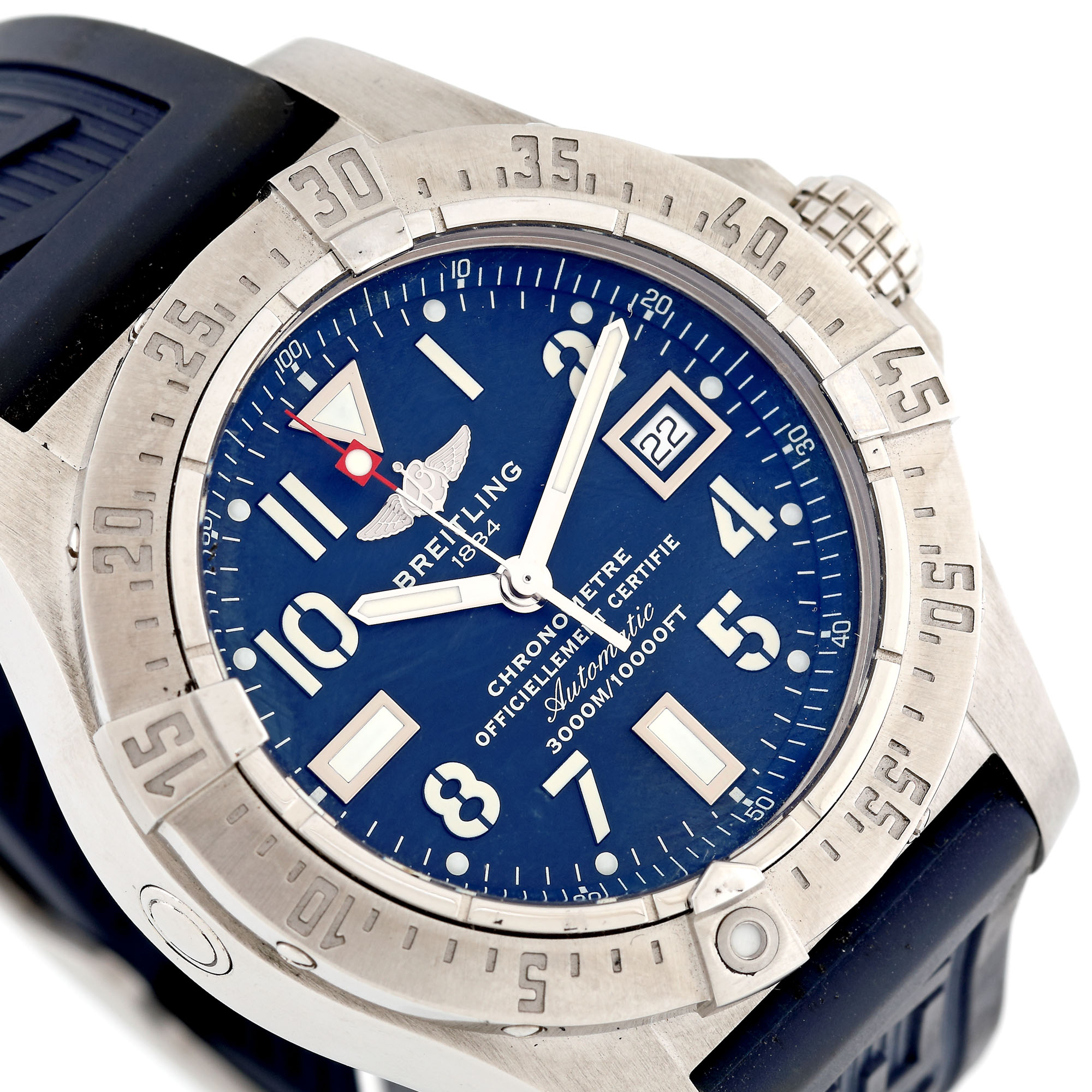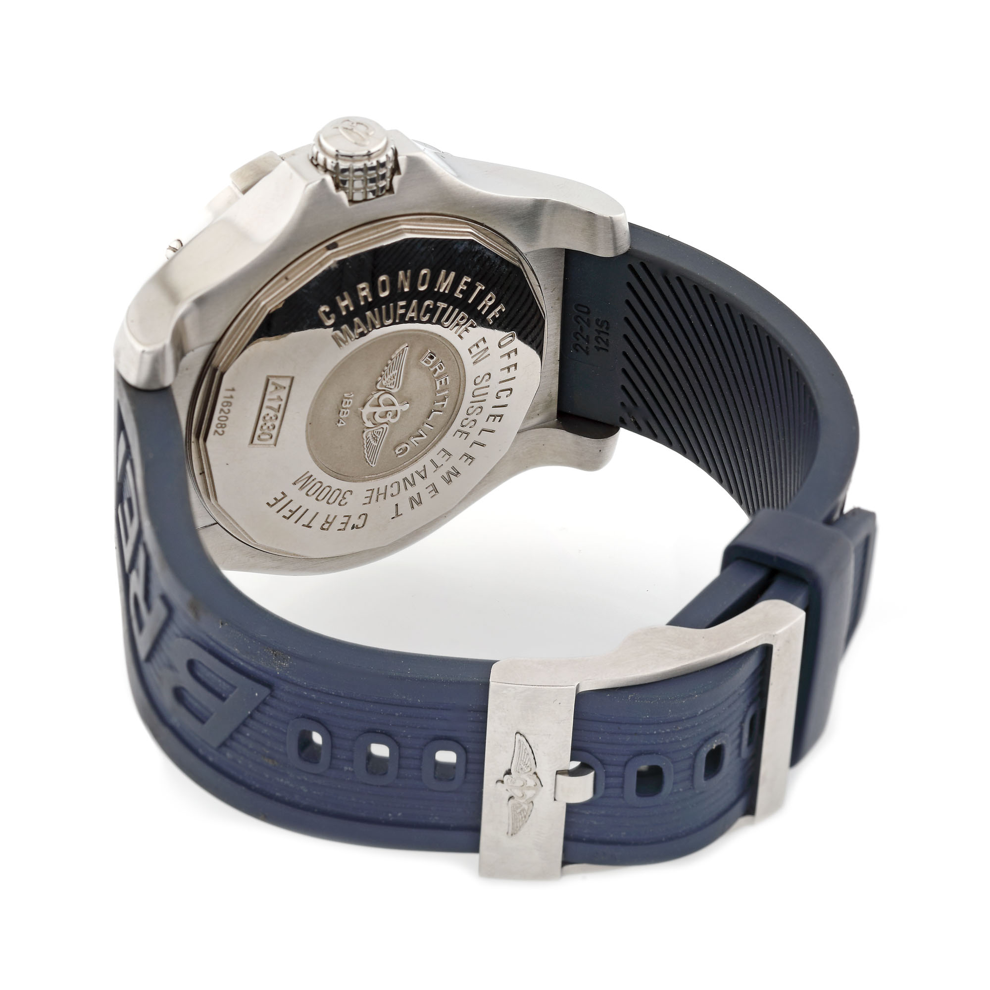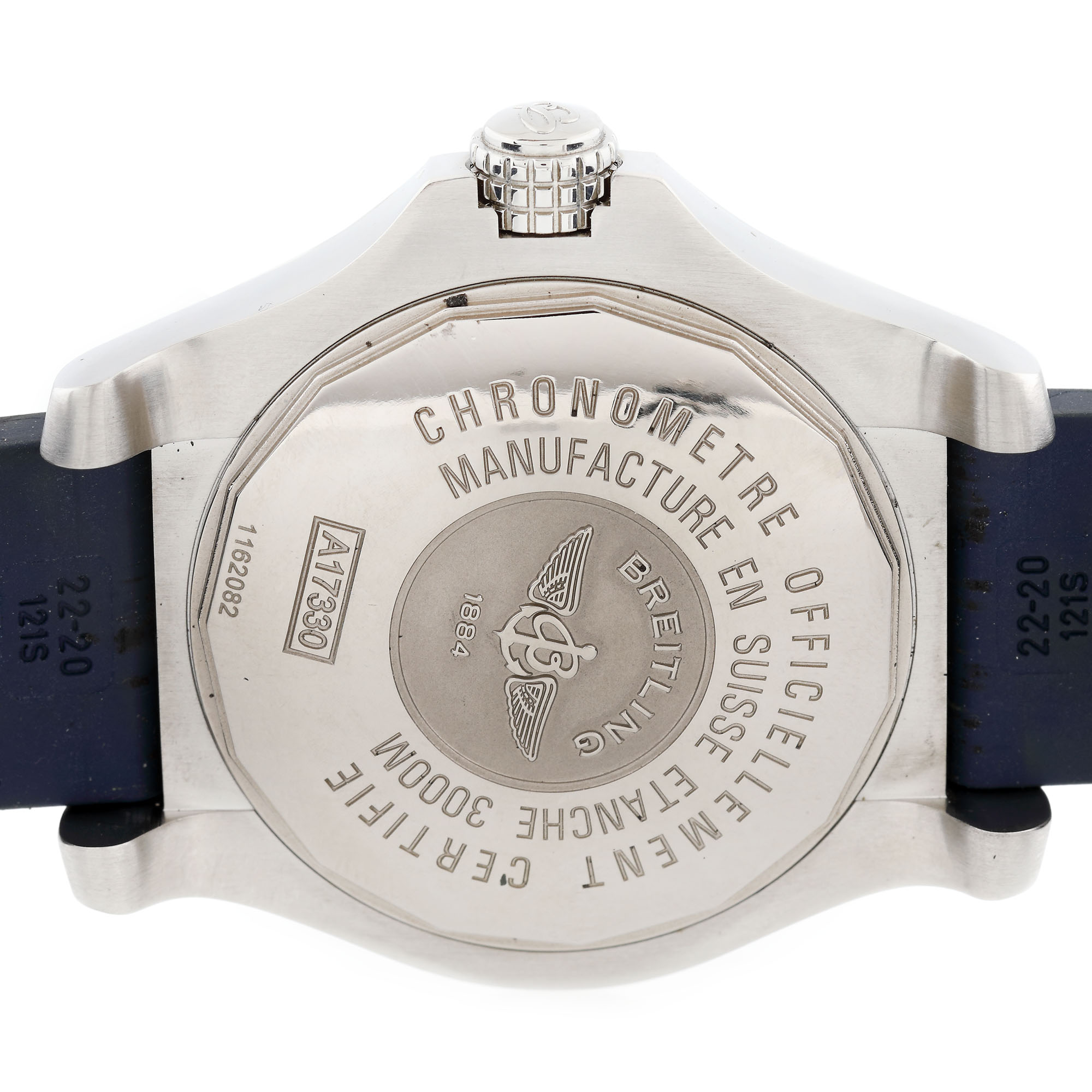 Ceas Breitling Avenger II Seawolf, de mână, bărbătesc, referință A17330, mecanism automatic. Cadran de culoare negru, numerale arabe și dată în dreptul orei 3. Curea din silicon, de culoare bleumarin și cataramă din oțel inoxidabil, originale. Accesorii: certificatul de garanție internațională, nesemnat și nedatat; manual de utilizare; cutia originală.