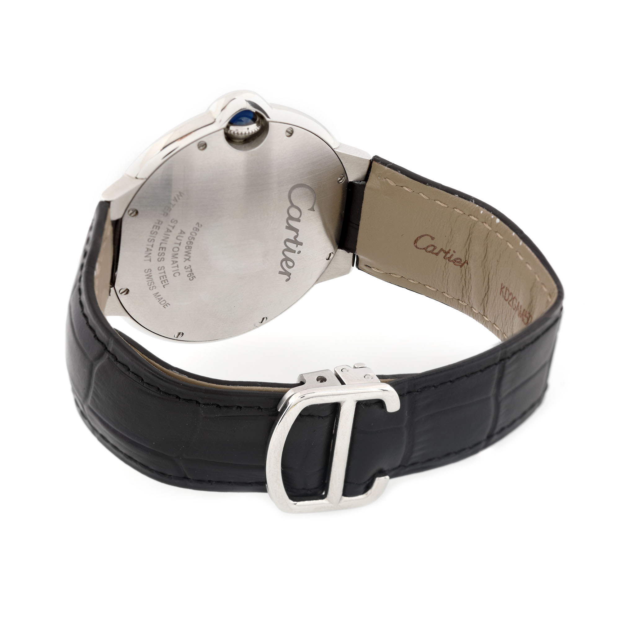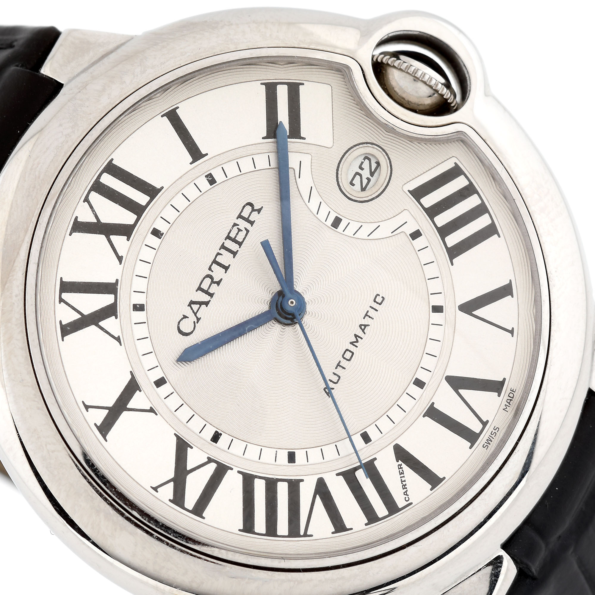 Ceas Cartier Ballon Bleu, din oțel, de mână, bărbătesc, referință 3765, mecanism automatic. Cadran de culoare alb, cu numerale romane și dată în dreptul orei 3. Curea din piele, de culoare neagră și sistem de închidere tip deployant, originale.