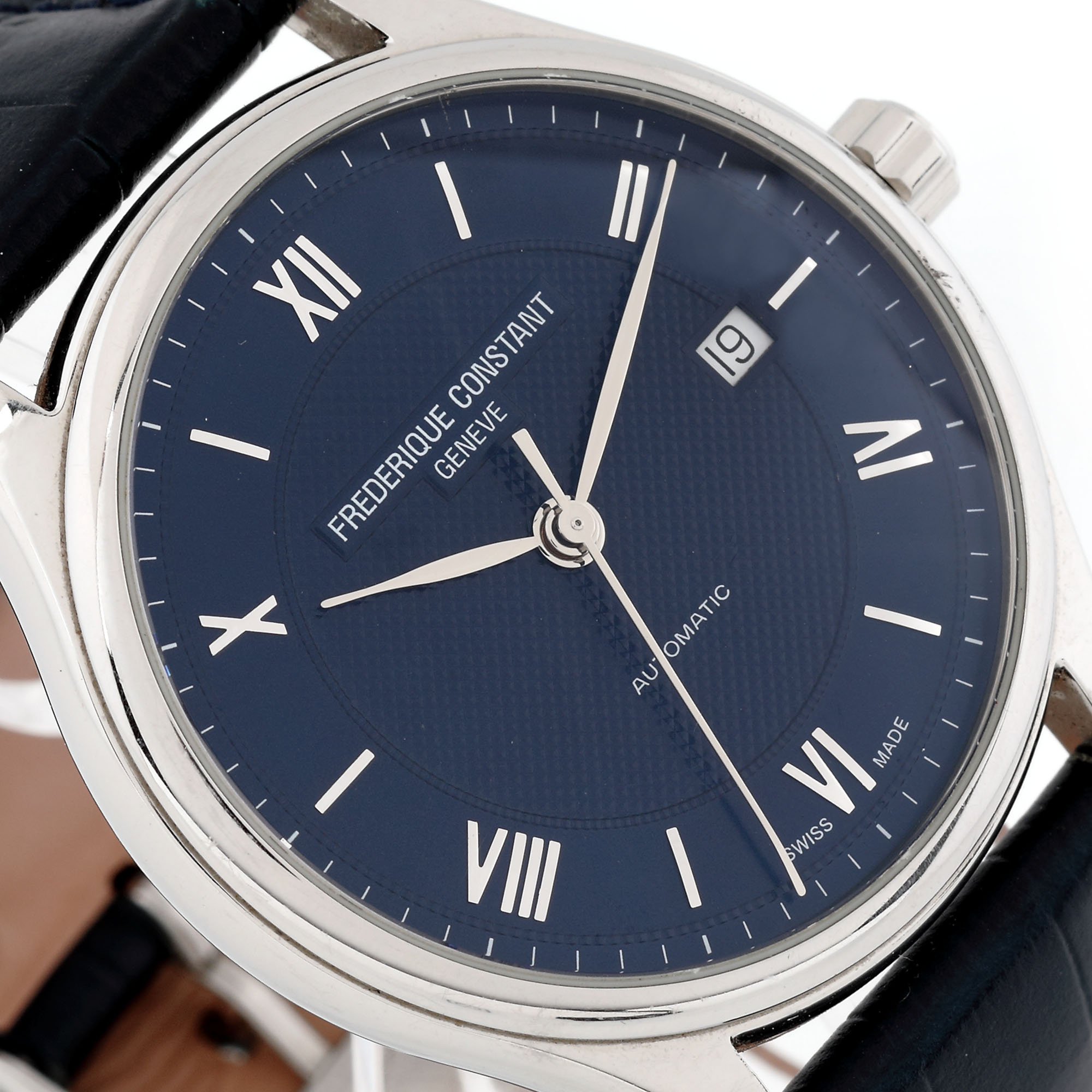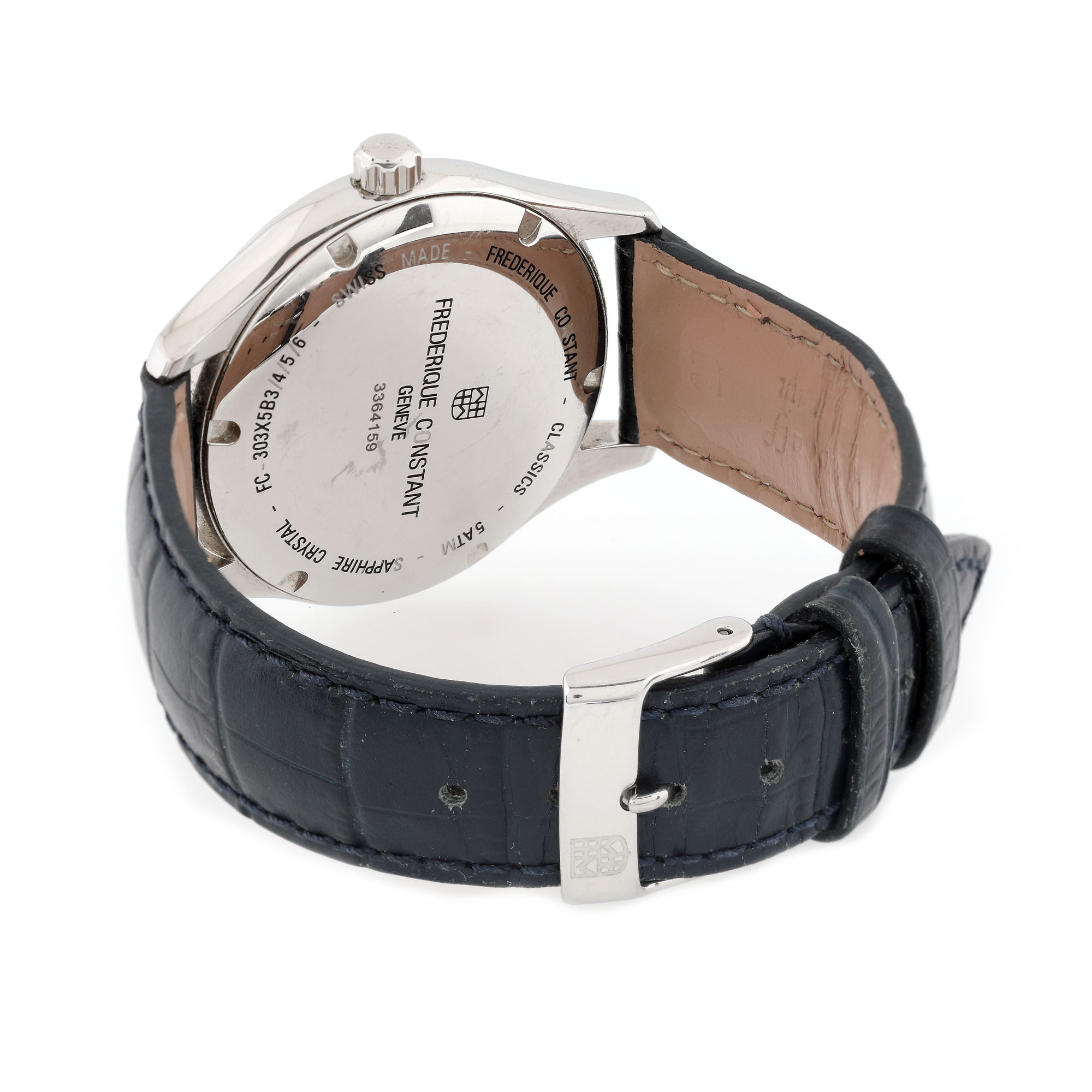 Ceas Frederique Constant Classic Round Analog, de mână, barbatesc, referință FC-303MN5B6, mecanism automatic, calibru FC-303. Cadran de culoare bleumarin, numerale romane și dată în dreptul orei 3. Curea din piele, de culoare bleumarin și cataramă din oțel inoxidabil, originale.