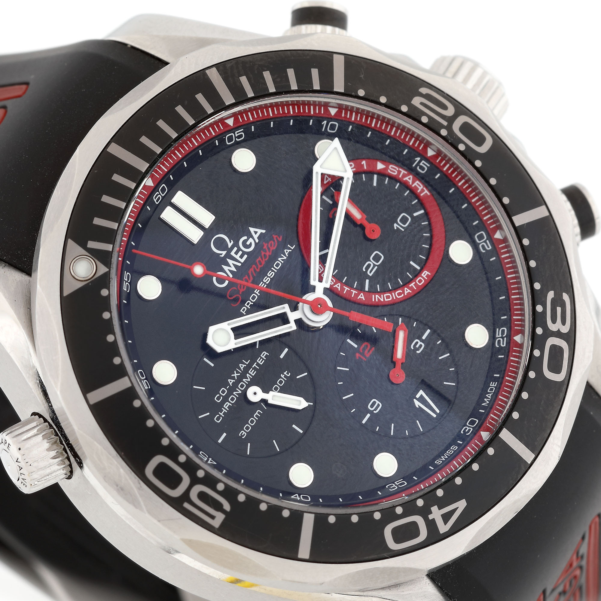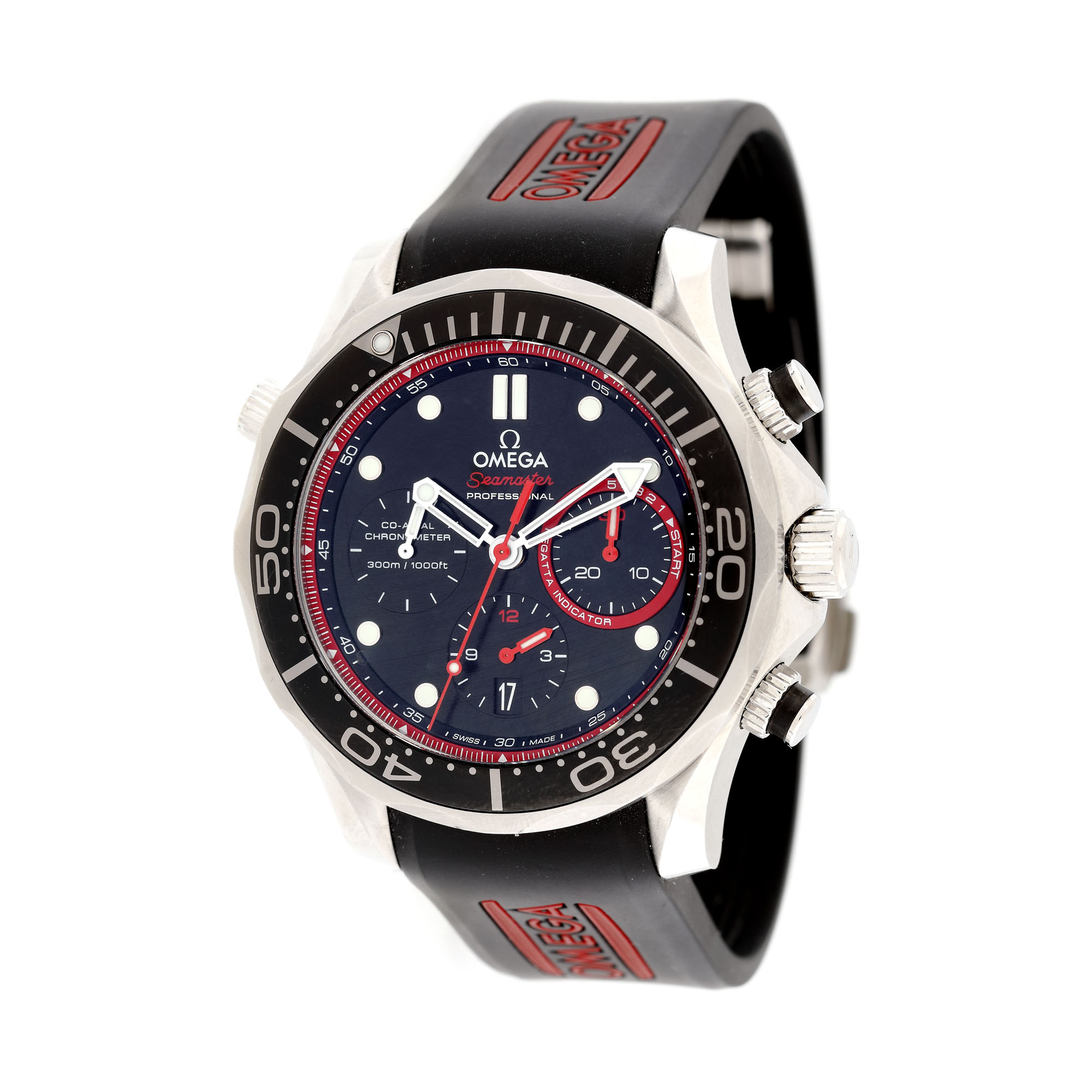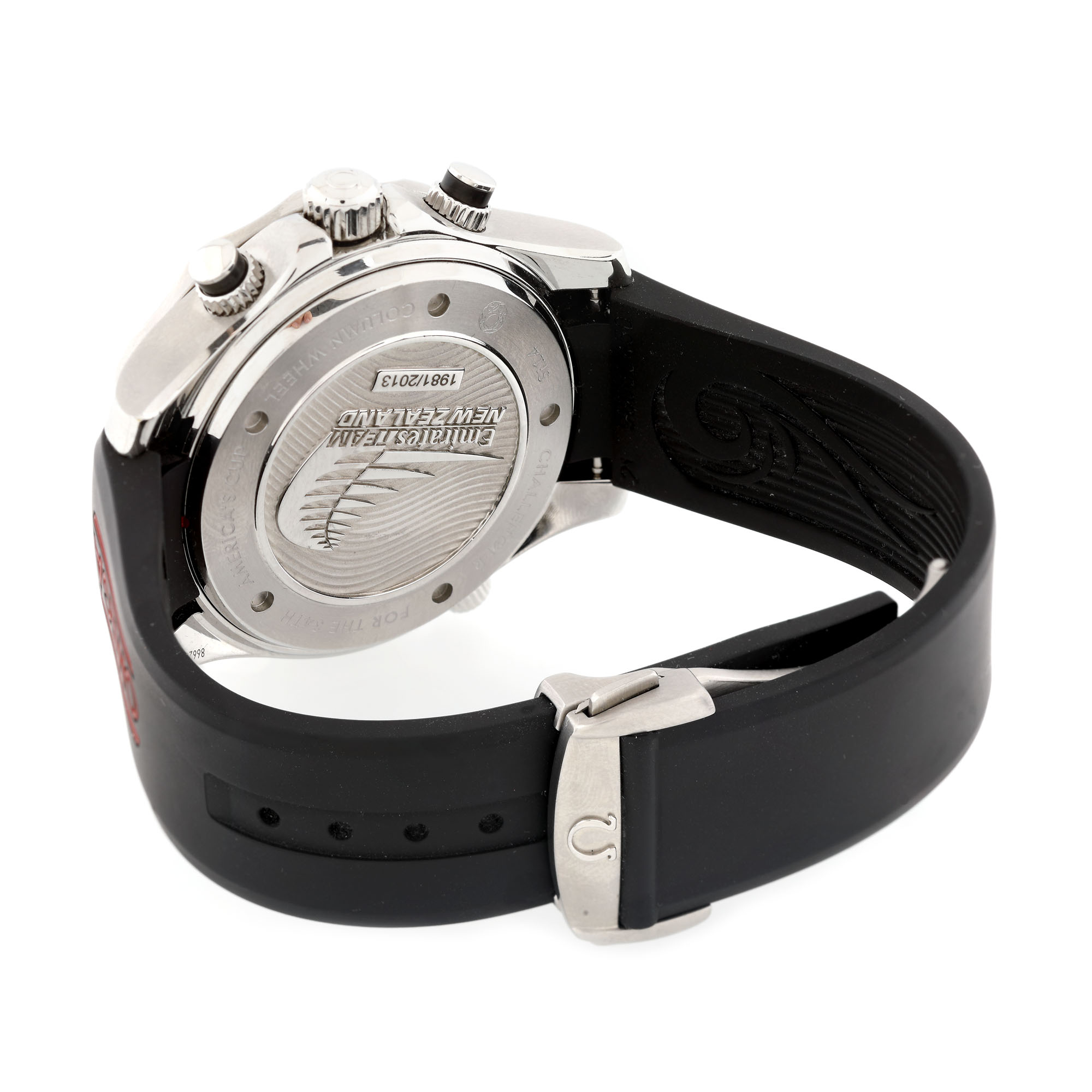 Ceas Omega Seamaster Diver, de mână, bărbătesc, referință 212.32.44.50.01.001, mecanism automatic, calibru Omega Co-Axial 3330, rezervă de timp 52 h. Ediție limitată făcută în parteneriat cu Emirates Team New Zealand (ETNZ), numărul 1981/2013. Cadran de culoare negru, cu indecși orari luminiscenți, trei registre în dreptul orelor 3, 6 și 9. Bezel rotativ, unidirecțional. Curea din cauciuc de culoare neagră și cataramă tip deployant, originale.