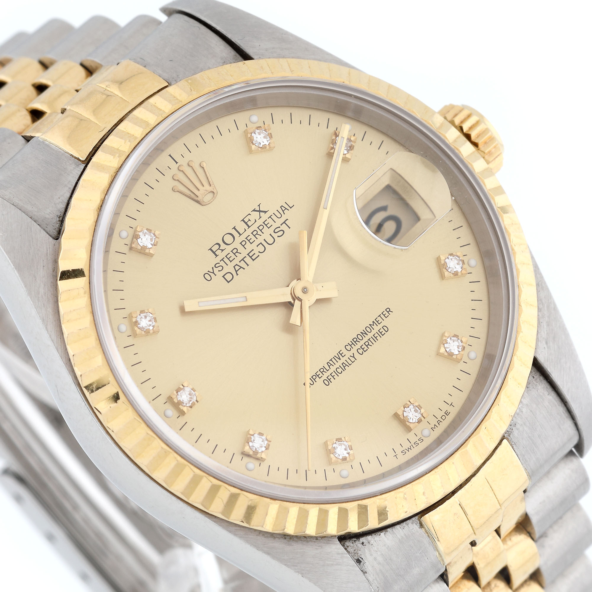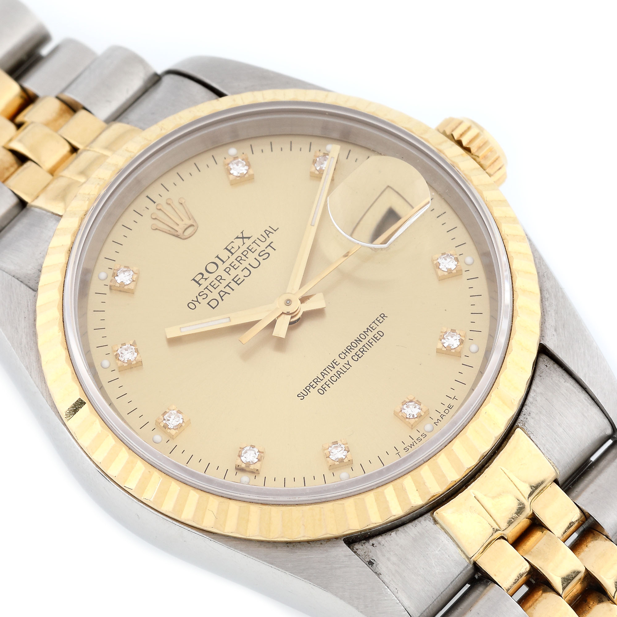 Ceas Rolex Oyster Perpetual Lady-Datejust, din aur 18k și oțel, de mână, de damă, cu referința 16233, mecanism automatic. Cadranul de culoare aurie, prezintă diamante în locul orelor și dată cu lupă în dreptul orei 3. Brățară din aur 18k și oțel și sistem de închidere tip deployant din oțel, originale.