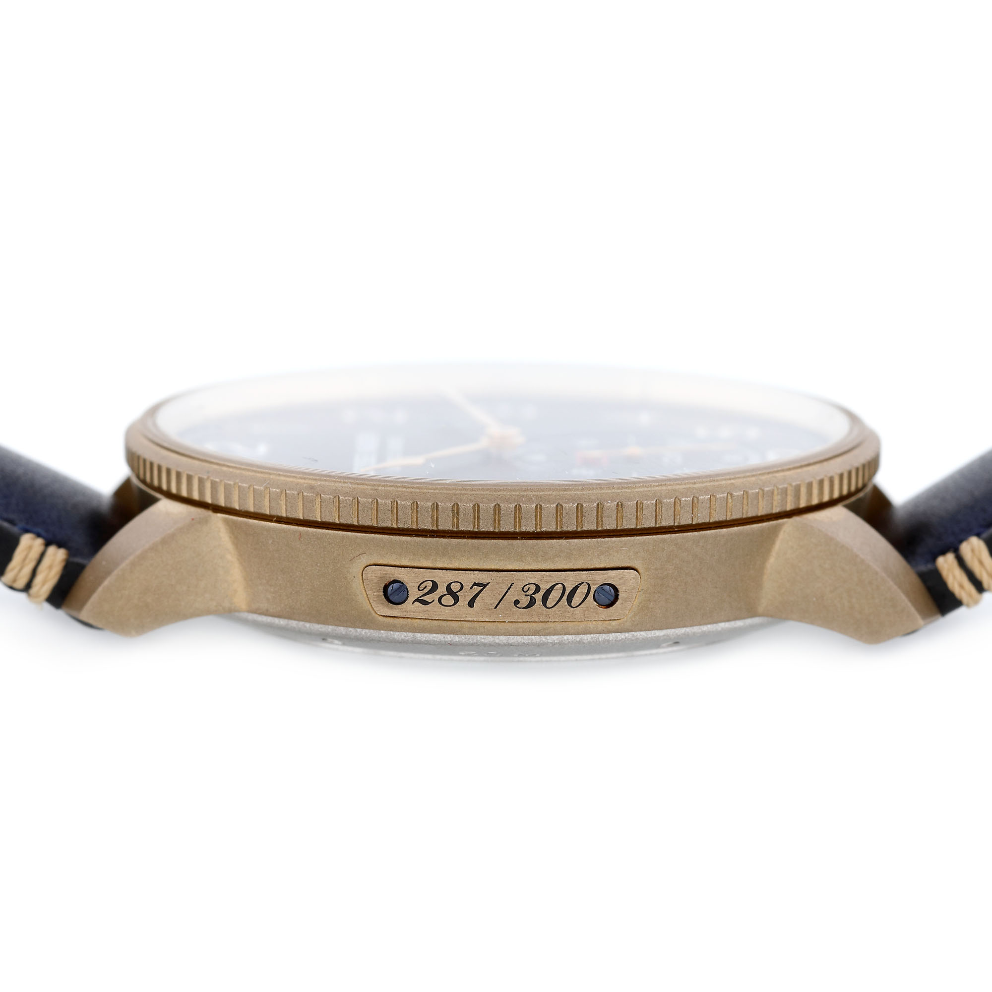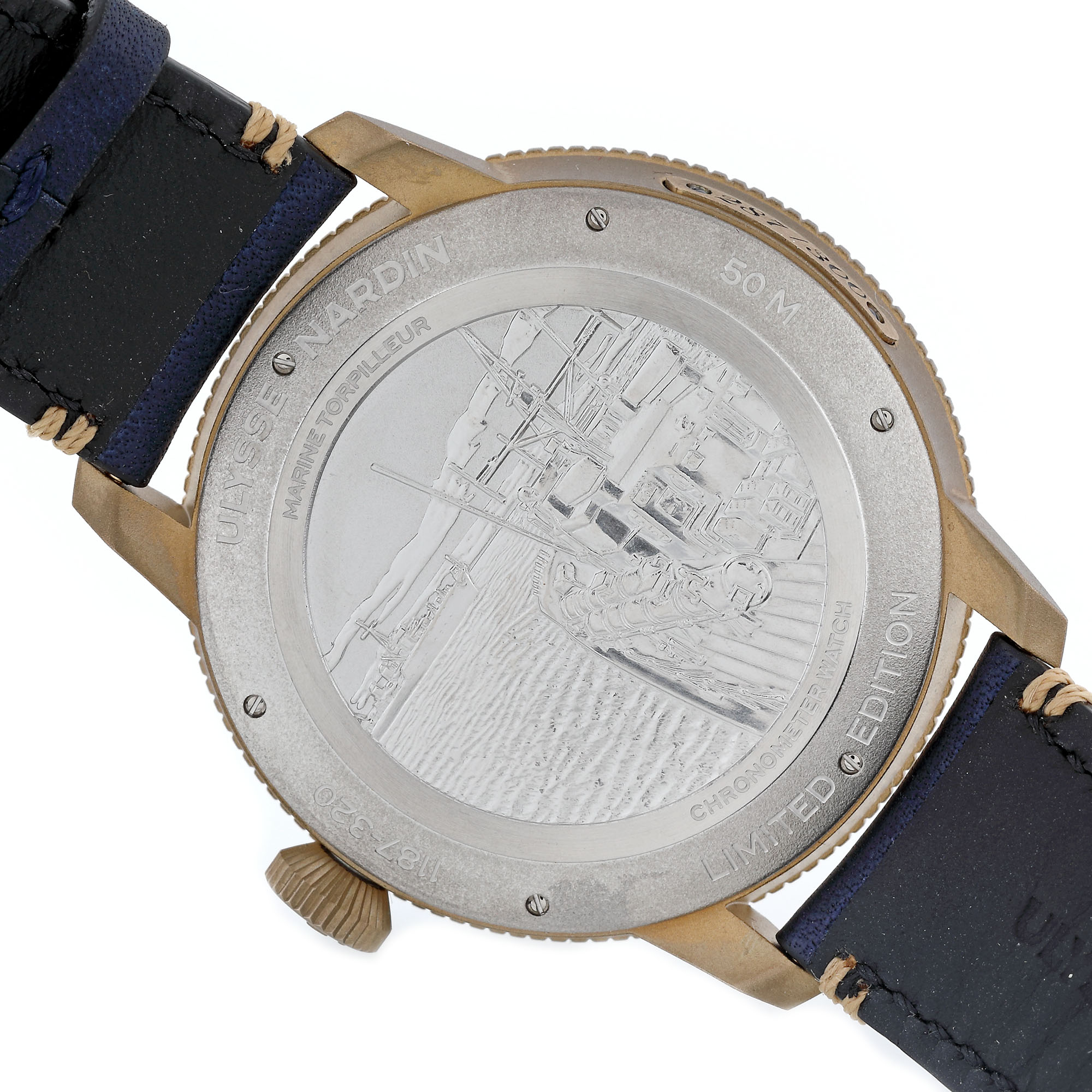Ceas Ulysse Nardin Marine Torpilleur, din bronz, de mână, bărbătesc, referința 1187-320, mecanism automatic, calibru UN-118, rezervă de timp de 60 h. Ediție limitată, numărul 287/300. Cadran de culoare bleumarin, cu numere arabe și registru pentru cronometru în dreptul orei 6. Curea din piele de vițel de culoare bleumarin și cataramă din bronz, originale. Accesorii: portcard din piele, card internațional de garanție semnat Ulysse Nardin, nedatat.