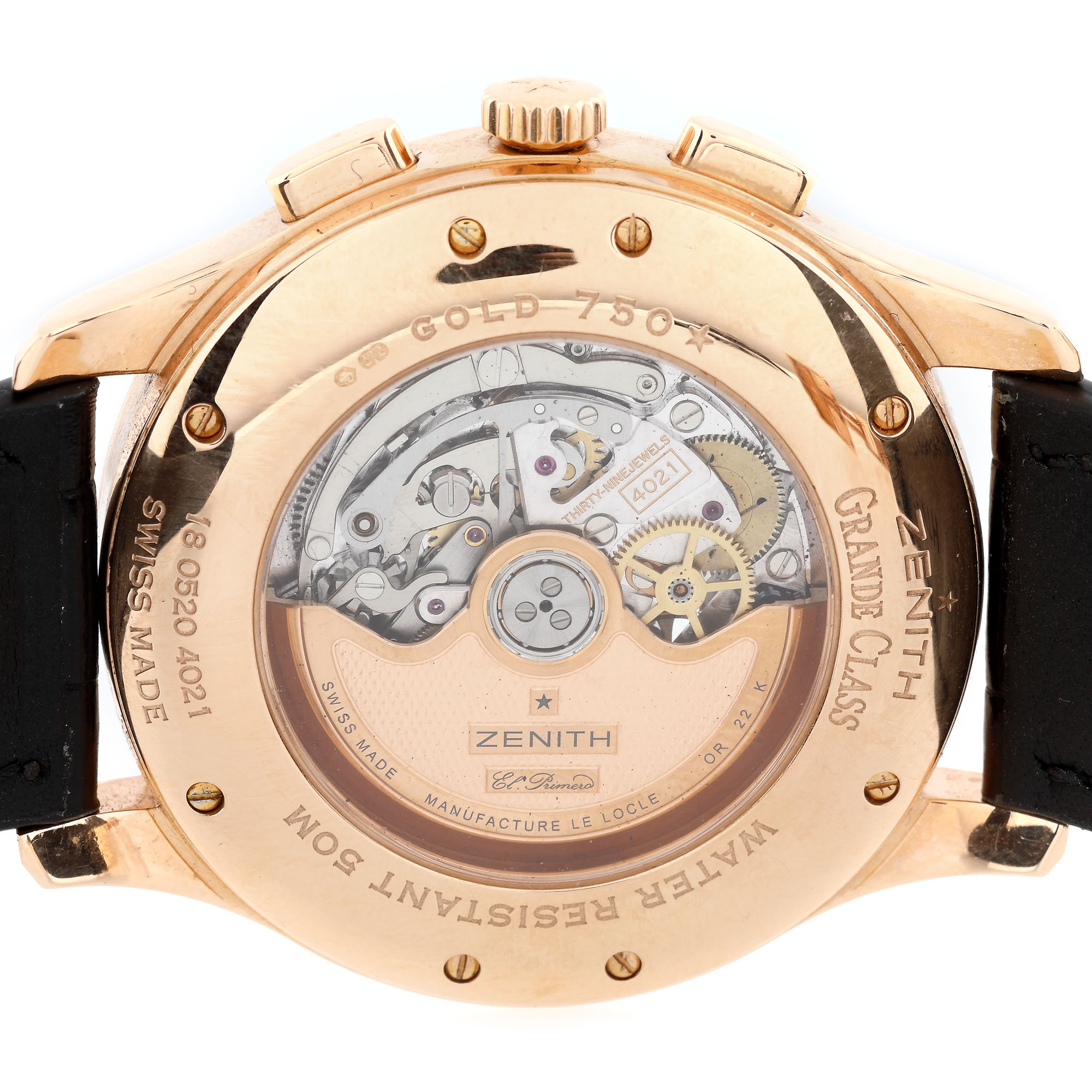 Ceas Zenith El Primero Grande Class, din aur roz 18k, de mână, unisex, referință 18 0520 4021, mecanism automatic, anterior vitrat, rezervă de timp 50 h. Cadran de culoare albă, cu numerale arabe din aur roz și 2 registre. Curea din piele, de culoare neagră și sitem de închidere tip deployant, din aur roz.