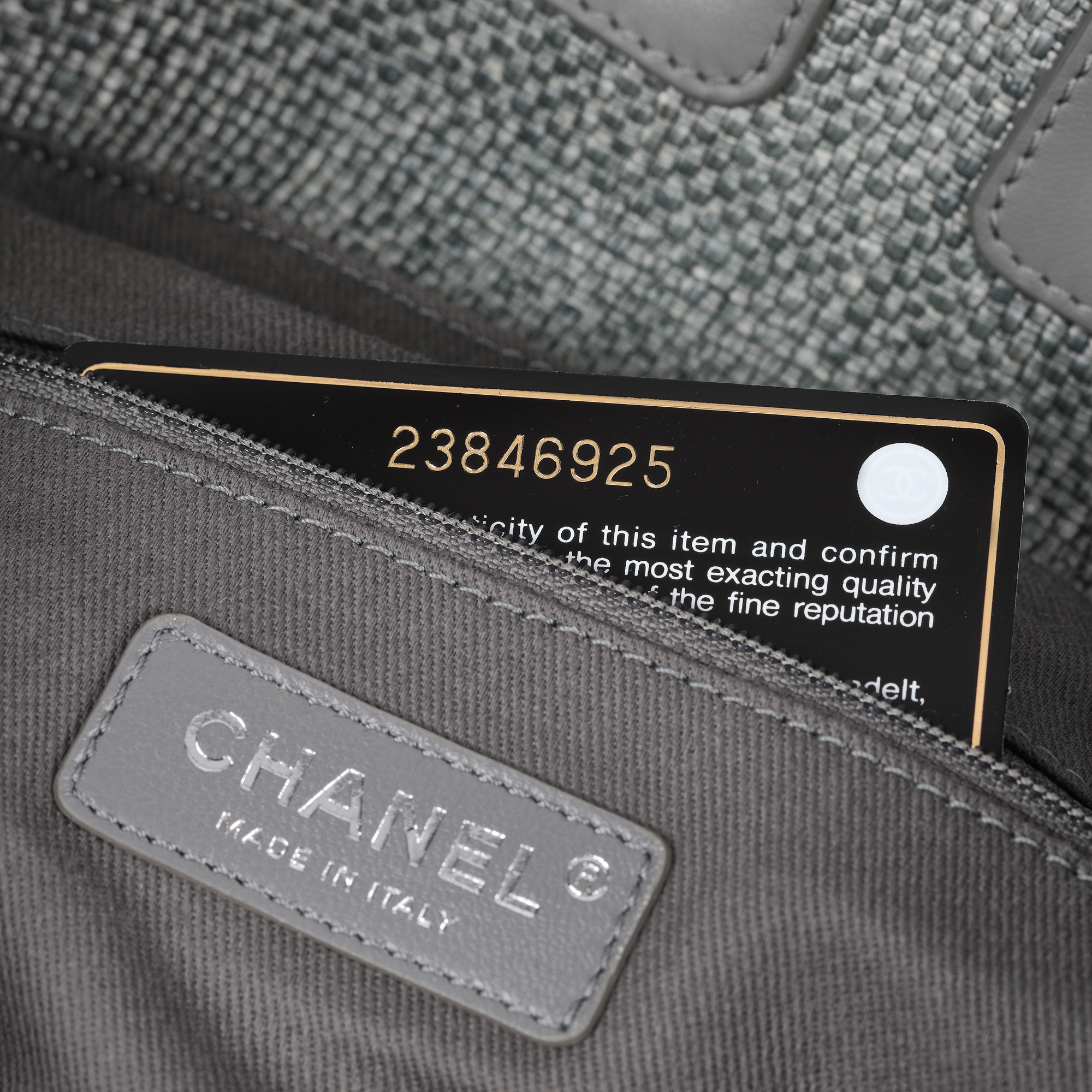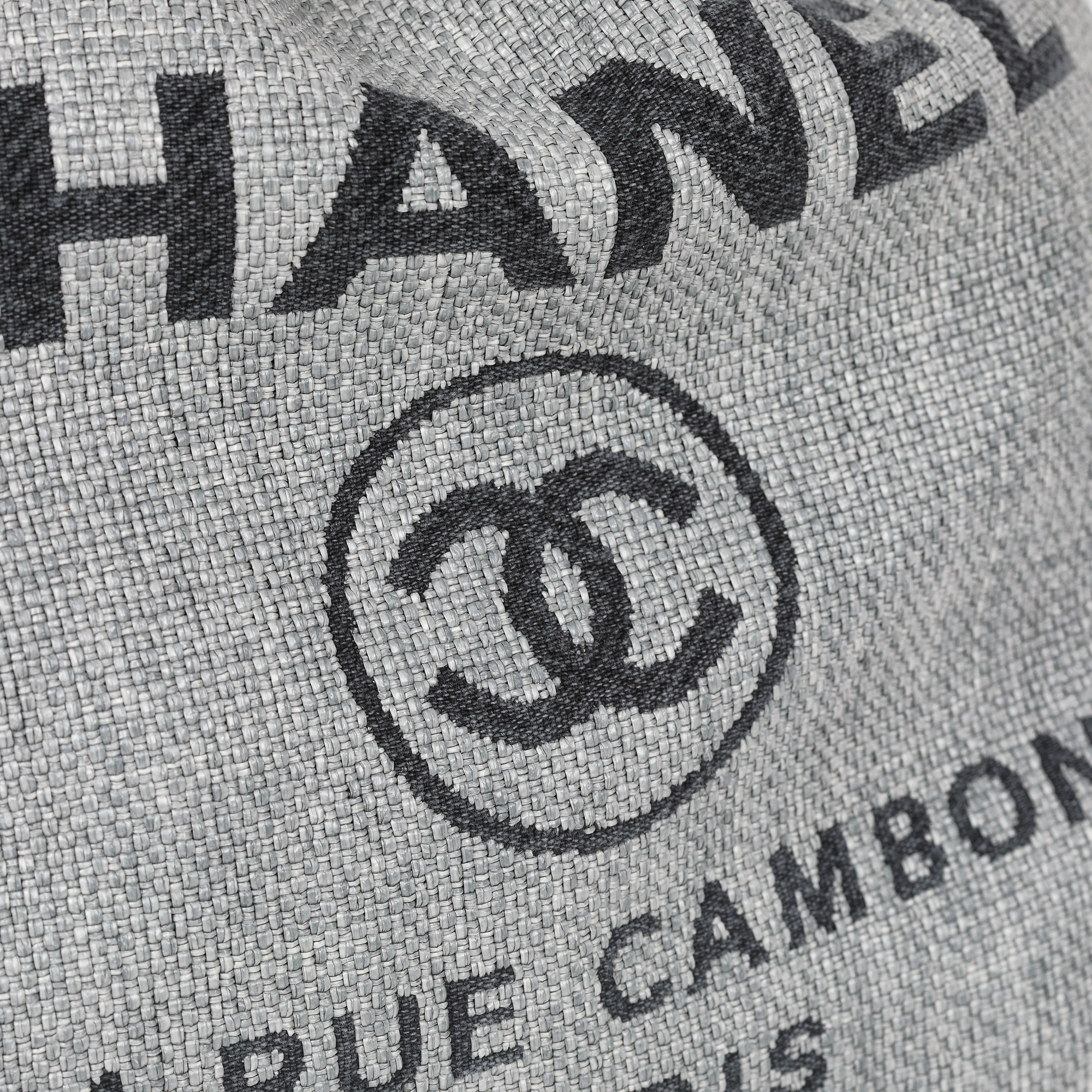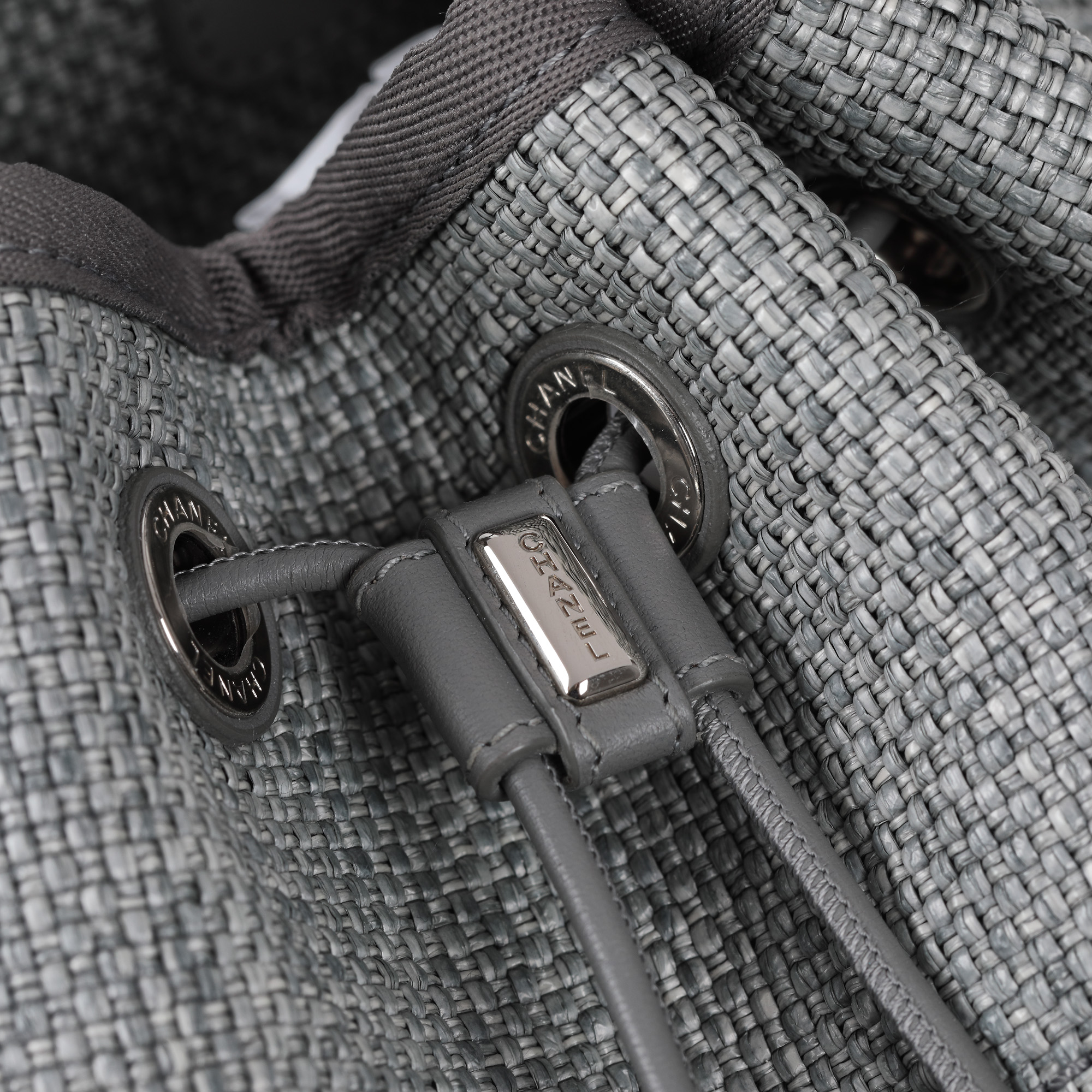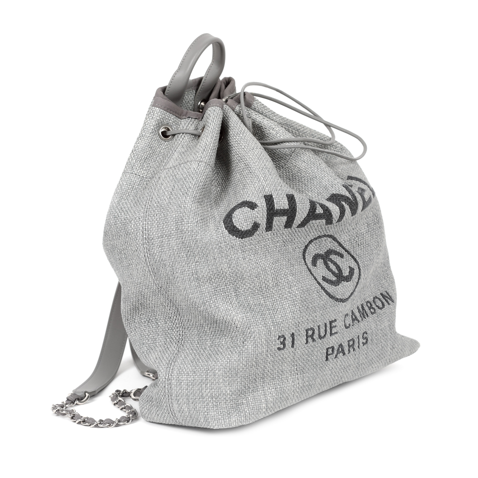 34. ”Deauville Backpack” - rucsac Chanel, din rafie, de culoare gri, însoțit de card de autenticitate și husă originală [2018]