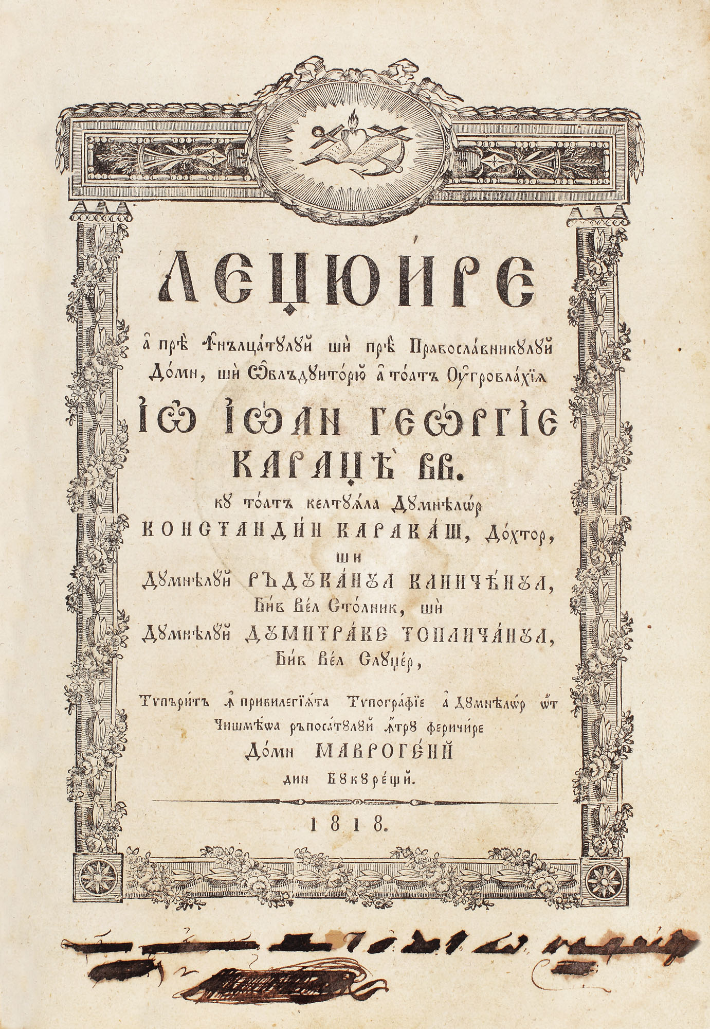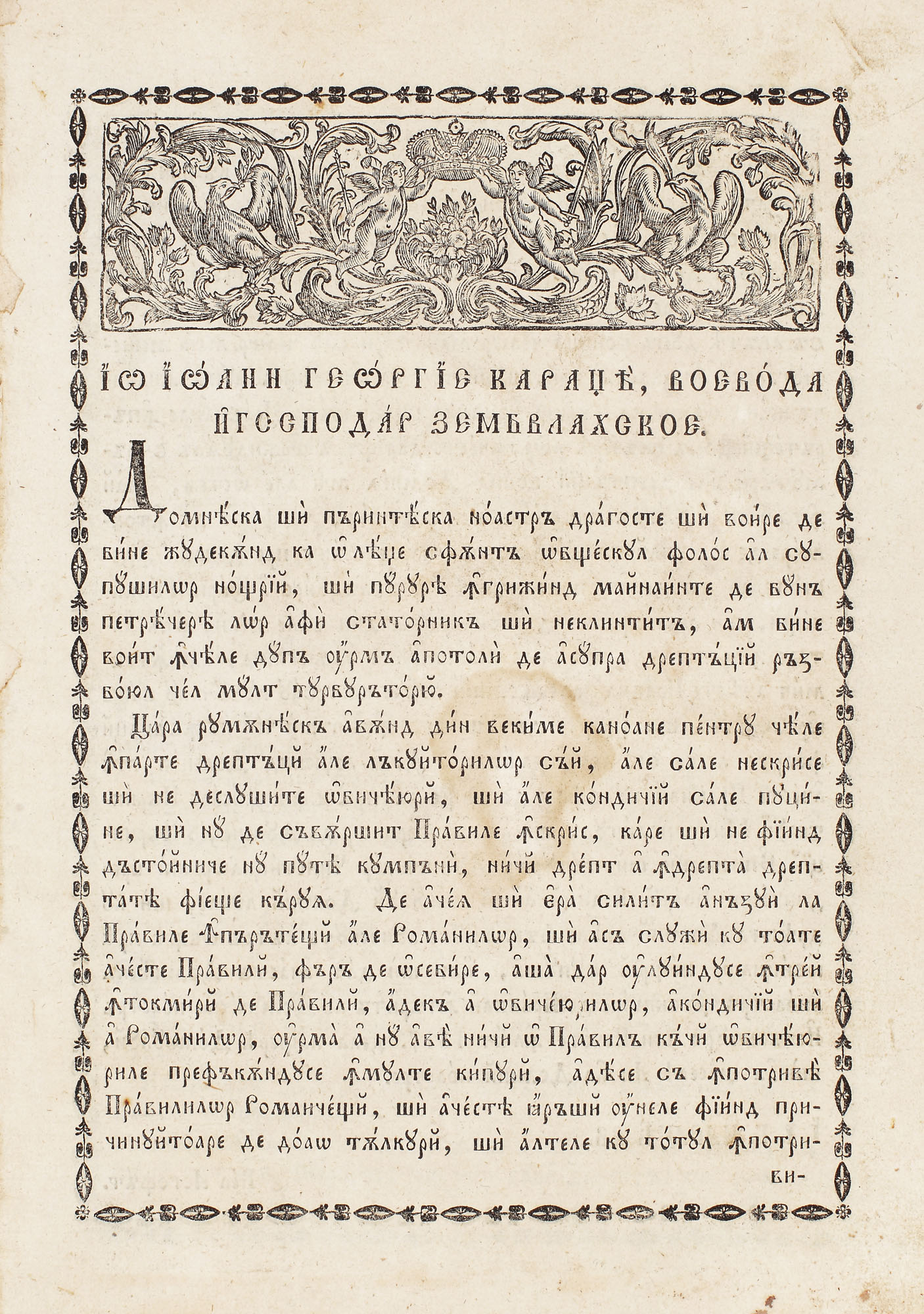 "Legiuire a prea înălţatului şi prea Pravoslavnicului Domn şi Oblăduitoriu a toată Ungrovlahia Io Ioan Gheorghie Caragea VV. Cu toată cheltuiala Dumnealor Constantin Caracaş, dohtor şi Dumnealui Răducanul Clinceanul biv vel stolnic şi dumnealui Dumitrache Topliceanul biv vel sluger. - Bucureşti : Tipărită în privileghiata Tipografie a dumnealor ot Cişmeaoa răposatului întru fericire Domn Mavrogheni", 1818. - [2] f., 104 p.,[3] f. : frontisp., il.,grav.,vig. ; 32,5 cm. Volumul reprezintă primul cod de legi al Ţării Româneşti, date de domnitorul Ioan Gheorghe Caragea (1812-1818). La acest cod au lucrat "doi boeri cu ştiinţă şi praxisale pravilelor": Anastasie Hristopol şi Nestor Craiovescu. Izvoarele folosite sunt menţionate în decretul de promulgare, aceasta fiind "adunată din împărăteştile pravile şi din pravilniceasca condică şi din obiceiurile pământului ce s-au urmat până acum". Printre aspectele vieţii reglementate de acest cod fac parte omorul, împărţit în "cugetat" (sancţionat prin pedeapsa cu moartea) şi "necugetat", furtul, falsificarea etc. A fost aplicat până în 1865.