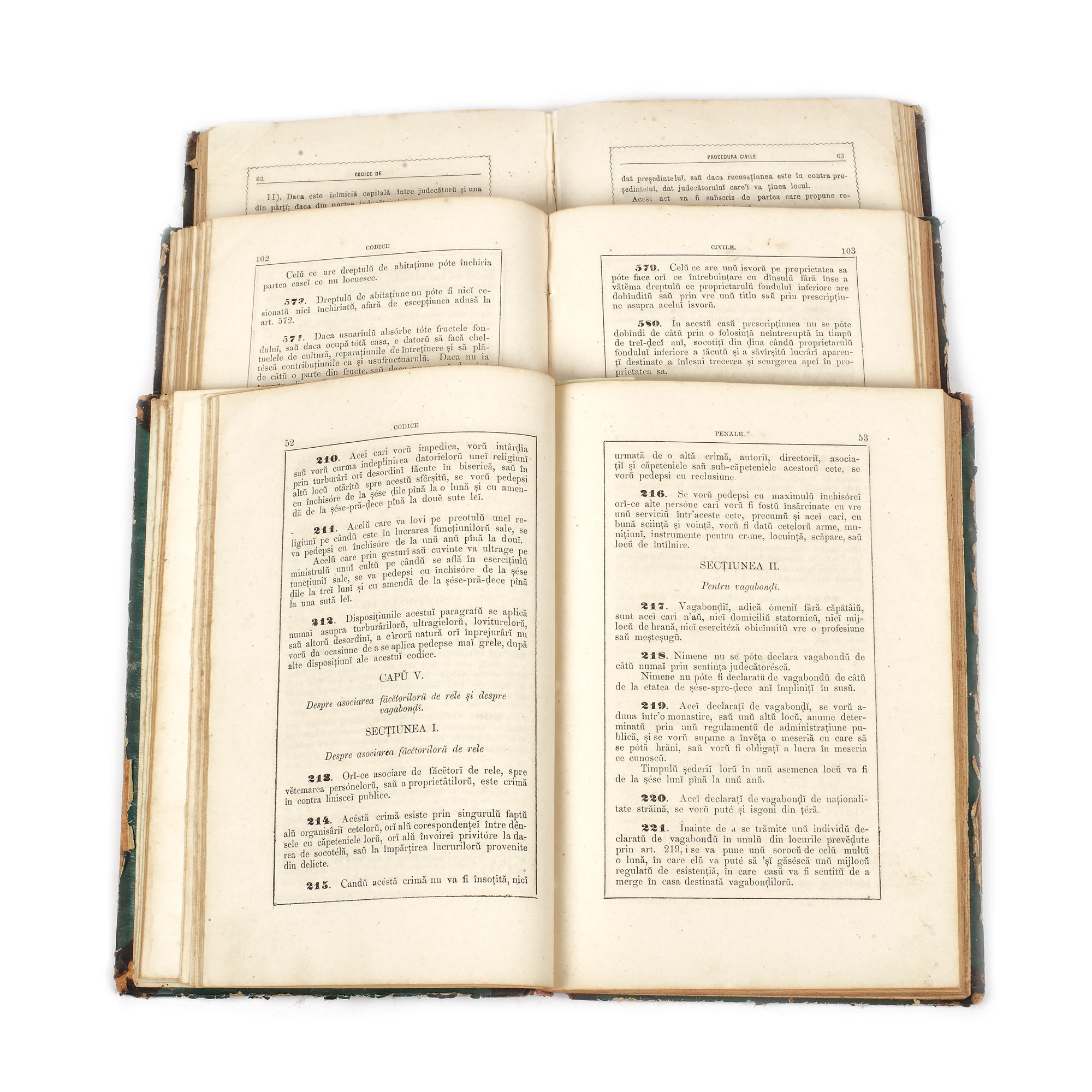 31. Lot format din trei volume cuprinzând "Codice civile", "Codice de procedura civile" şi "Codice penale si de procedura criminale", apărute cu aprobarea Domnitorului Alexandru Ioan I, Bucureşti, 1865