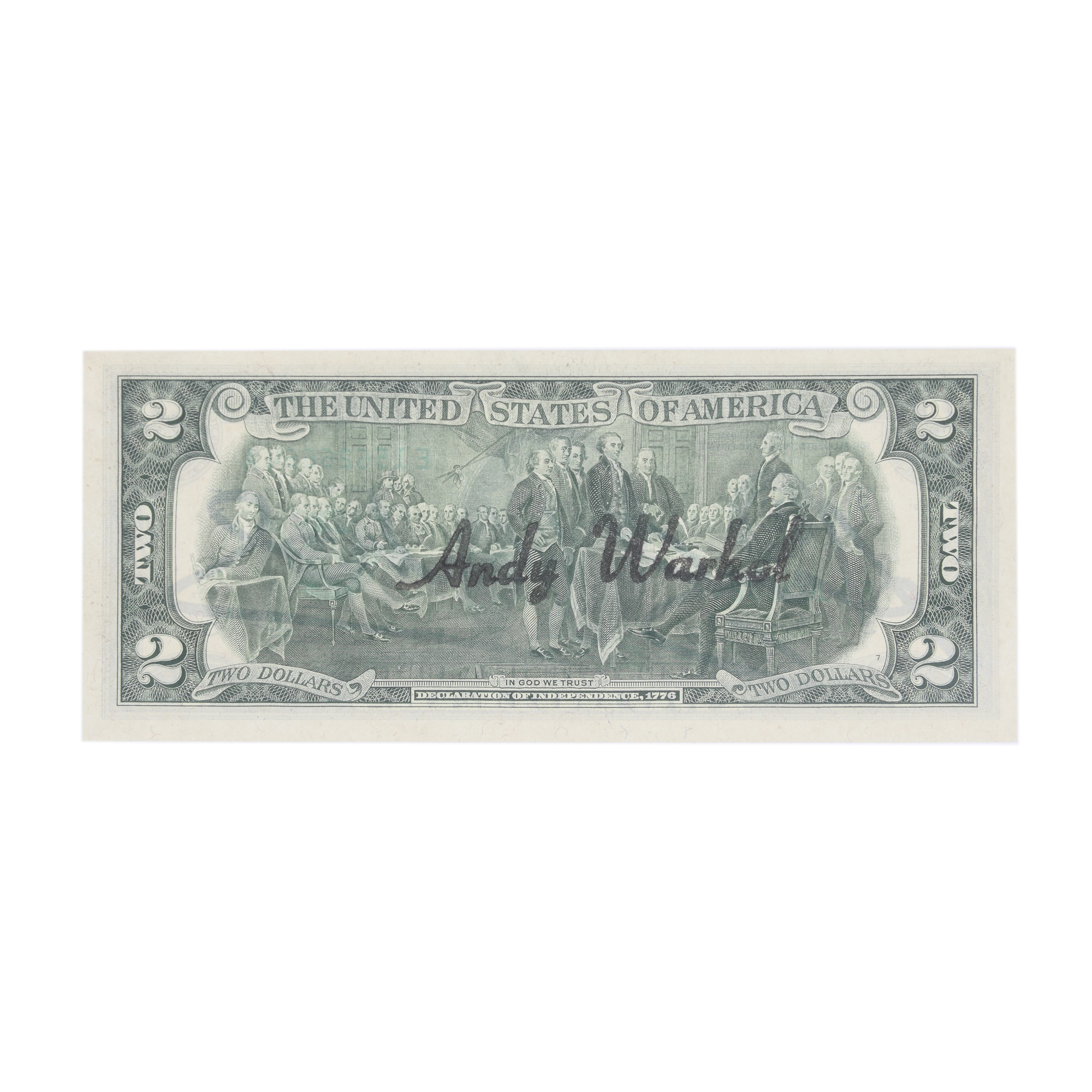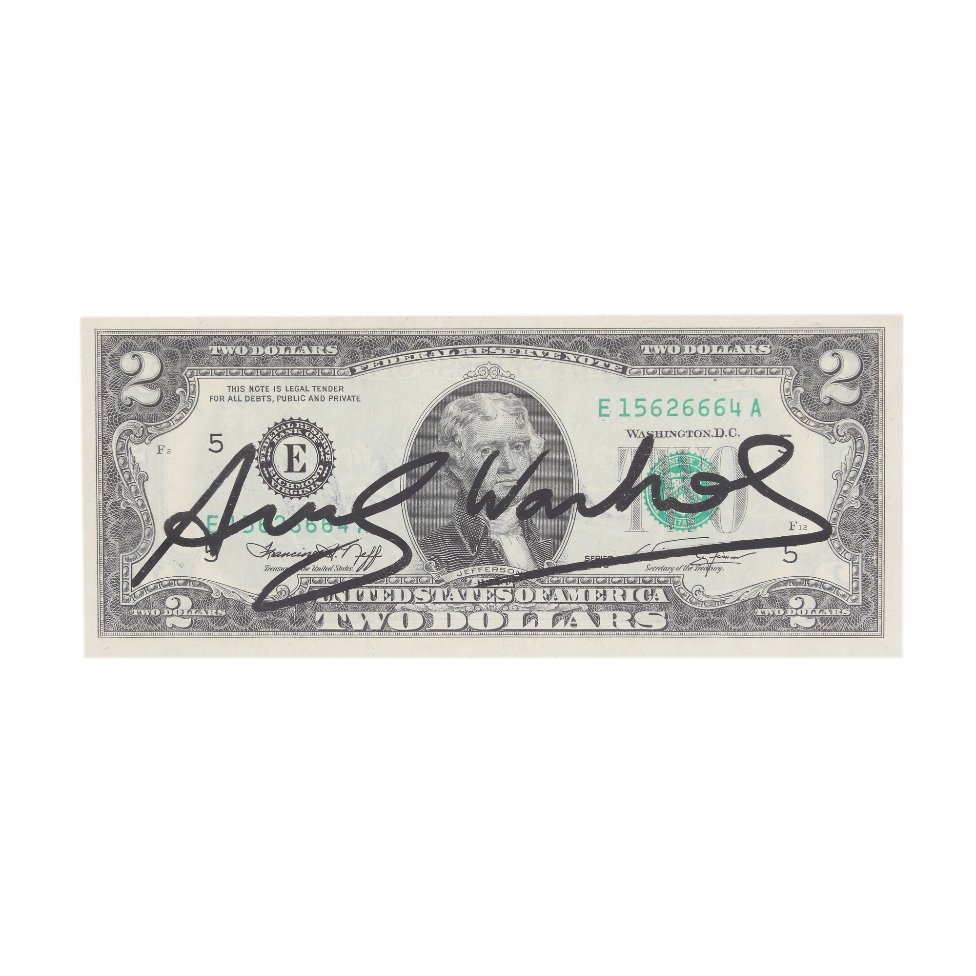 semnat central, cu negru, "Andy Warhol"; seria bancnotei E15626664A; ștampilat pe verso, cu negru, "Andy Warhol"