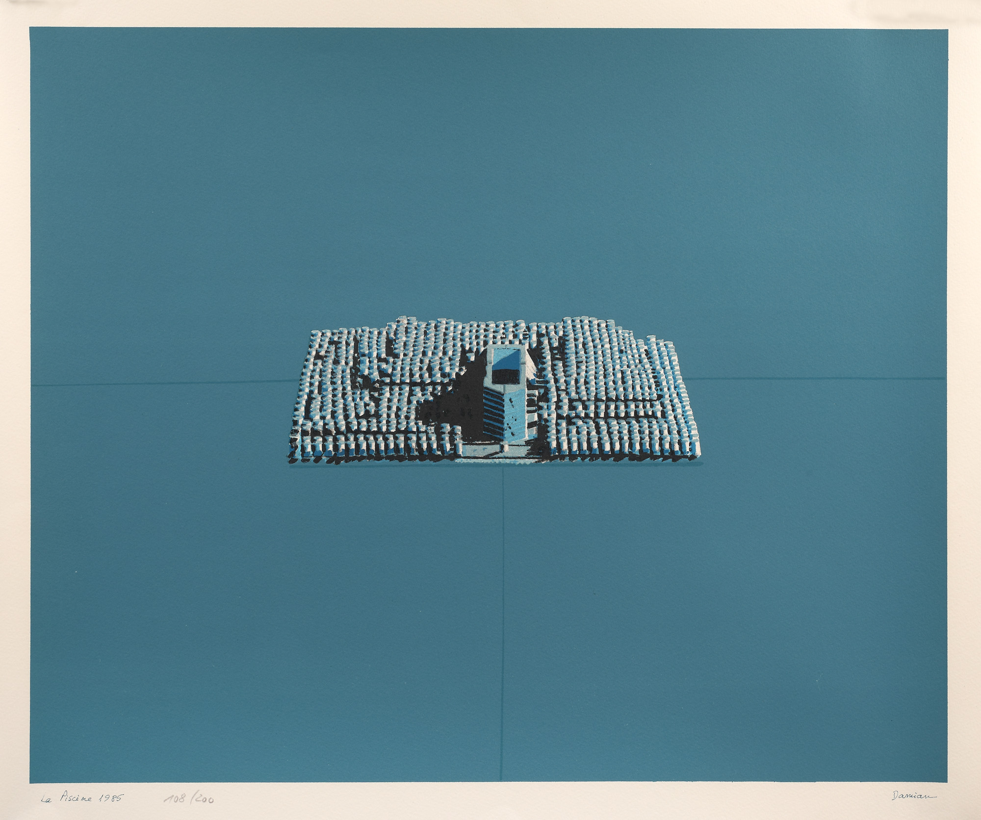 semnat dreapta jos, cu albastru, "Damian"; intitulat și datat stânga jos, cu albastru, "La piscine, 1985"; numerotat stânga jos, în creion, "108/200"