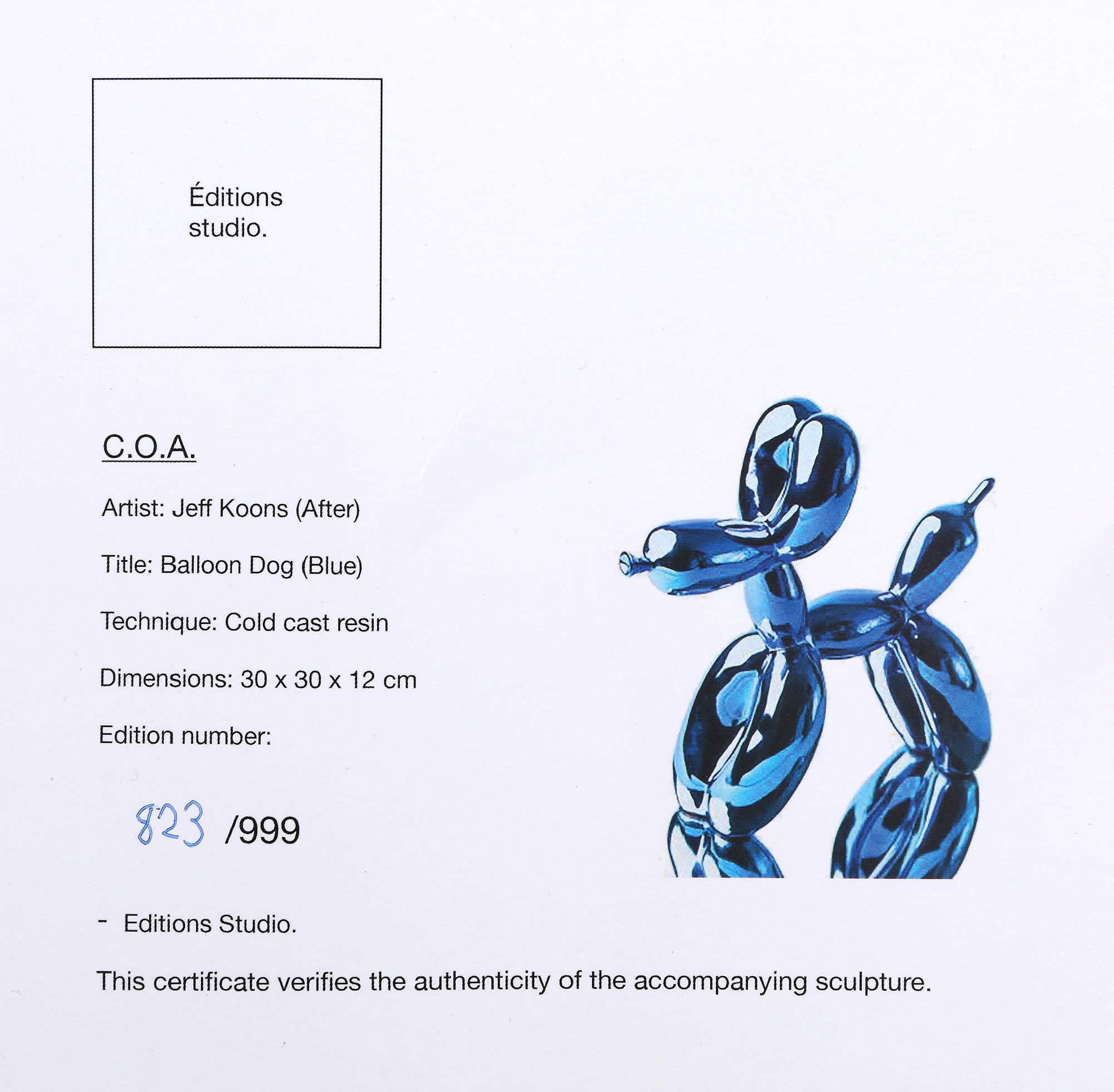 Editions Studio, ex. 823/ 999, însoțit de cutia originală și certificat de autenticitate emis de Editions Studio; numărul 823 inscripționat la baza lucrării