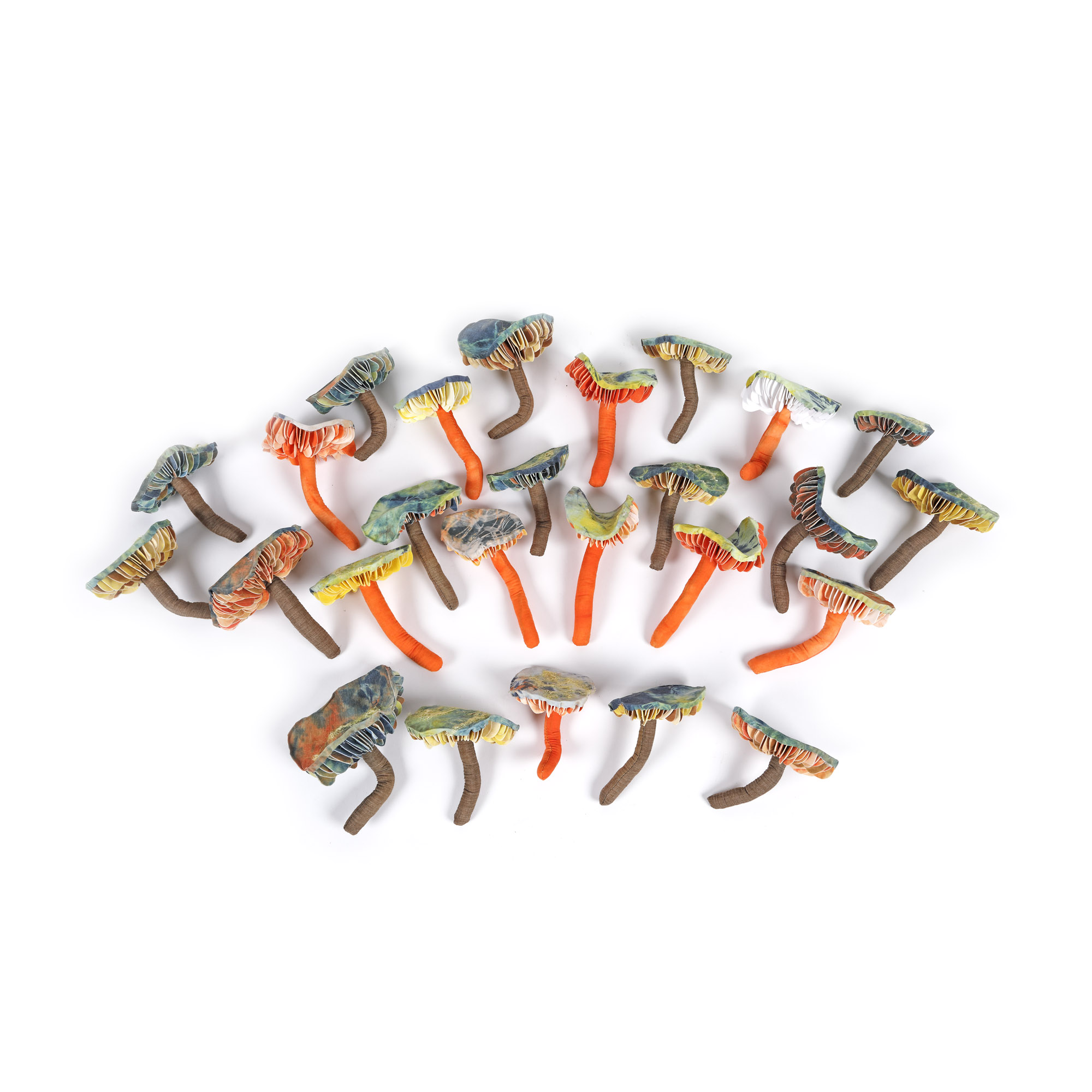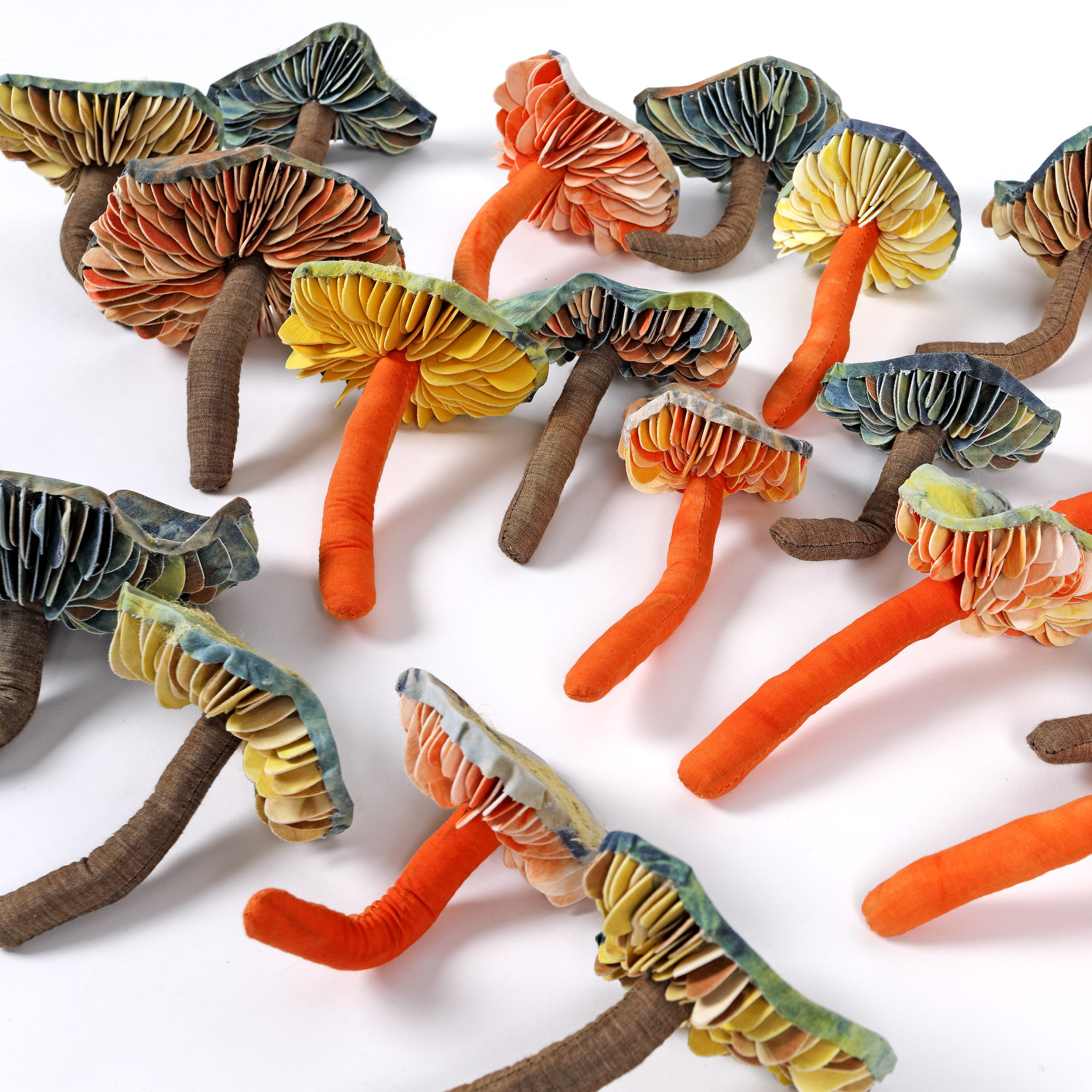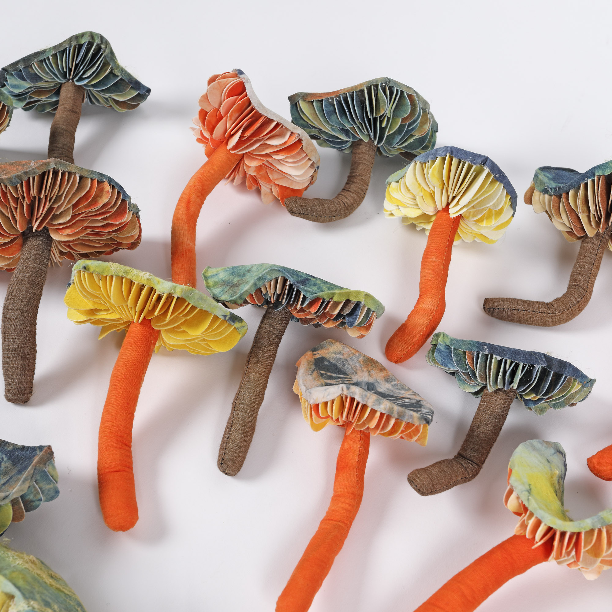 26 piese; tifon de bumbac, bumbac gros, sârmă, ață, vată, colorant textil natural, aracet, silicon, vopsirea tifonului de bumbac în tehnica shibori, papier-mâché și colaj textil