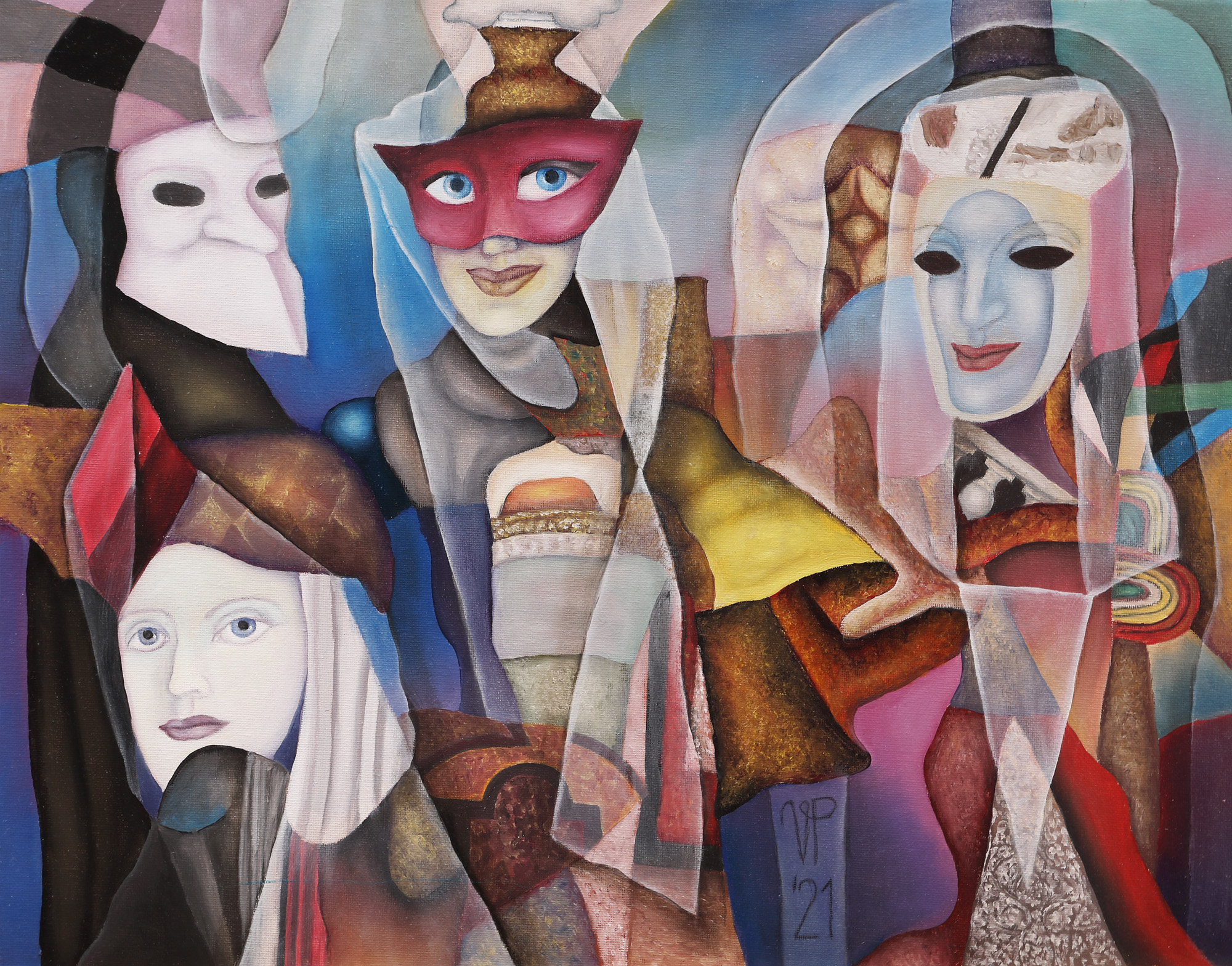 semnat și datat central jos, cu negru, "VP, (20)21"; semnat, datat, intitulat și localizat pe verso, cu negru, "Petre Velicu, Carnaval, 2021, Paris"