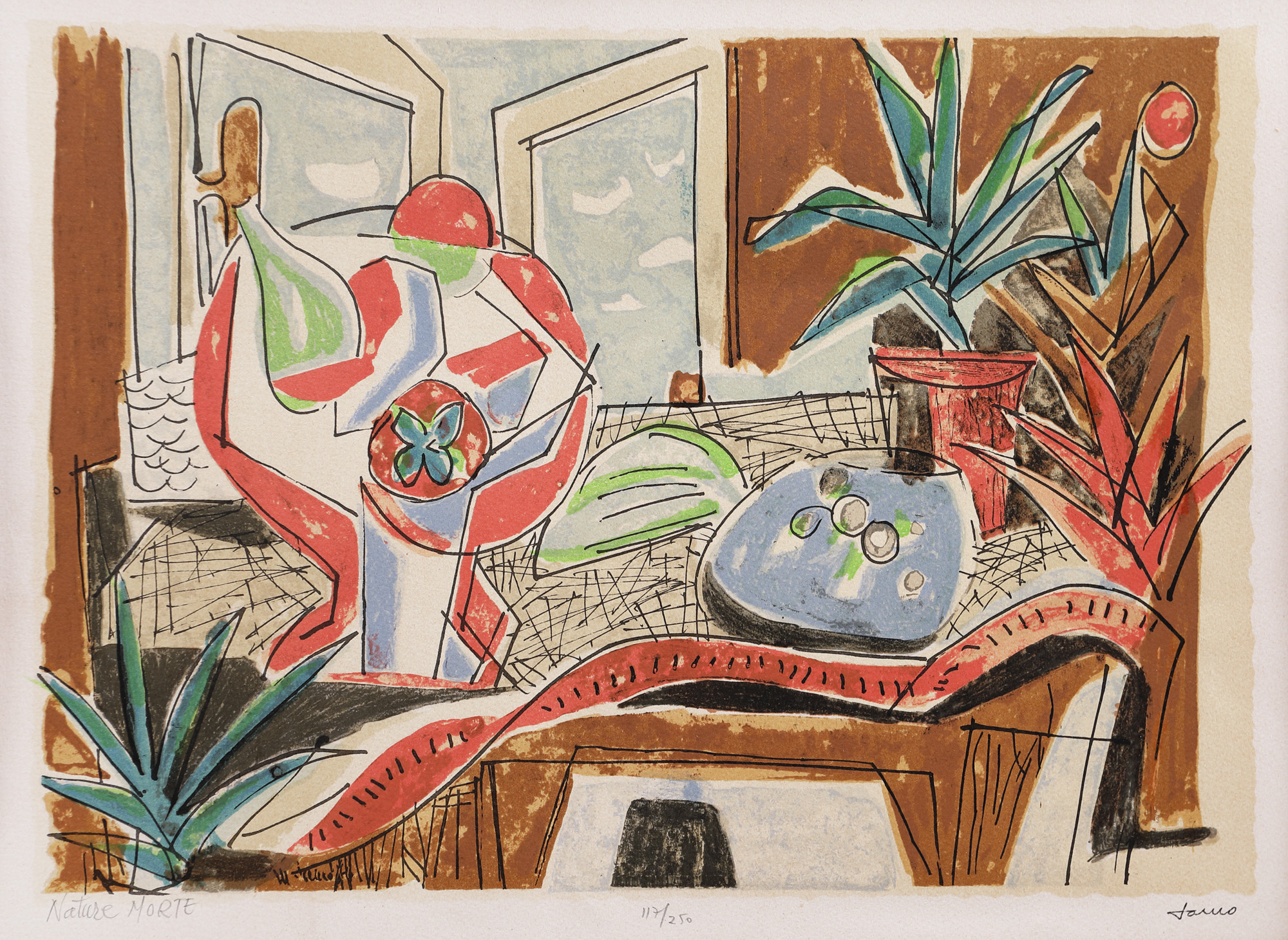 semnat dreapta jos, cu negru, "Janco"; numerotat central jos, în creion, "117/250"; intitulat stânga jos, în creion, "Nature morte"; dedicat pe verso, cu negru, "Pentru Voronca, de la familia D. Janco"