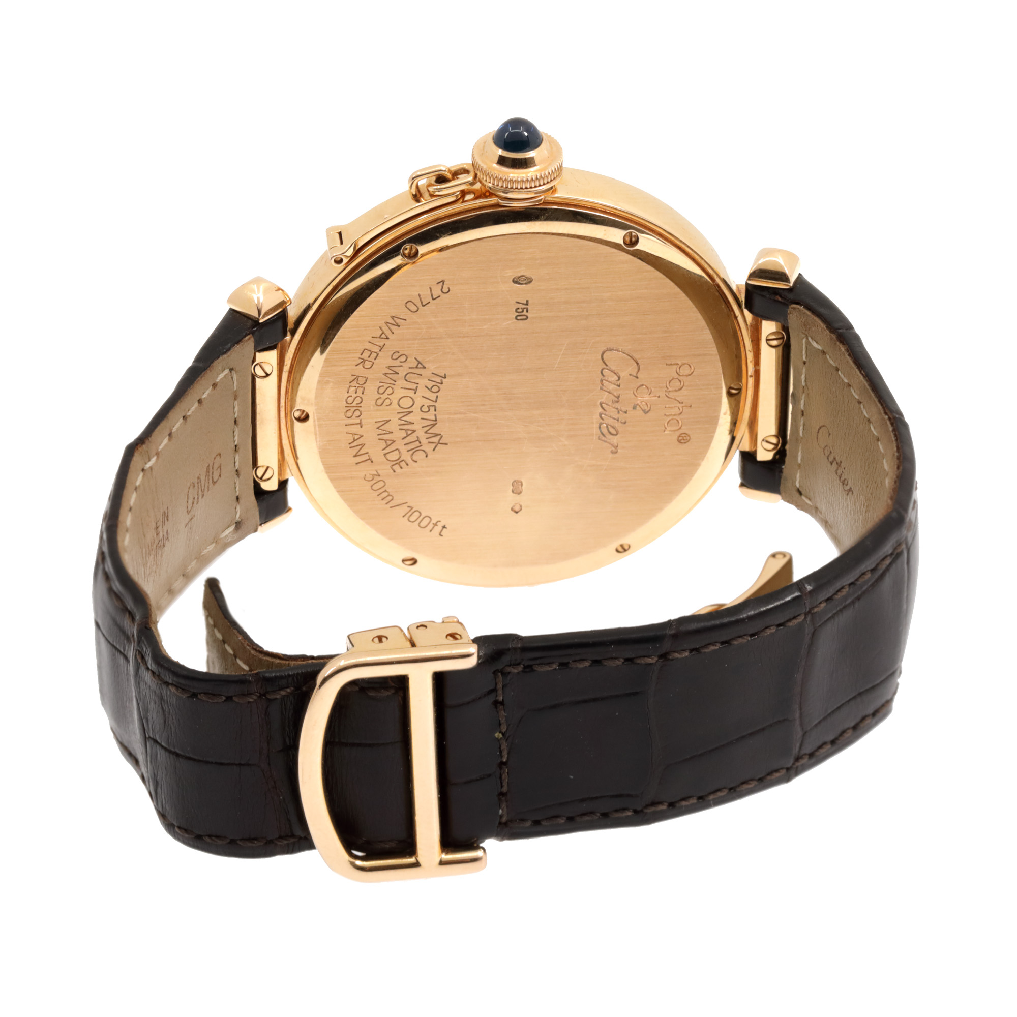 Ceas Cartier Pasha, din aur, de mână, bărbătesc, referință 2770. Mecanism automatic, calibrul 8000 MC. Cadran de culoare champagne, indici numerale arabe pentru orele 3, 6, 9 și 12. Curea originală, din piele de aligator, de culoare brun închis, cu sistem de închidere de tip deployant original din aur. Accesorii: cutia originală, certificat de garanție.