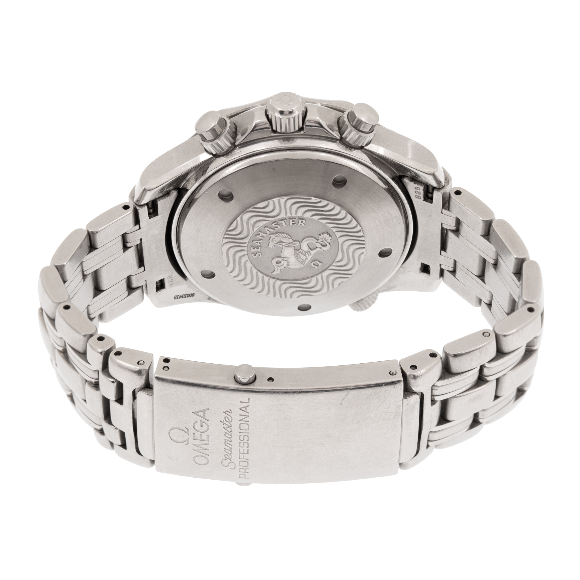 Ceas Omega Seamaster Professional Chronometer, de mână, bărbătesc. Mecanism automatic cu funcție de chronograph, bezel mobil unidirecțional. Cadran de culoare albastru, indici puncte și baghete luminiscente, registru pentru secundar în dreptul orei 9, două registre pentru chronograph în dreptul orelor 6 și 12 și un registru pentru dată în dreptul orei 3. Brățară originală, din oțel, cu sistem de închidere de tip deployant.