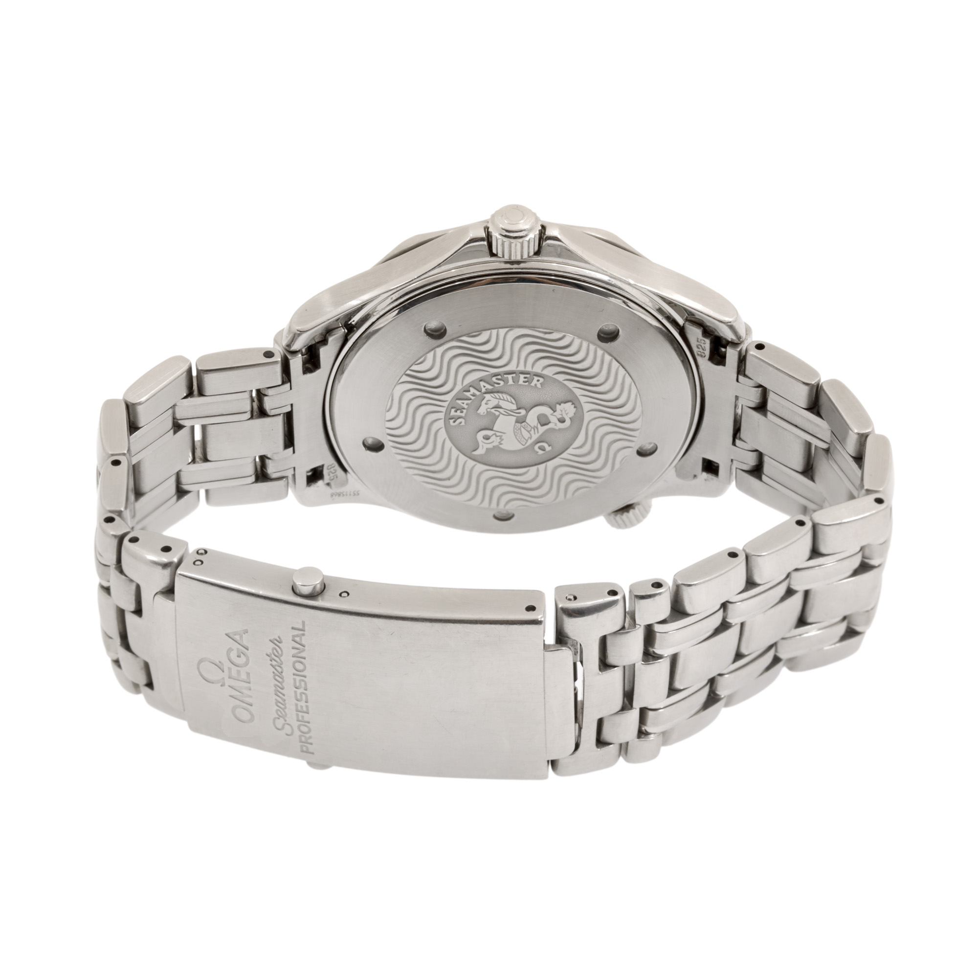 Ceas Omega Seamaster Professional, de mână, bărbătesc. Mecanism quartz, bezel mobil unidirecțional. Cadran de culoare albastru, indici puncte și baghete luminiscente, registru pentru dată în dreptul orei 3. Brățară originală, din oțel, cu sistem de închidere de tip deployant.
