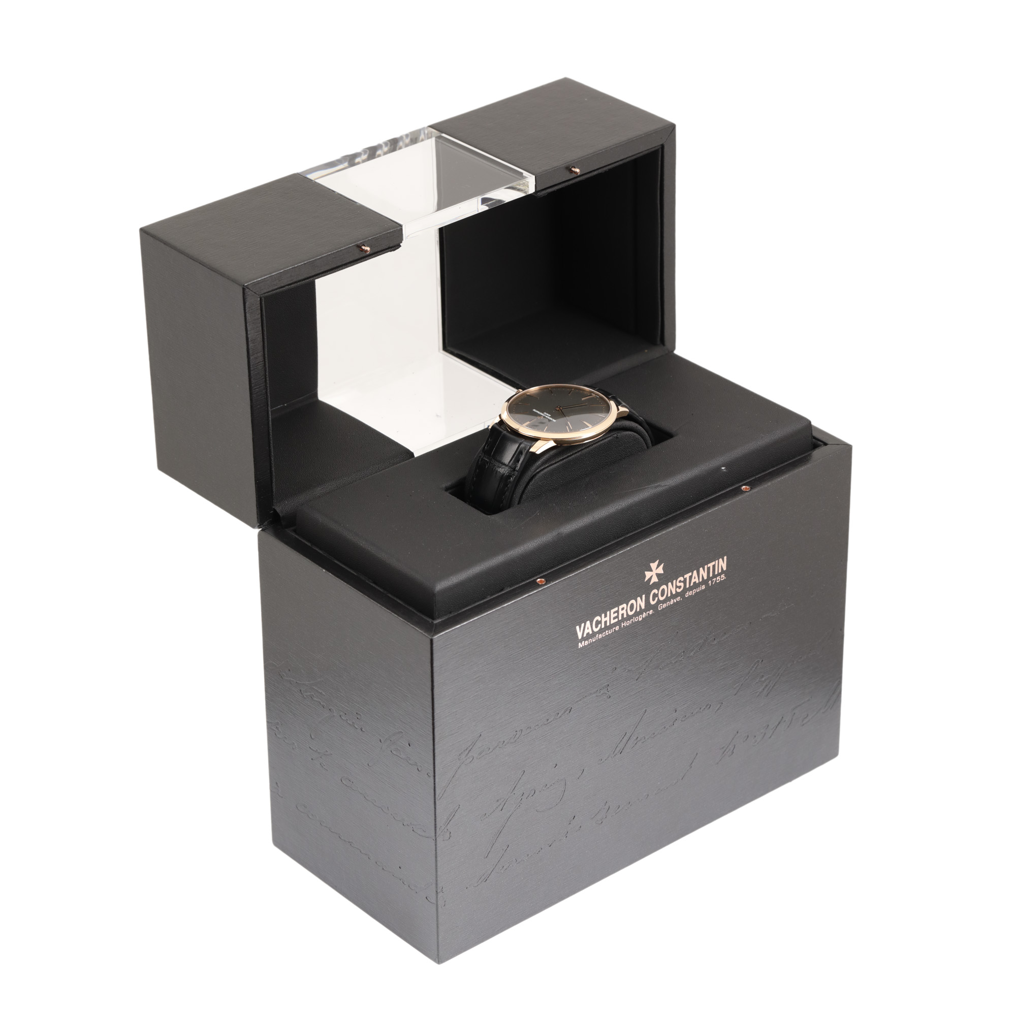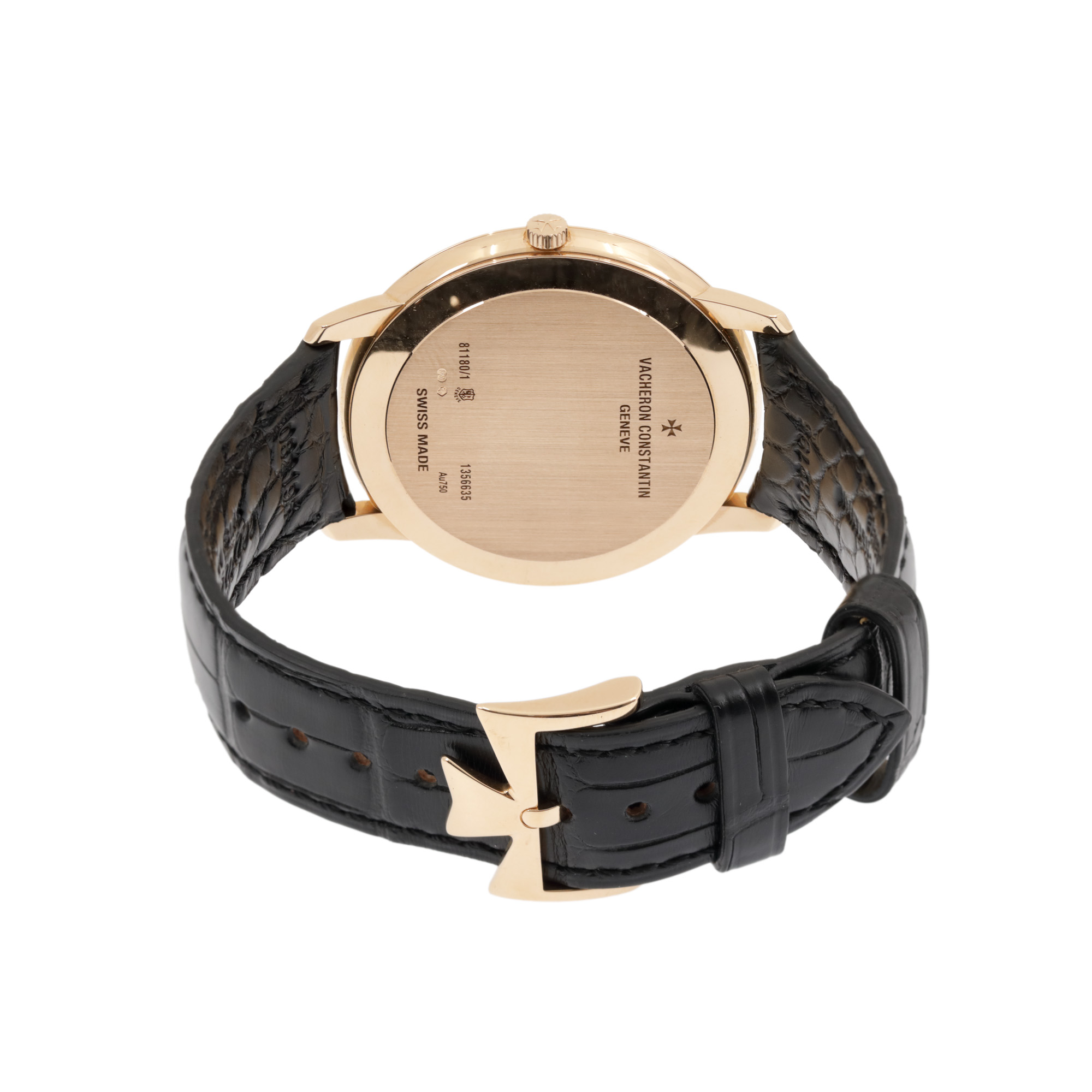 Ceas Vacheron Constantin Patrimony, din aur roz, de mână, bărbătesc, referință 81180/000R-9162. Mecanism cu armare manuală, calibrul 1400. Cadran de culoare fumuriu, indici baghetă. Curea originală, din piele. de culoare neagră, cu sistem de închidere de tip clasic. Accesorii: cutia originală, broșură și certificat de garanție.