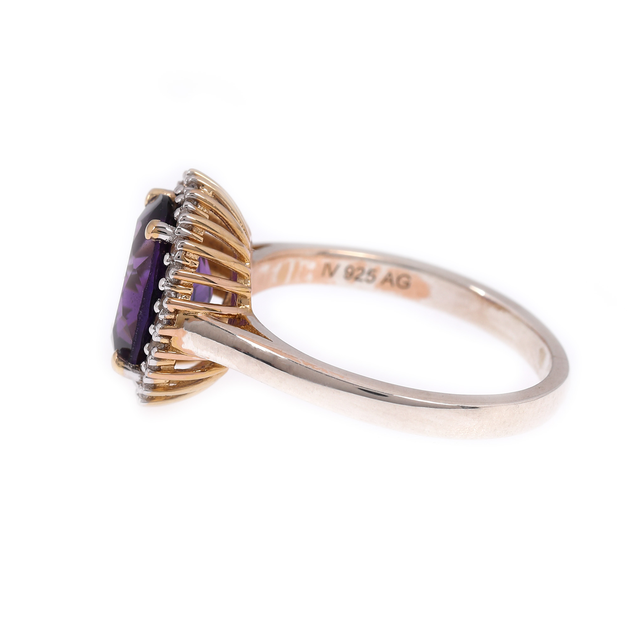 1 ametist oval fațetat, culoare violet, claritate SI, cca. 1,80 ct. și 24 topaze rotund fațetate, culoare alb, claritate eye-clean, cca. 0,18 ct.