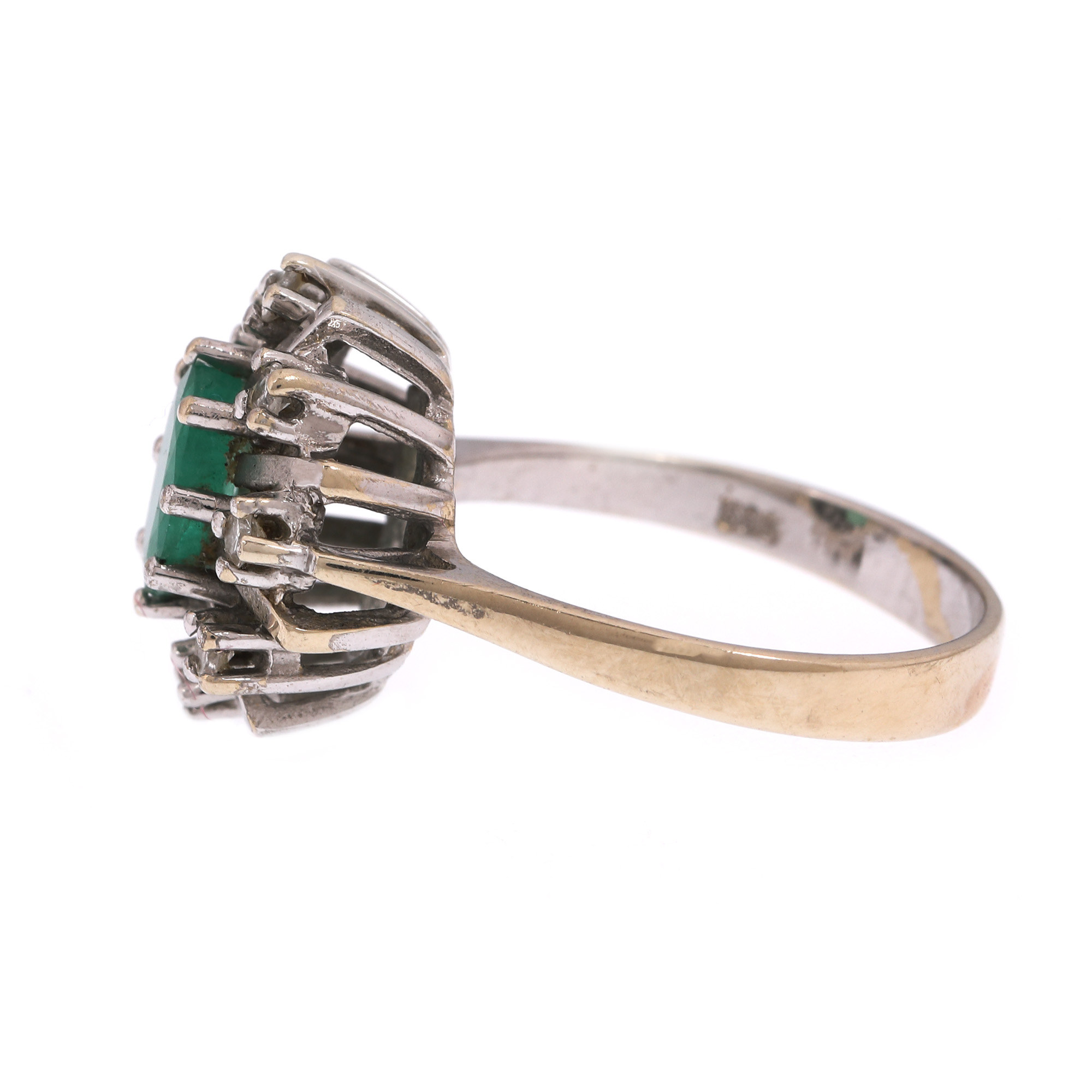 1 smarald oval fațetat, culoare verde, claritate moderately included, cca. 0,47 ct. și 8 diamante single cut, culoare SI1-I1, cca. 0,21 ct.