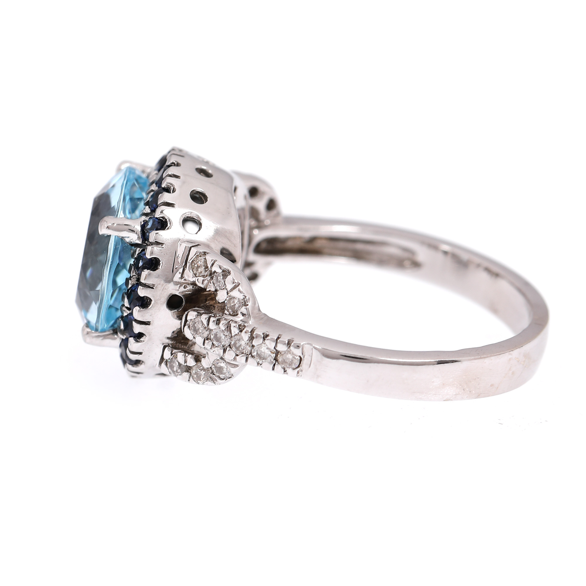 3. Inel din aur alb, decorat cu topaz anturat de diamante și safire