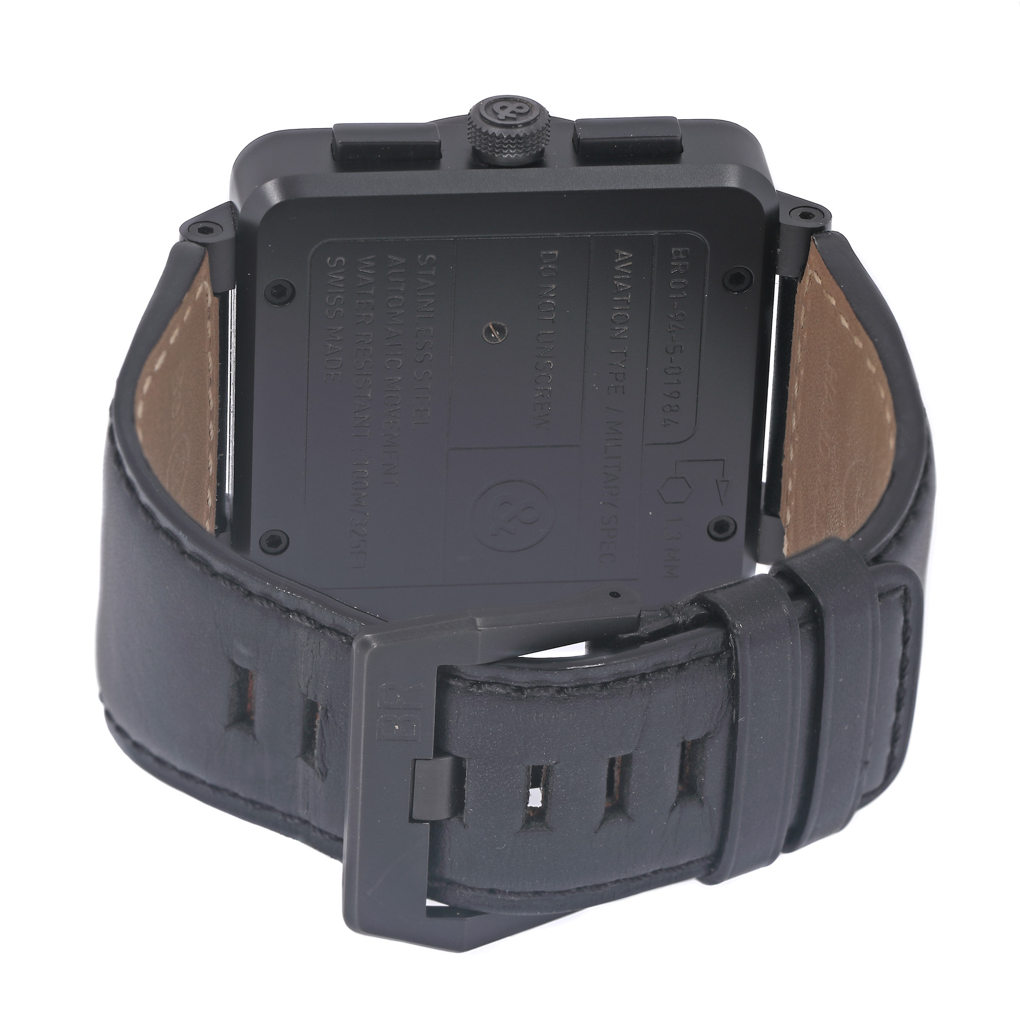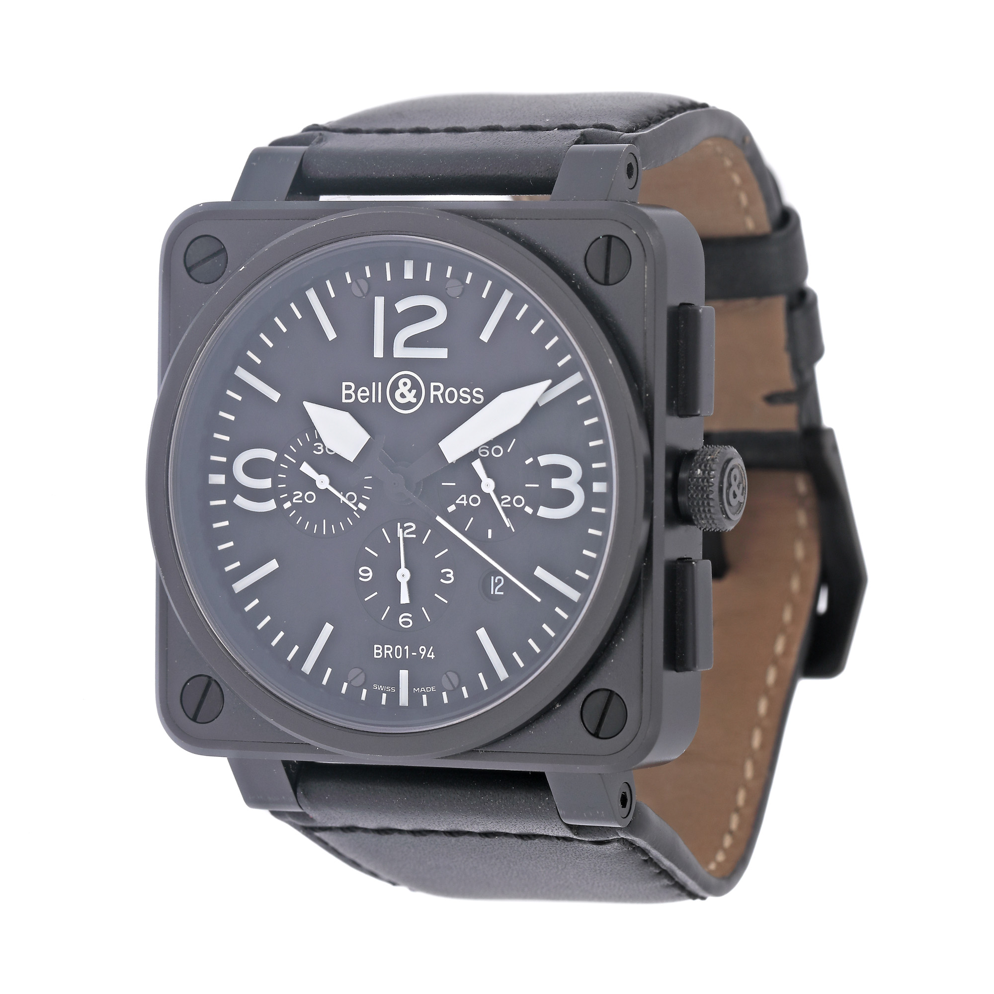 Ceas militar Bell & Ross, de mână, bărbătesc, referință BR01-94, mecanism automatic. Cadran de culoare nergru, cu indici orari albi și numerale arabe pentru orele 3, 9 și 12, cu două regisitre dedicate cronografului, registru pentru secundar, registru pentru dată între orele 4 și 5. Curea din piele, de culoare neagră, cu cataramă, originale.