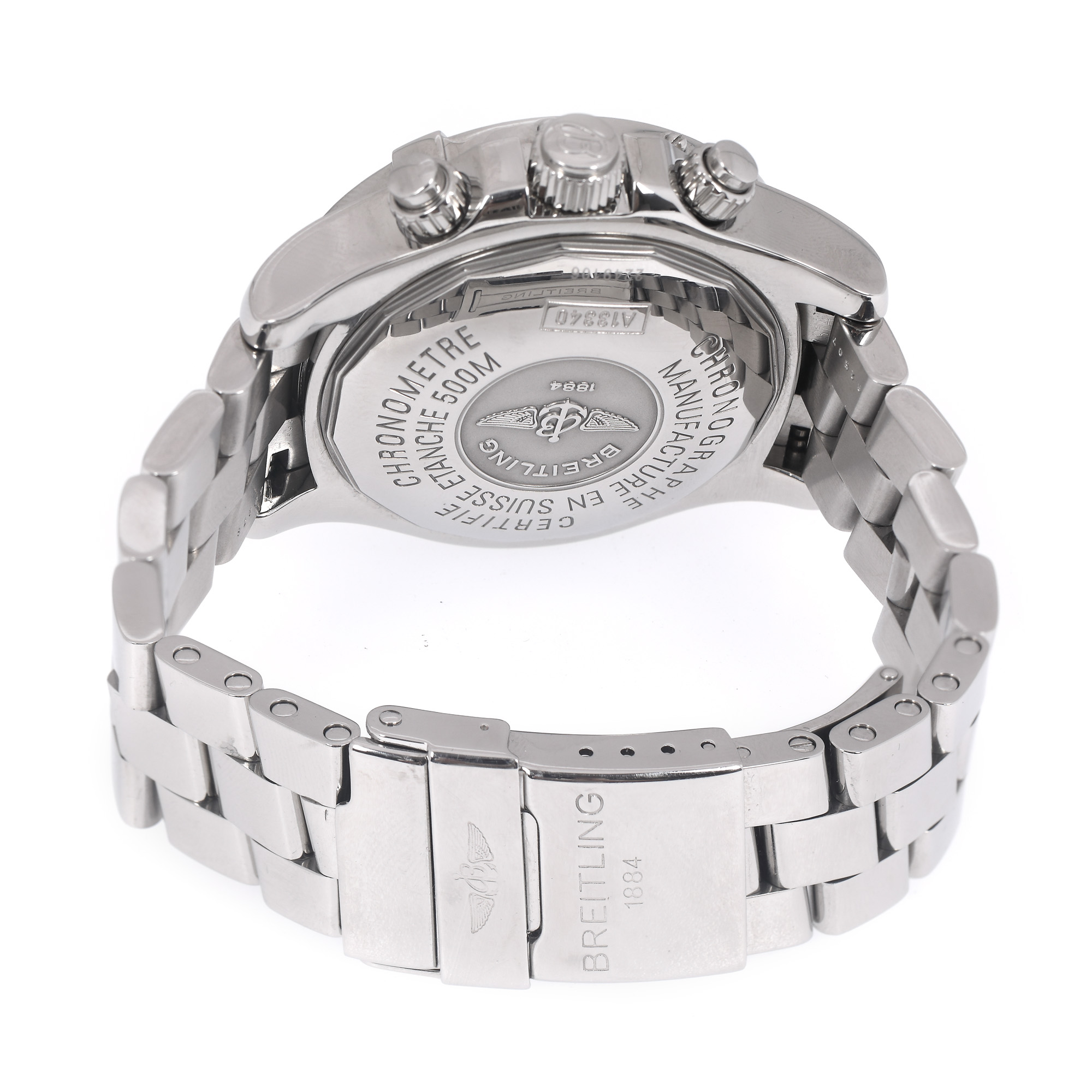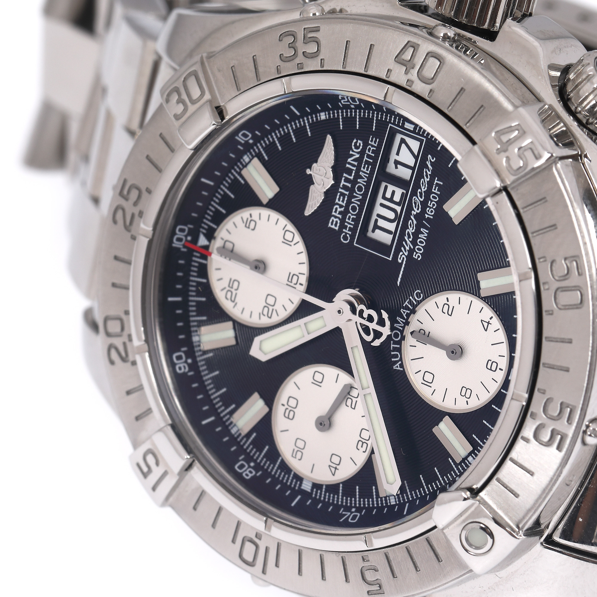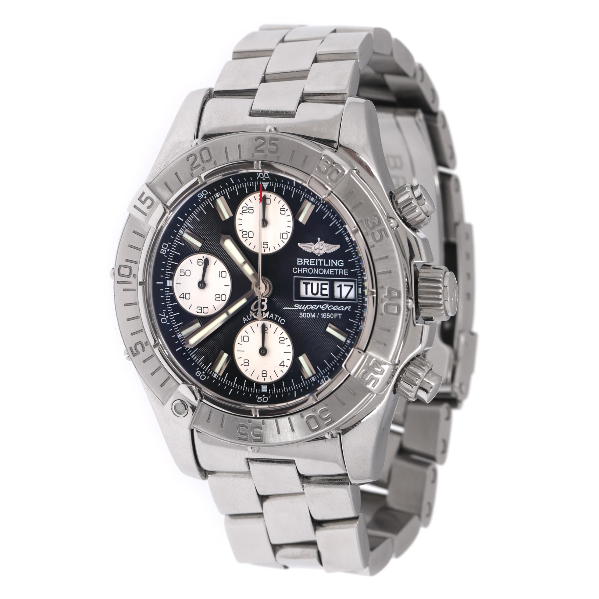 Ceas Breitling Superocean II, de mână, bărbătesc, referință A13340, calibru B13, mecanism automatic. Cadran de culoare negru, cu indici orari luminiscenți, registru pentru secundar între orele 8-10, două registre cronograf pentru 30 minute, între orele 11-1, și pentru 12 ore, între orele 5-7, și registru pentru zi și dată în dreptul orei 3. Bezel rotativ unidirecțional. Brățară cu sistem de închidere tip deployant, originale.