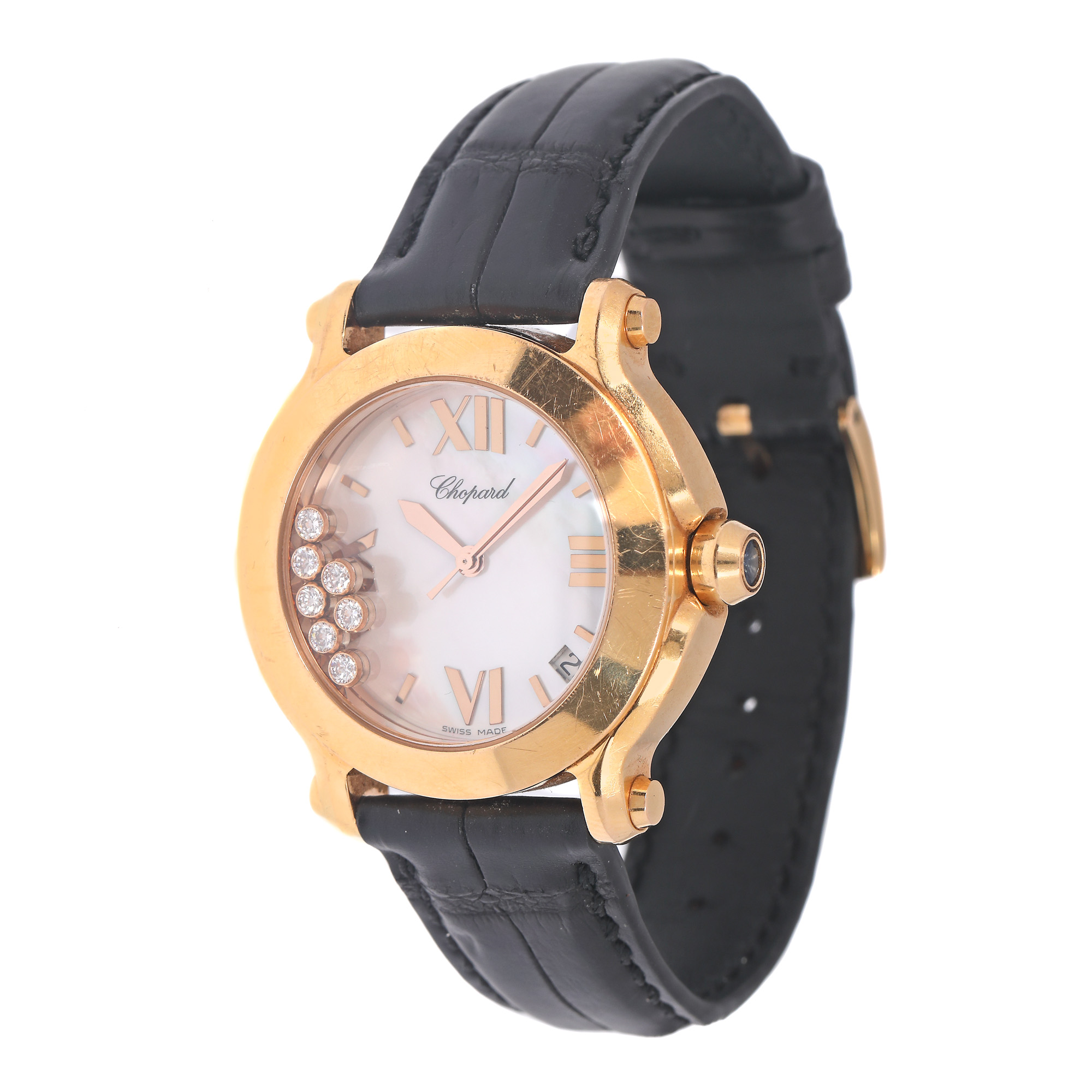 Ceas Chopard Happy Sport din aur roz, de mână, de damă, referință 4183, mecanism quartz. Cadran din sidef, cu indici orari din aur și numerale romane pentru orele 12, 3, 6 și 9, ornat cu șapte diamante mobile. Curea din piele, de culoare neagră, cu cataramă din aur, originale.