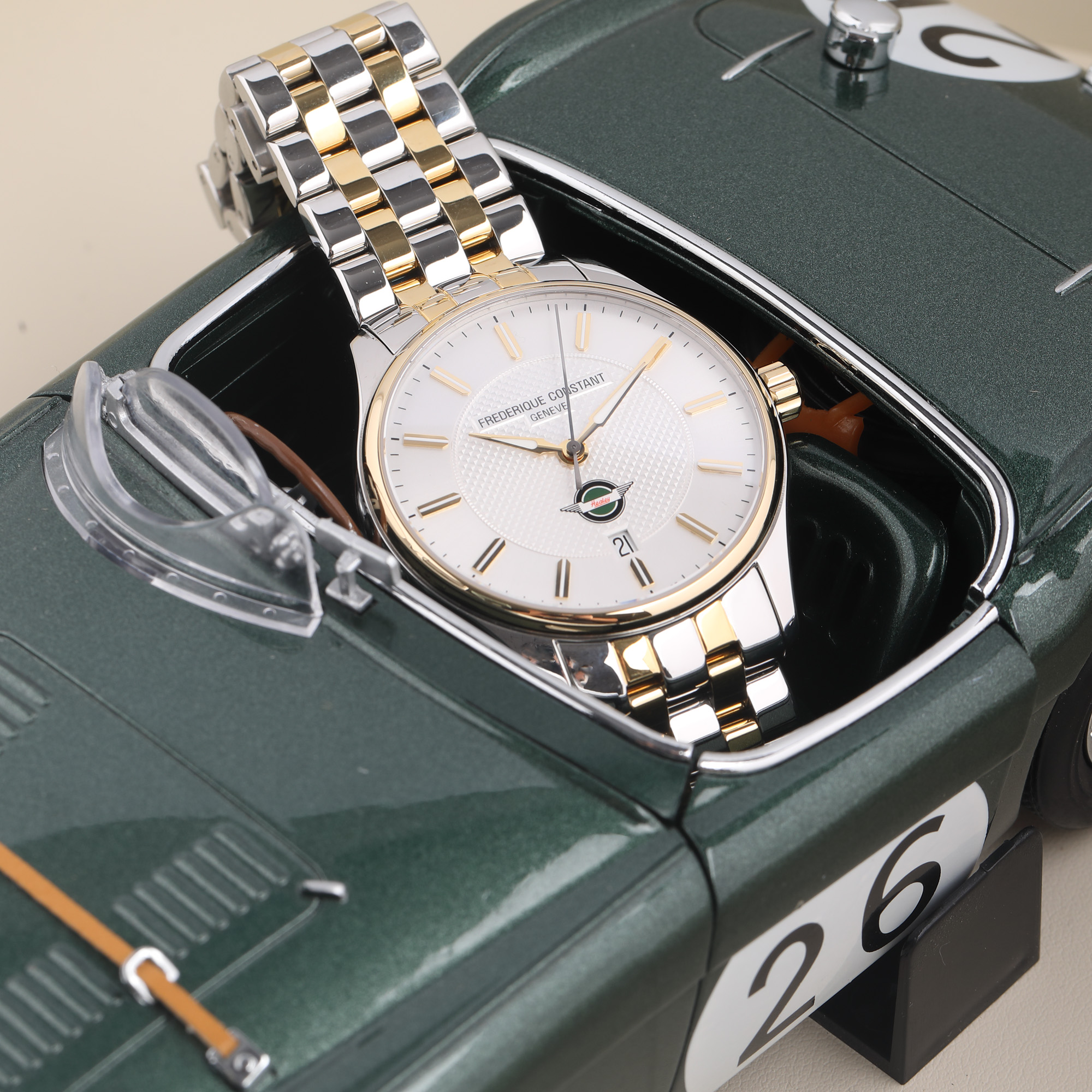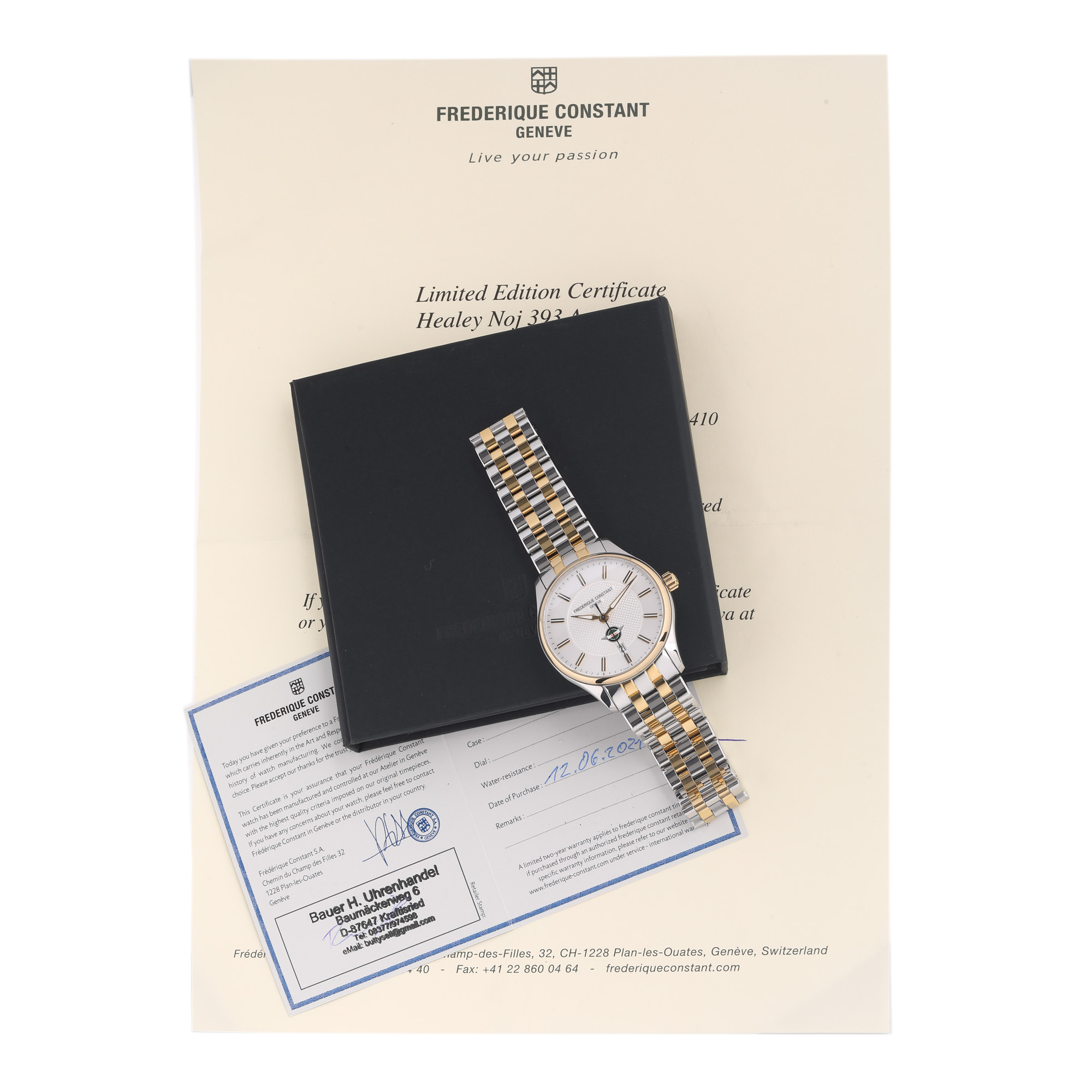 35. Ceas Frederique Constant Healey din aur și oțel, de mână, bărbătesc, ediție limitată 410/1888, însoțit de cutia originală, acte de proveniență și machetă auto [2019]