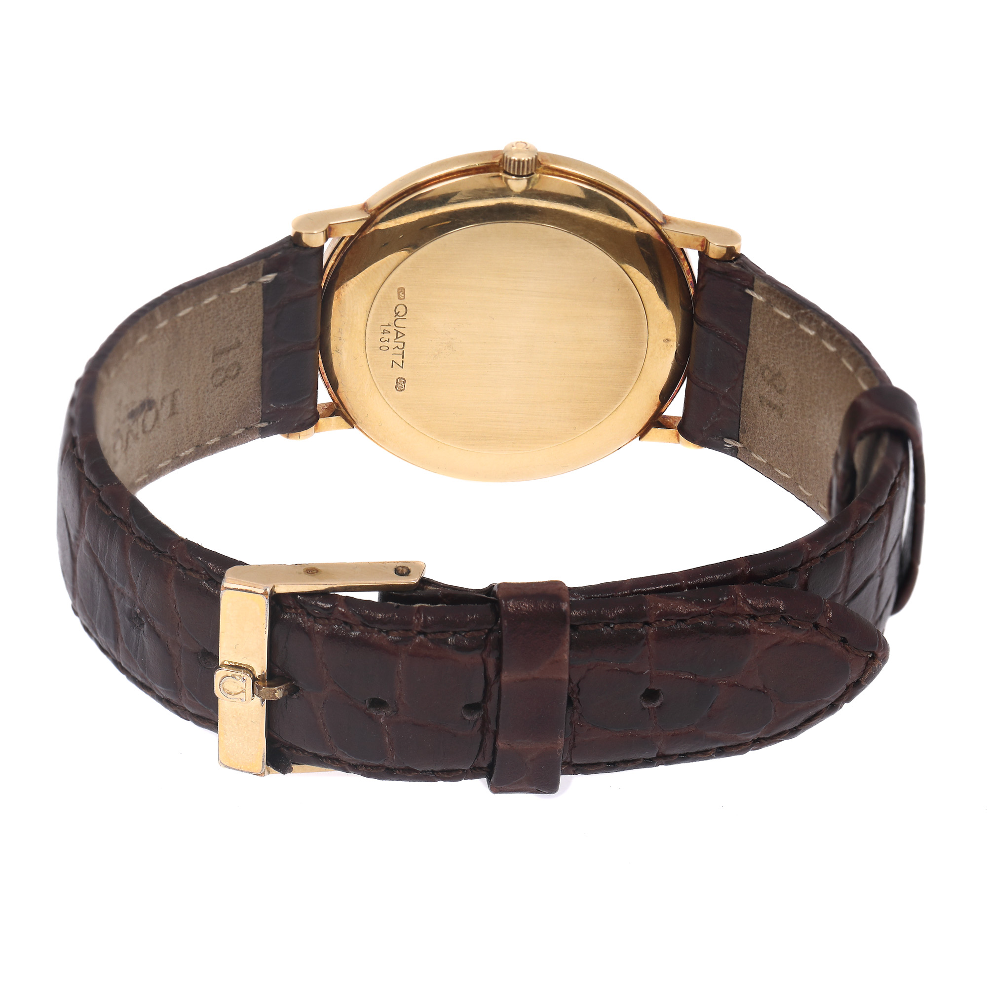 Ceas Omega din aur, de mână, bărbătesc, referință 1430, mecanism quartz. Cadran de culoare auriu, cu indici orari din aur și registru pentru dată în dreptul orei 3. Curea din piele, de culoare maro, înlocuită aftermarket, cu catarama originală.