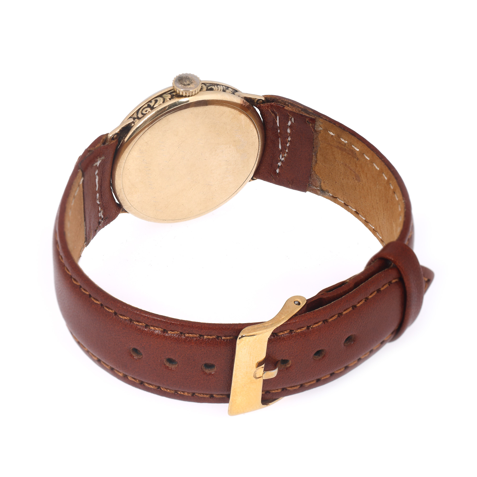 Ceas Omega, vintage, din aur, de mână, bărbătesc, mecanism cu armare manuală. Cadran auriu cu indici numerale arabe, registru pentru secunde in dreptul orei 6. Curea din piele aftermarket.