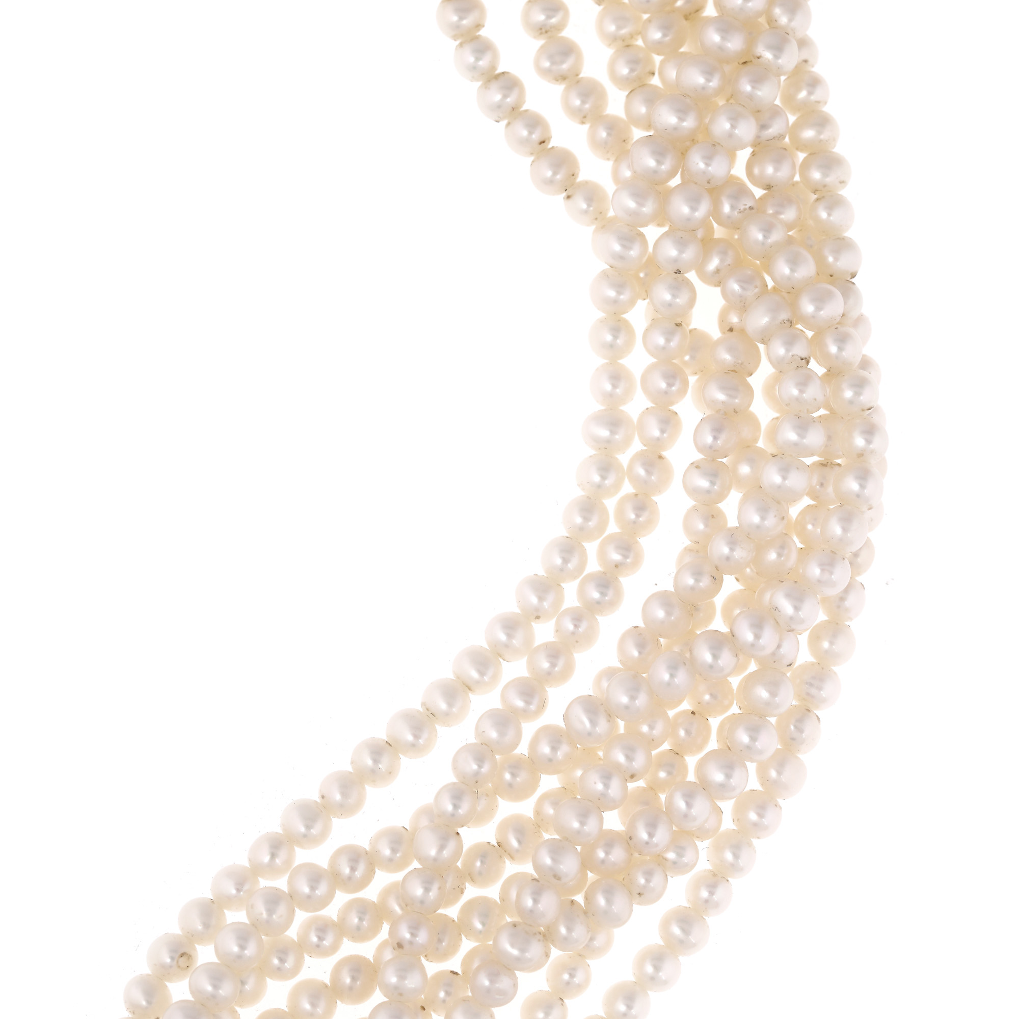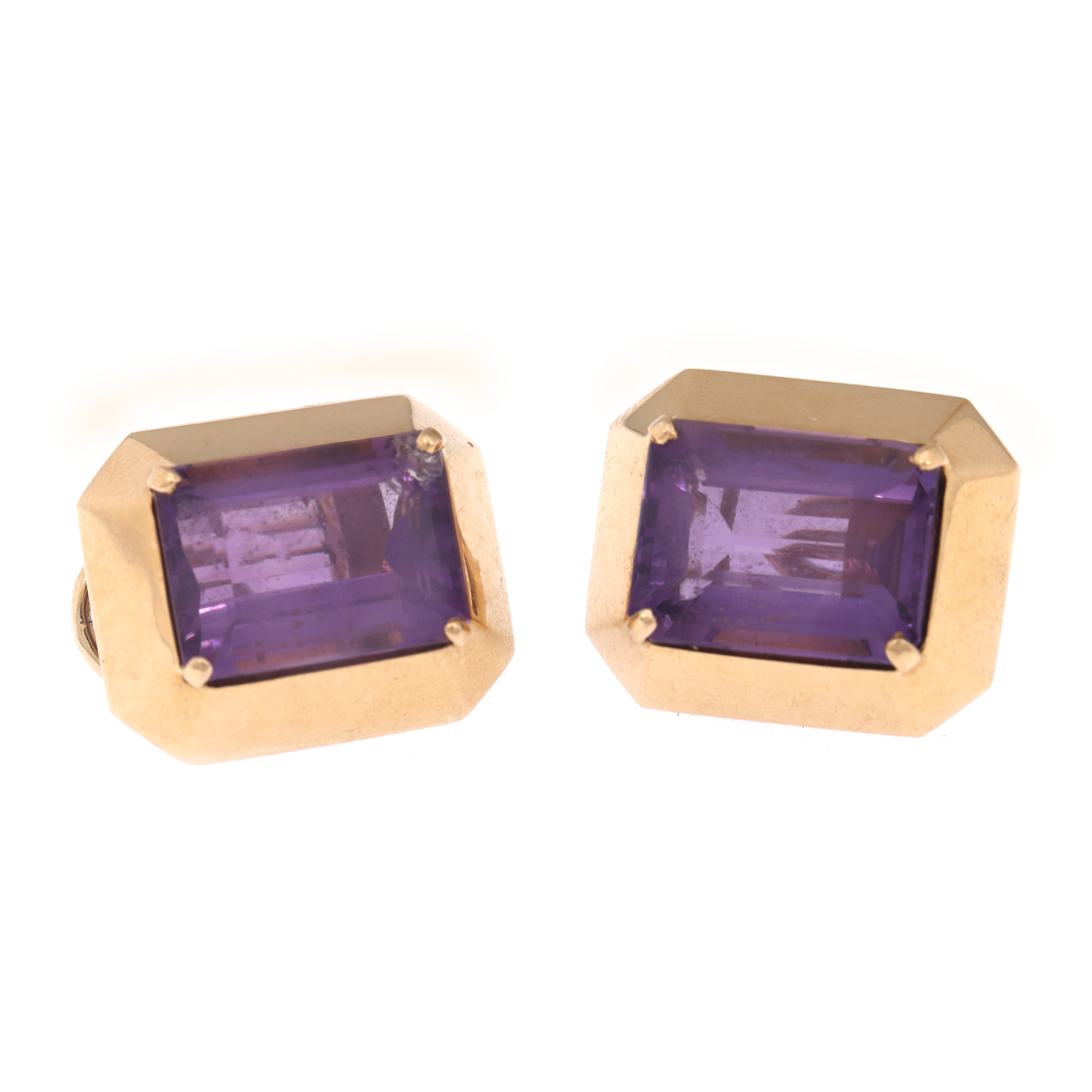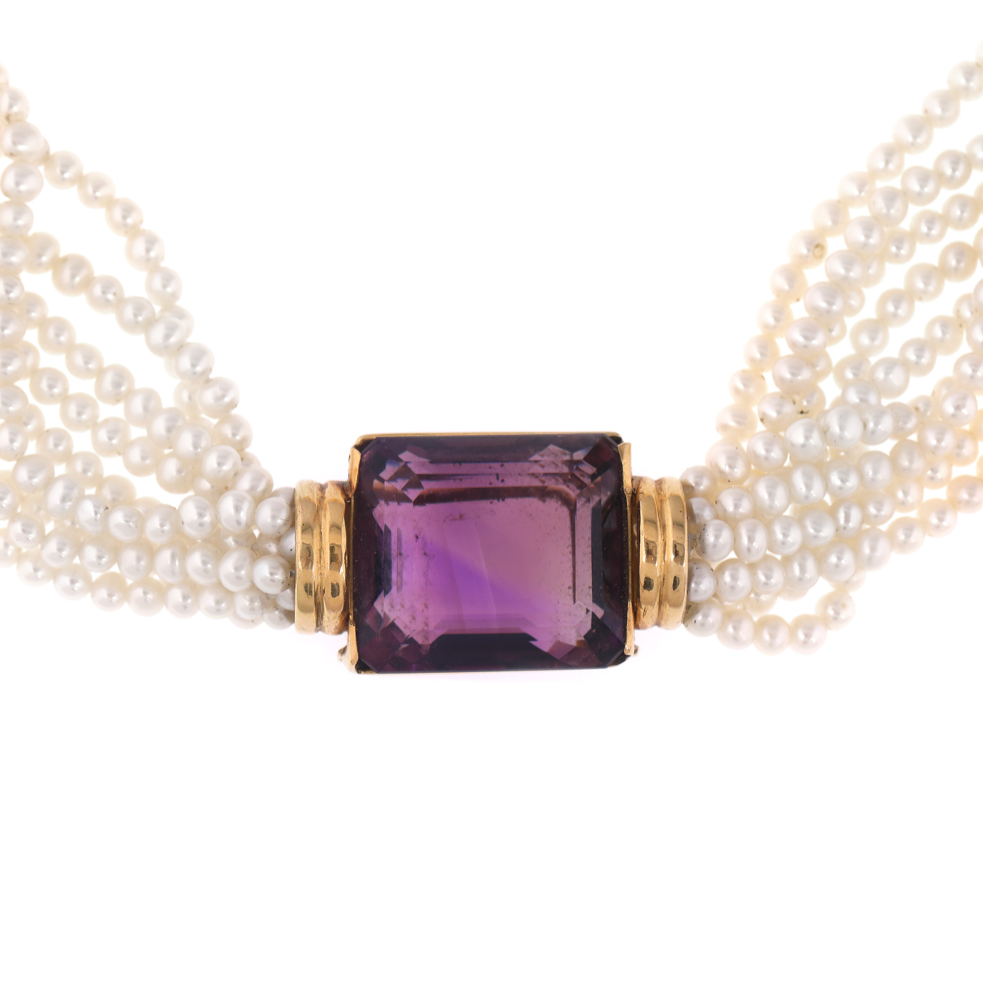 colier: perle de cultură Akoya, rotunde, albe, d=3,10-3,95 mm; 1 ametist, emerald cut, culoare violet, claritate eye-clean, cca. 49,00 ct.; cercei: 2 ametiste (un ametist ciobit), emerald cut, culoare violet, claritate eye-clean, cca.22,60 ct.