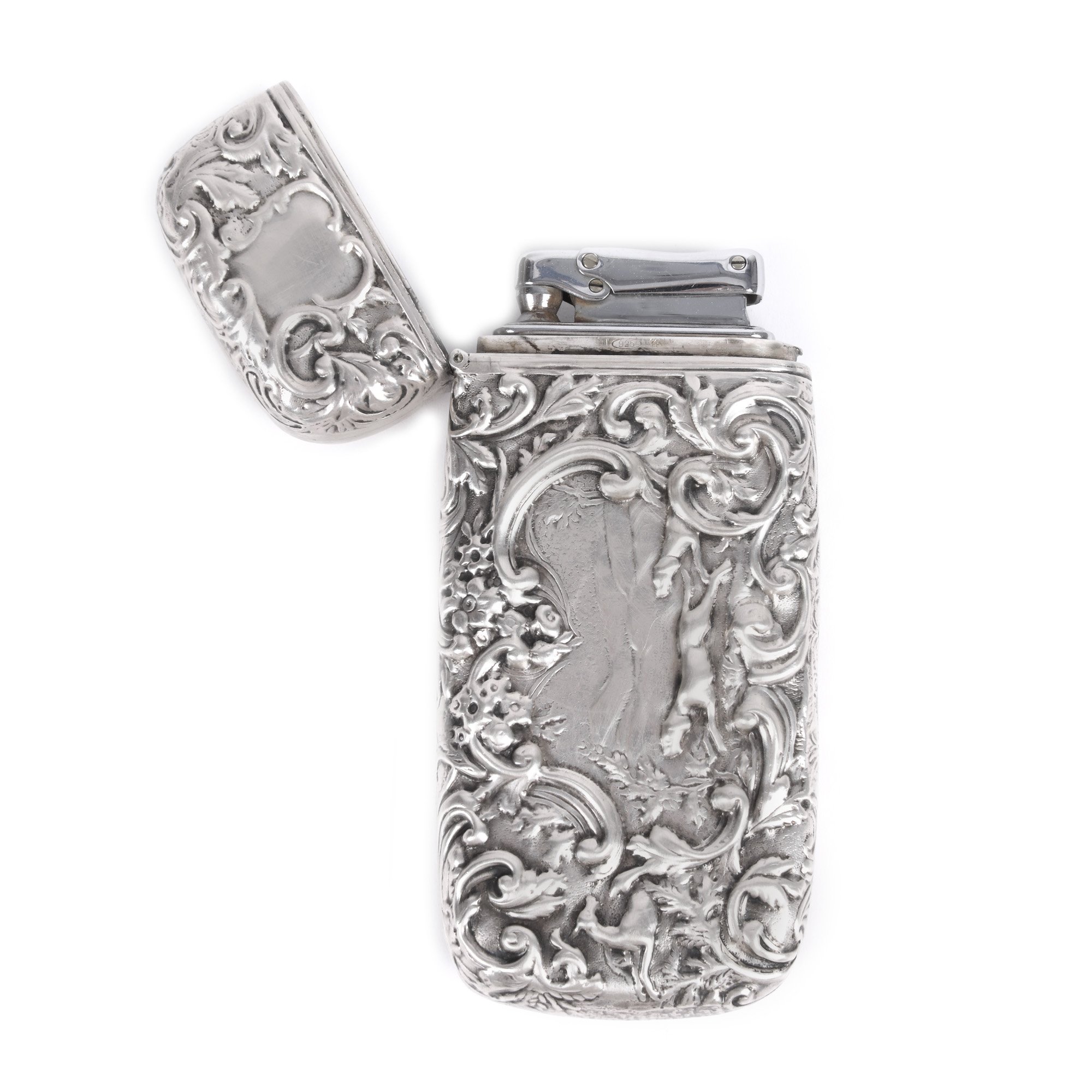 16. Tabacheră L'Argenteria Dabbene din argint, decorat cu vrejuri vegetale și scenă de vânătoare în repoussé, prima jumătate a sec. XX