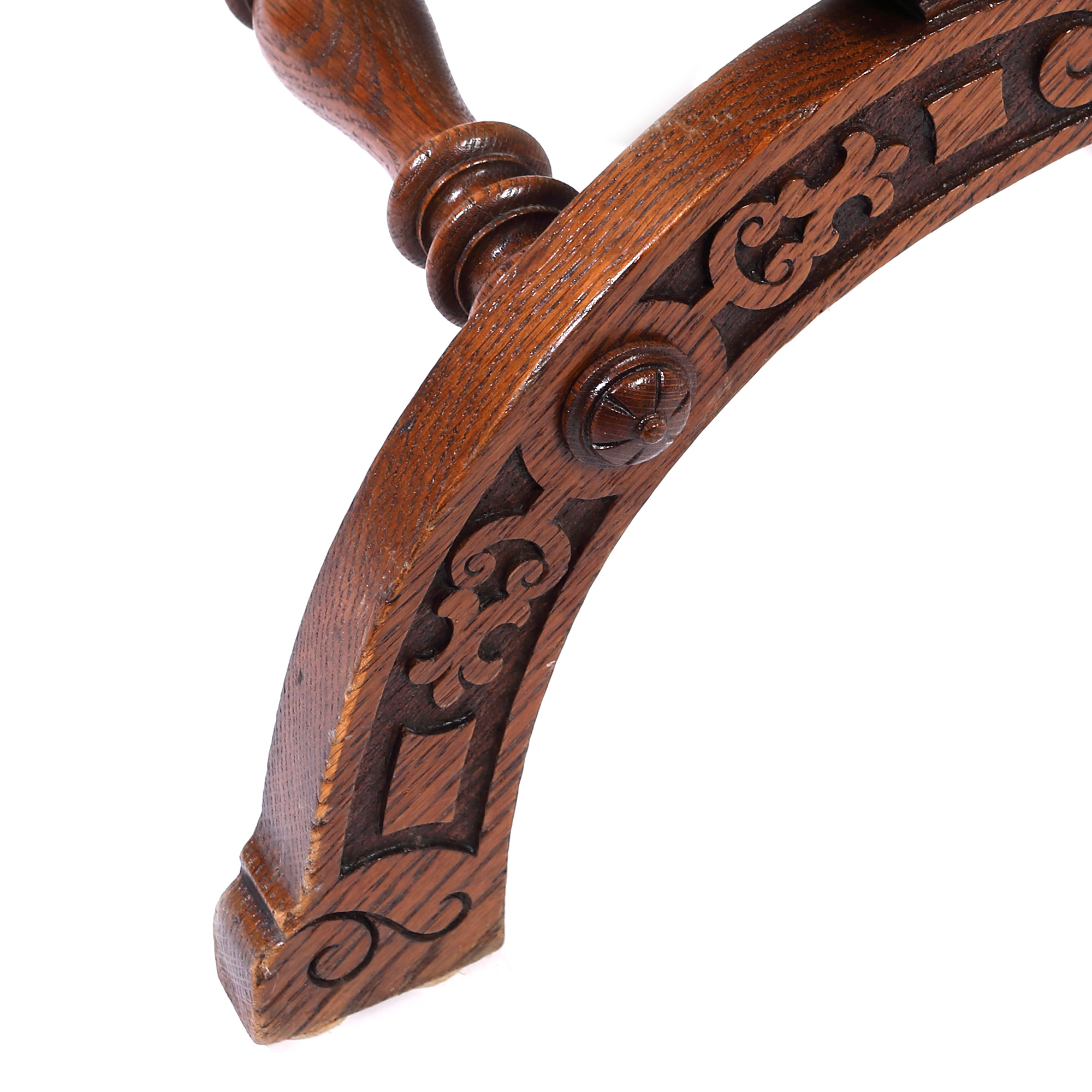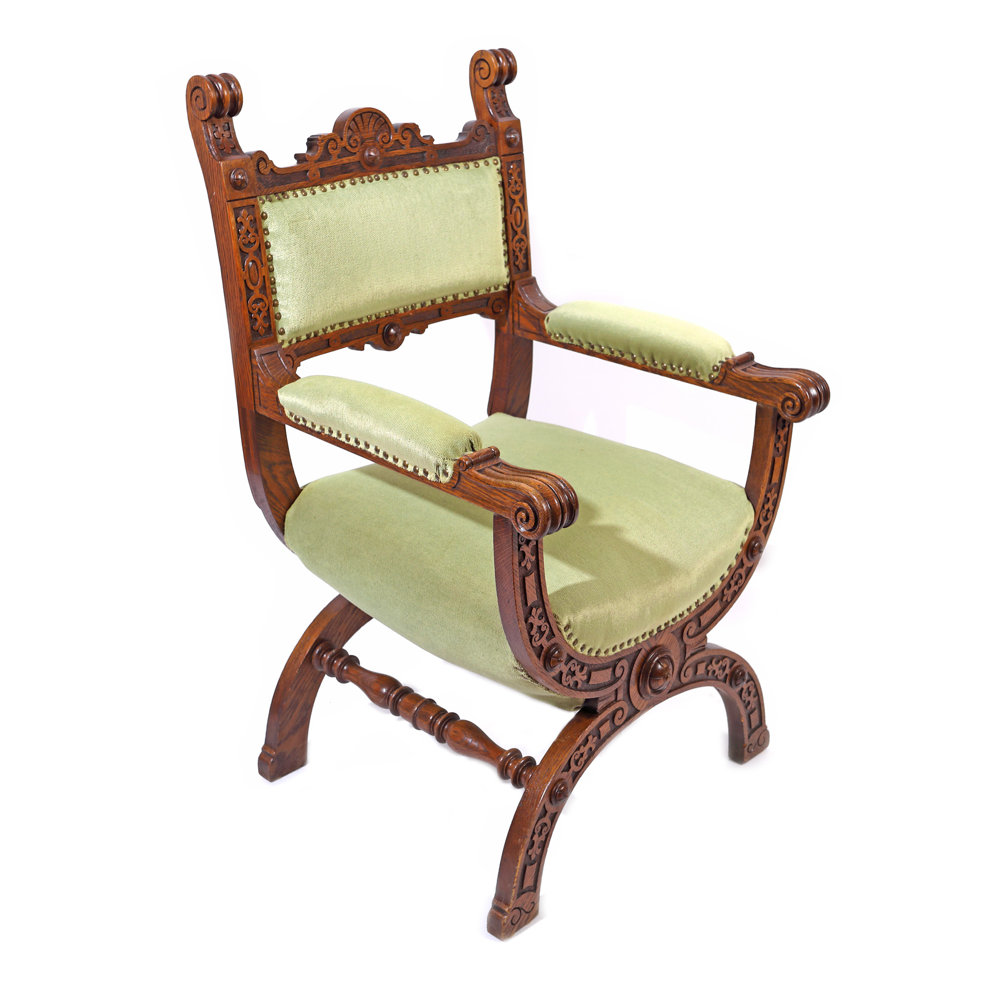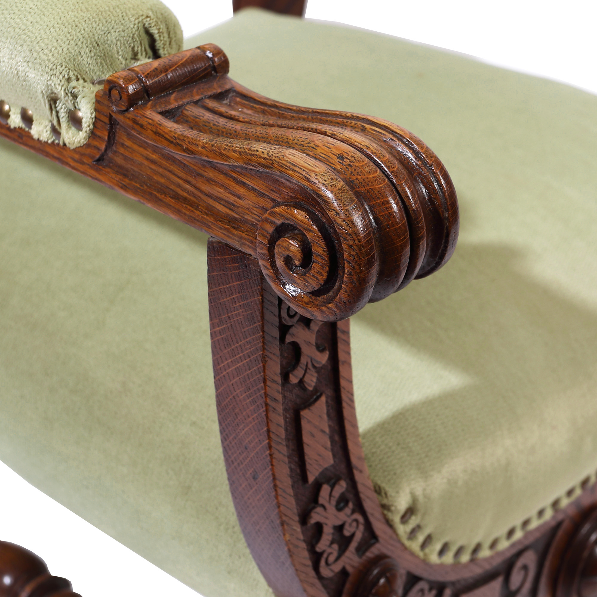 47. Jilț dantesca din lemn, cu brațe parțial capitonate, spătar cu fronton decorat cu motiv de scoică, început de sec. XX
