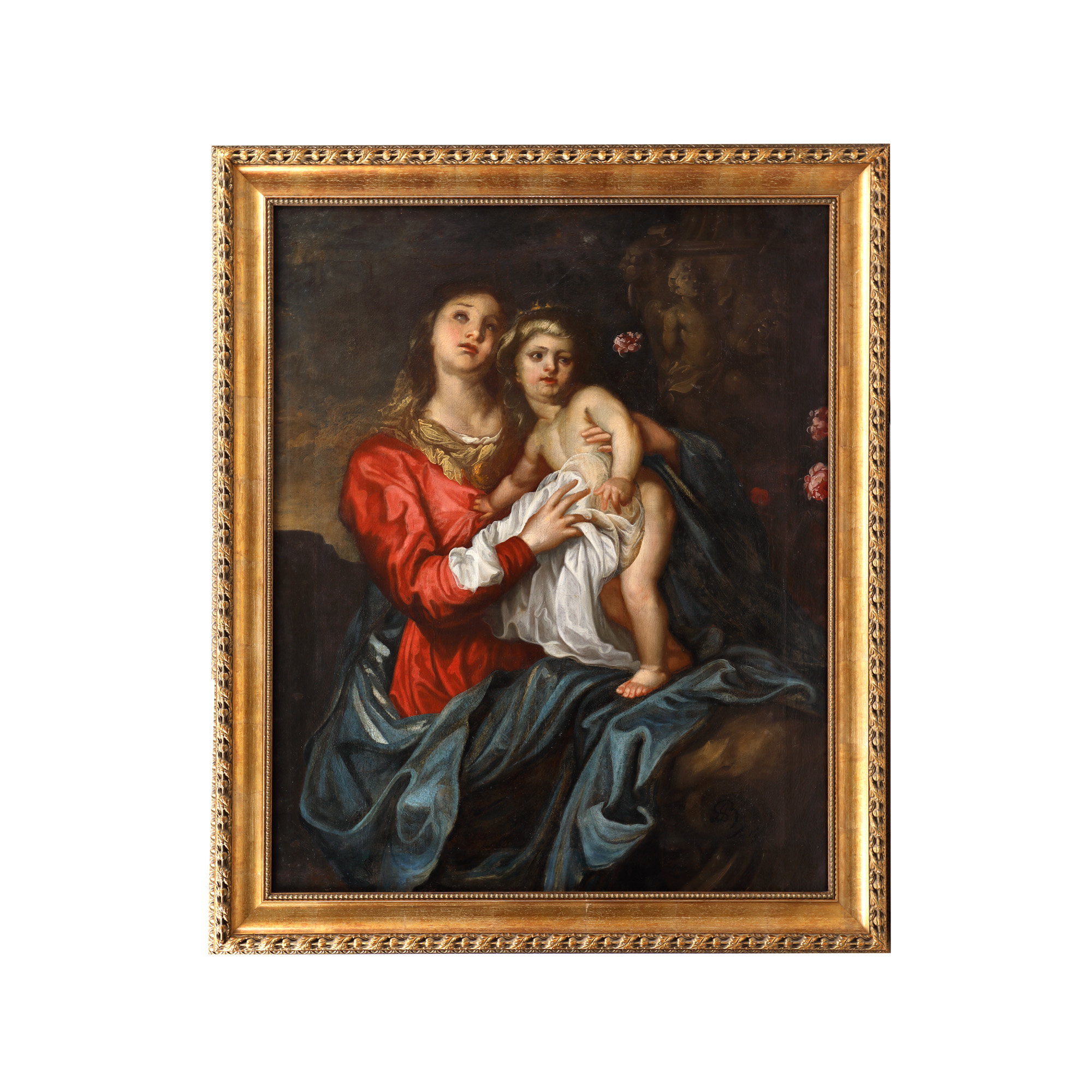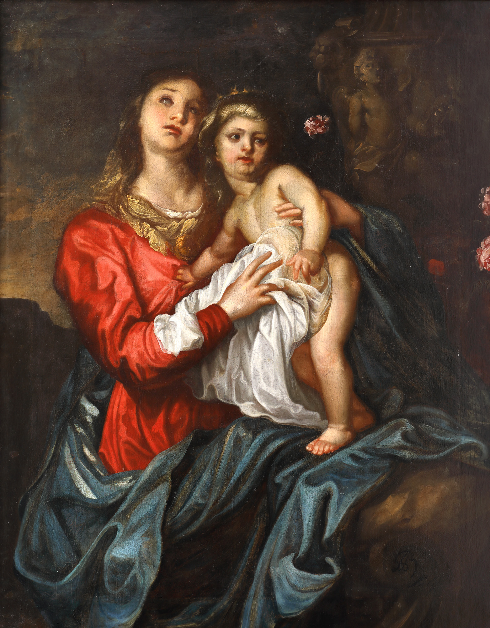 Pictor flamand, originar din Lierre, Belgia, Adrian de Bie va studia la Anvers cu Walter Abts și mai apoi la Paris, sub atenta îndrumare a pictorului curții regale a lui Louis al XIII-lea, Rodoplhe Schoof. În 1614 ajunge în Italia, unde va sta vreme de opt ani. La Roma se va supune tendințelor din epocă și va picta mici piese de mobilier. Se întoarce în Lierre în 1623 și rămâne aici până la sfârșitul vieții. Din păcate, nu s-au păstrat foarte multe dintre operele realizate de artist. Adrian de Bie e cunoscut îndeosebi pentru portretele și scenele biblice pe care le-a pictat. Dintre acestea, amintim ”Portrait de vieille femme”, care datează din 1652, aflat în colecția muzeului din Darmstadt sau tripticul cu temă religioasă realizat în biserica Eligius din Lierre. Creația de față stă mărturie a întâlnirii artistului cu opera lui Anthony van Dyck și totodată denotă apetența sa față de o temă intens popularizată în epocă. Canonizarea vieții fecioarei Maria a produs numeroase ecouri atât în rândul artei religioase, cât și în rândul artei laice de-a lungul timpului. Subiectul devine, așadar, foarte popular în rândul artiștilor plastici. Aceștia reiau motivul și îl reprezintă fie în manieră proprie, ghidați de interpretări personale, fie prin reproduceri ale unor lucrări deja existente care se apropie mai mult de viziunea lor. În cea din urmă categorie se încadrează lucrarea de față. Adrian de Bie reproduce cu vădită admirație opera lui van Dyck, realizată în perioada 1630-1632. Cu o ucenicie desfășurată sub îndrumarea lui Peter Paul Rubens și cu experință în ipostaza de pictor al unei curți regale (Charles I, Anglia), van Dyck va aborda subiectul ”madonei cu pruncul” în cel puțin opt pânze diferite. Va prelua, la rândul său, din specificitățile modului în care tratează Titian subiectul, după ce observă lucrările acestuia în timpul șederii sale în Italia. Va copia și reimagina una dintre operele lui Titian: elimină din personaje și reduce totodată firul narativ, păstrând doar personajele centrale și concentrându-se asupra unui cadru idolatrizant. Fiecare dintre artiștii anterior menționați preiau modelul arhetipal al madonei care își ține pruncul în brațe și invită privitorul să reflecte asupra iubirii de natură divină. În mod firesc, pictura de față poate fi descifrată în cheie simbolică, astfel că scena iubirii materne se va divide între imaginea mamei, fecioara cu părul lung și despletit și între aceea a copilului divin, al cărui trup dezgolit reiterează condiția sa umană. Cromatica aleasă capătă de asemenea semnificații mai profunde: culoarea albastră indică ipostaza de regină a raiului atribuită fecioarei Maria, iar acoperământul roșu aprins simbolizează sângele lui Hristos și face trimiteri la crucificarea acestuia. Pruncul devine o alegorie a iubirii pure, inocente, lipsite de prejudecăți sau intenții ascunse. Opera în totalitatea sa devine o iconografie cu trimiteri subtile către sfera miraculosului și a credinței nezdruncinate.