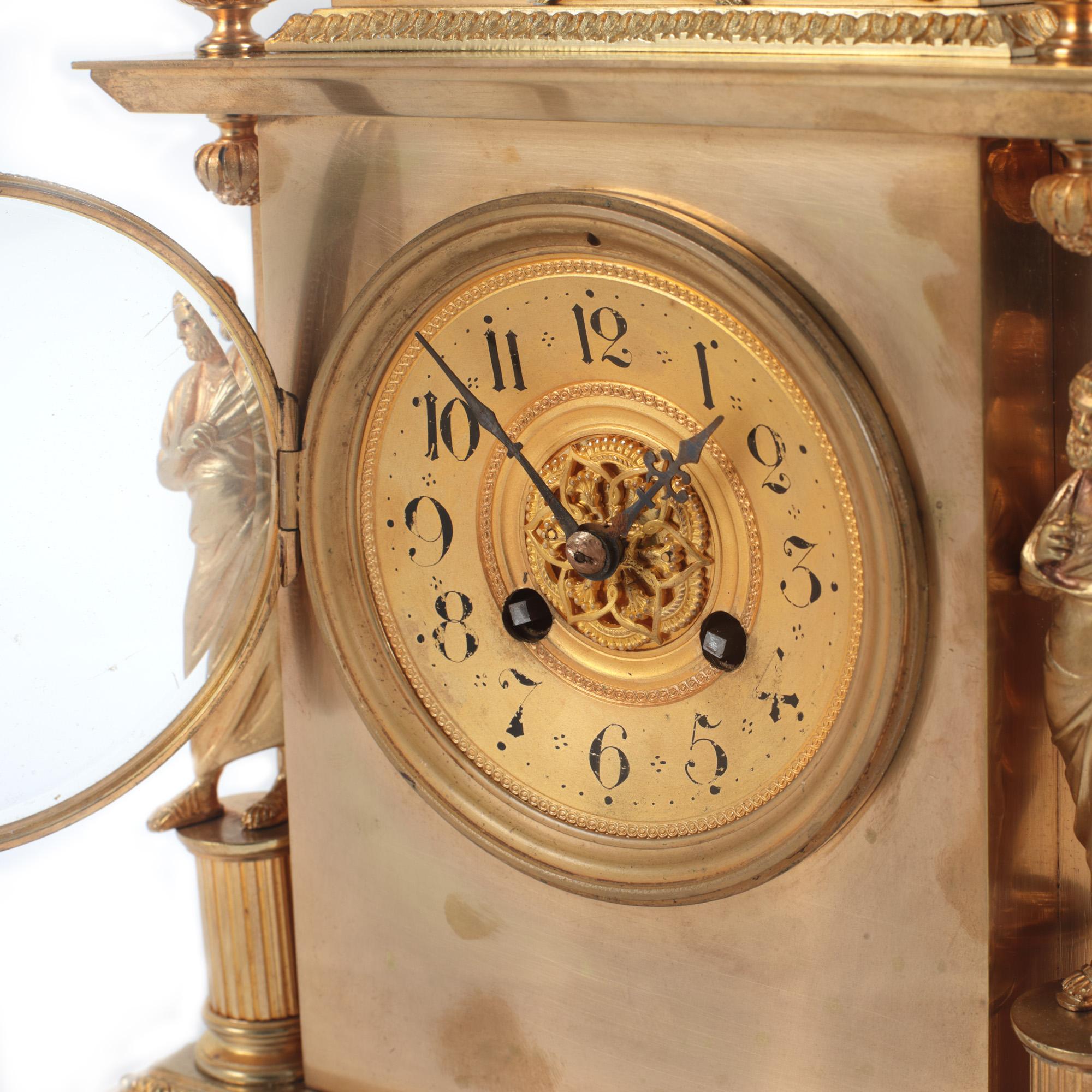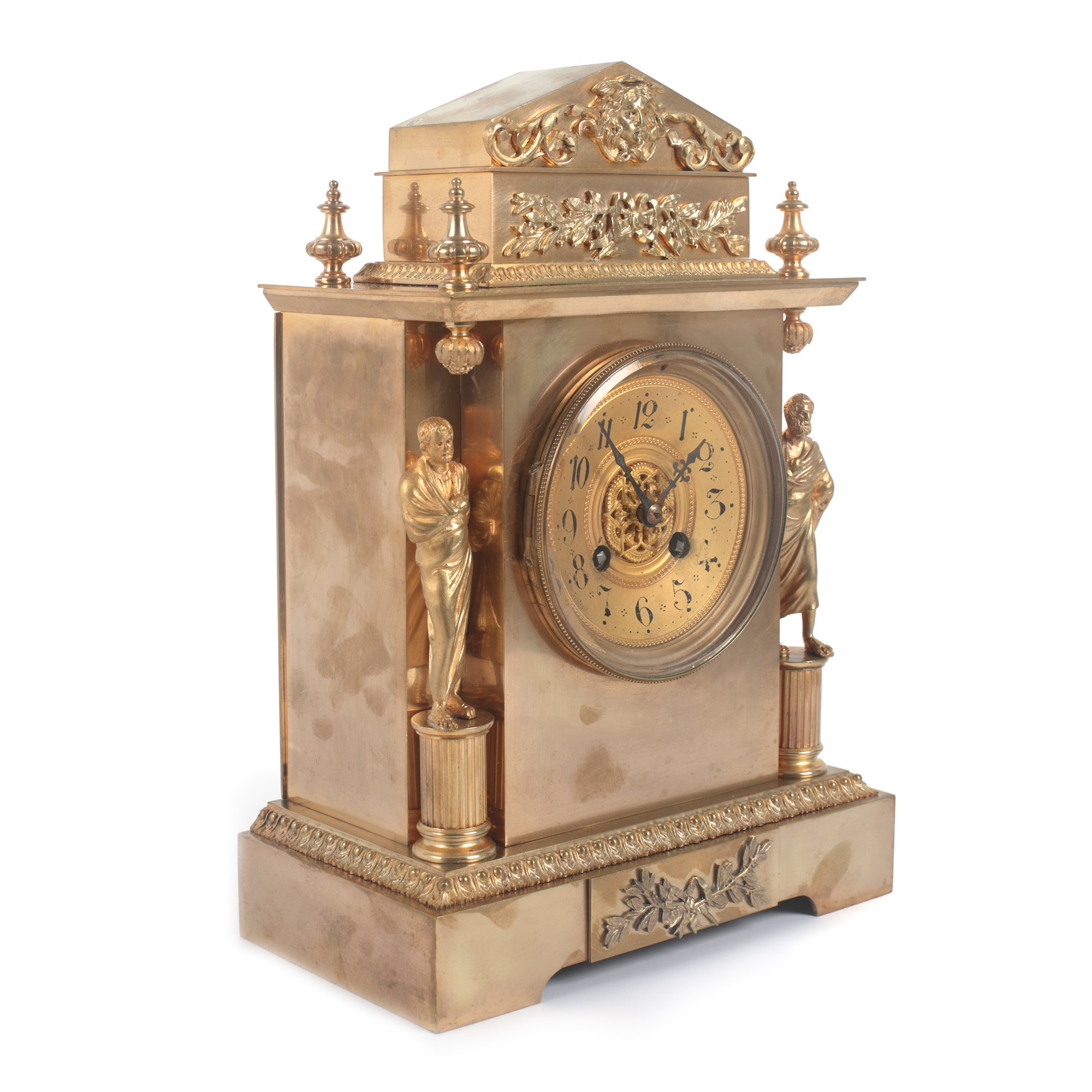 42. Ceas Henri Picard din bronz, în stil Empire, decorat cu statuetele a doi filosofi greci, începutul sec. XIX