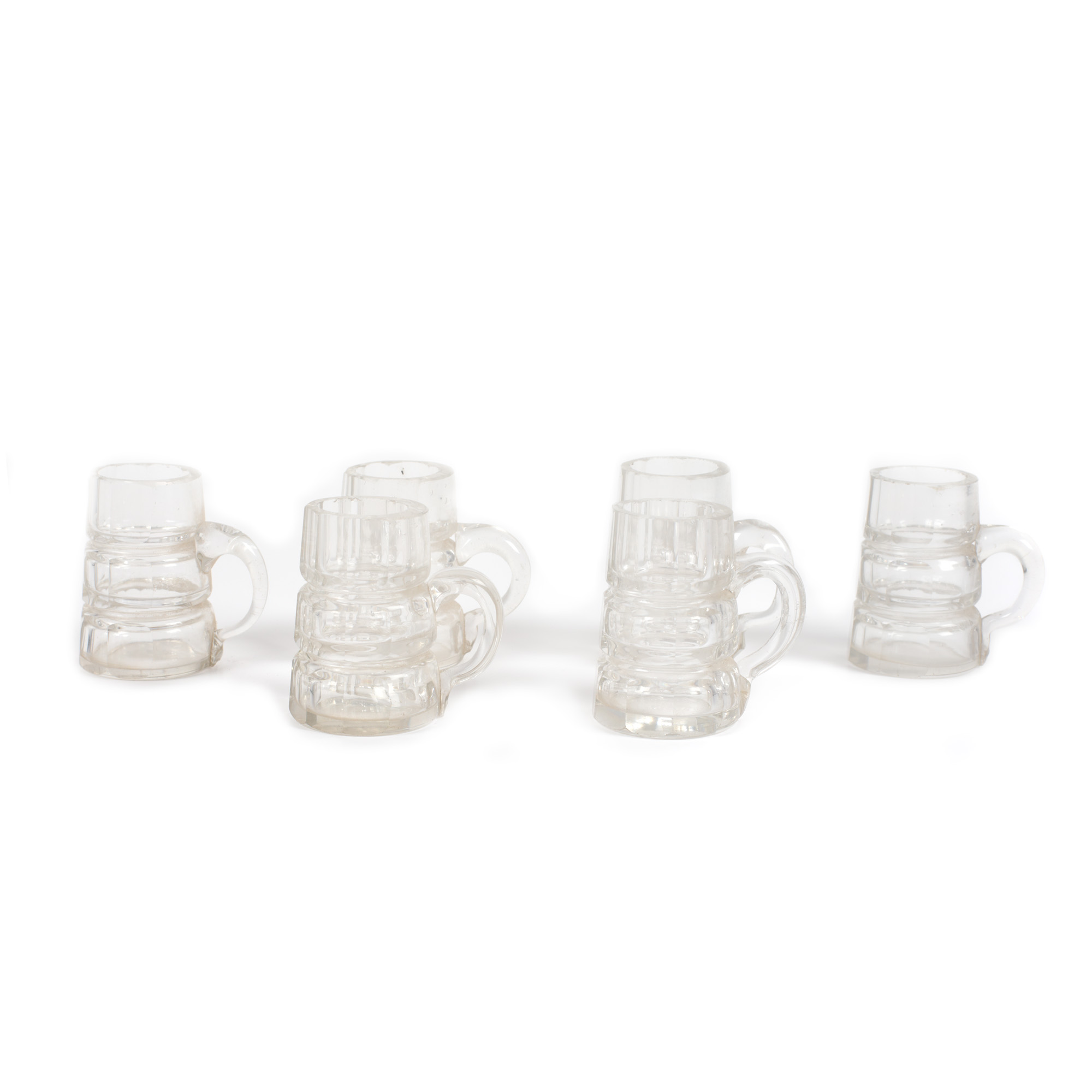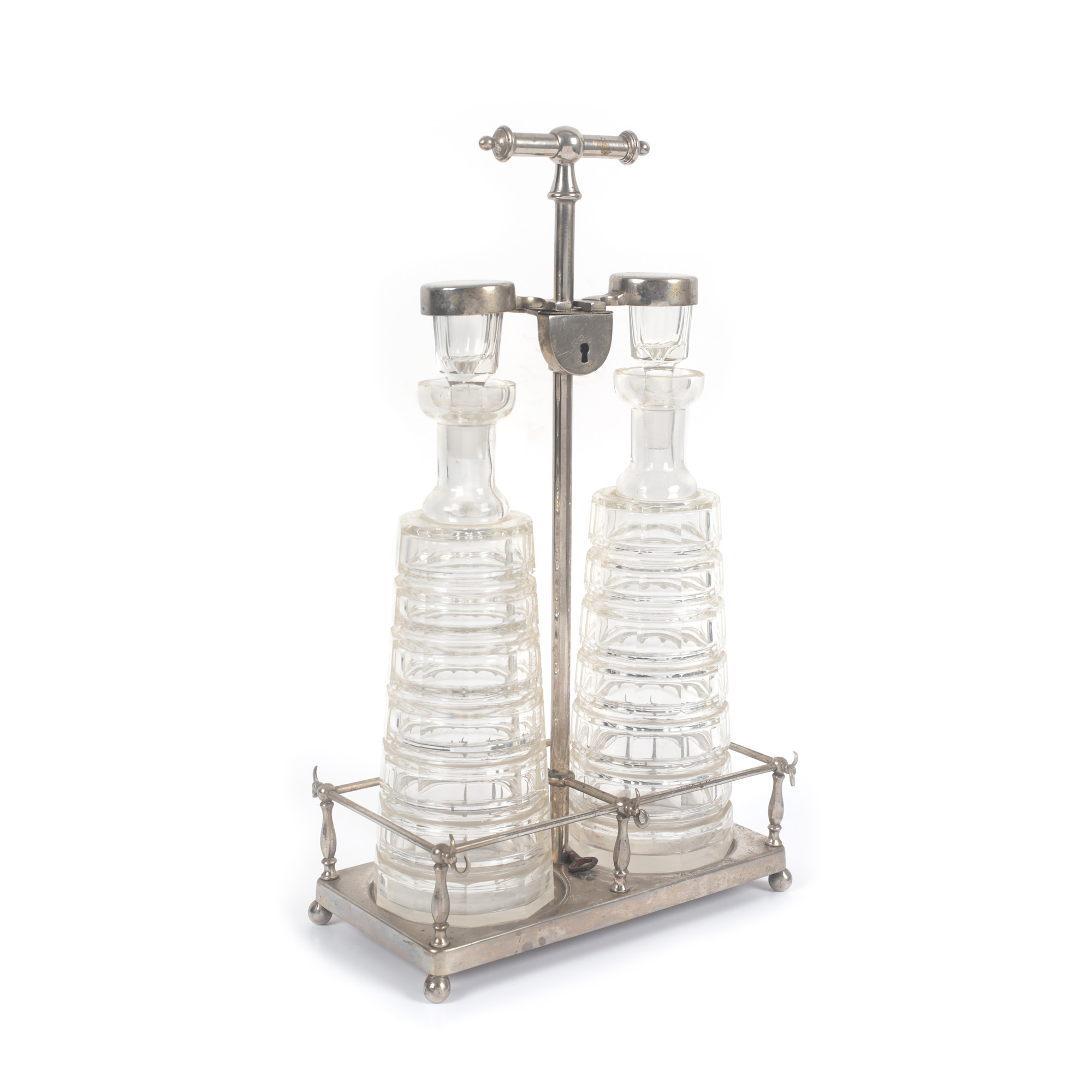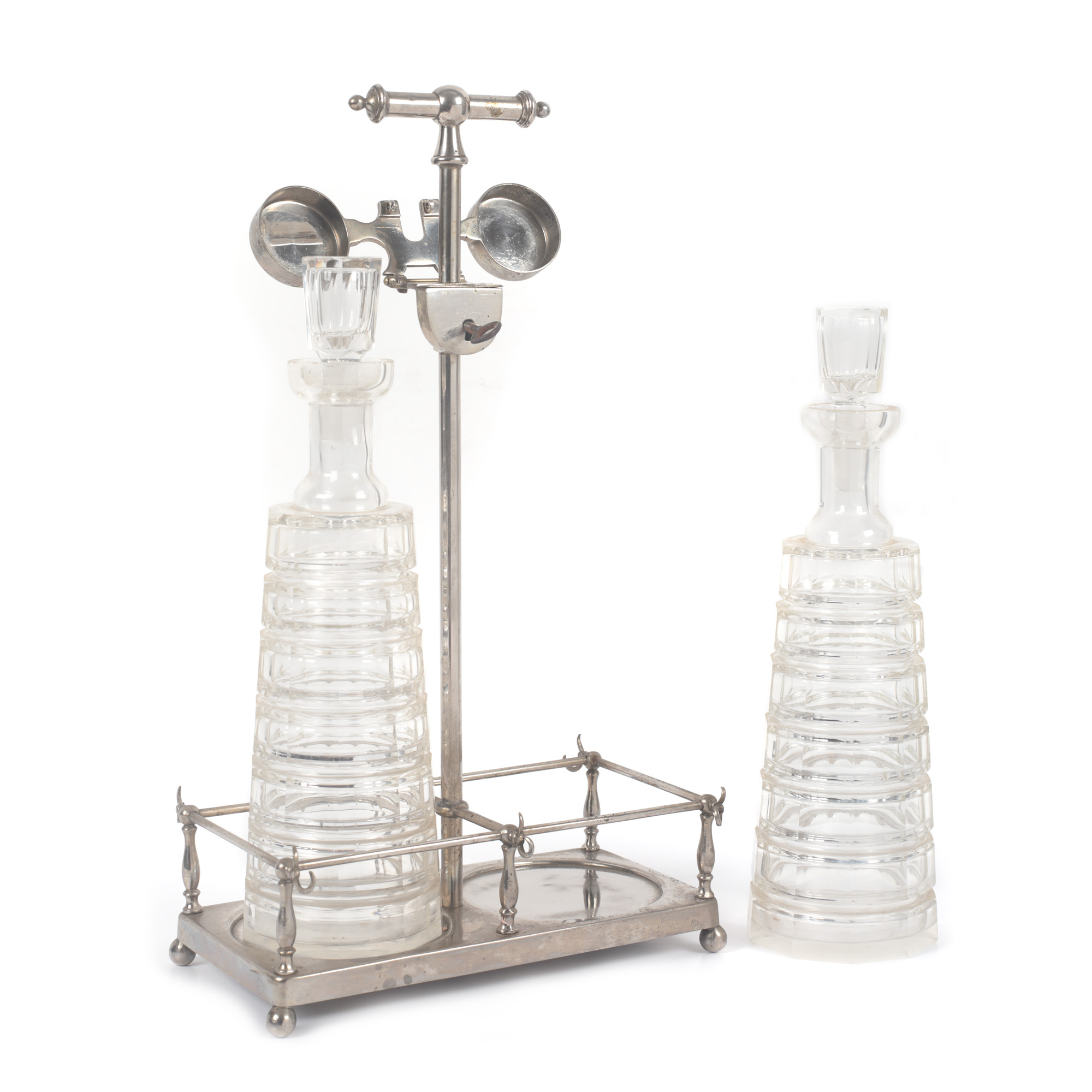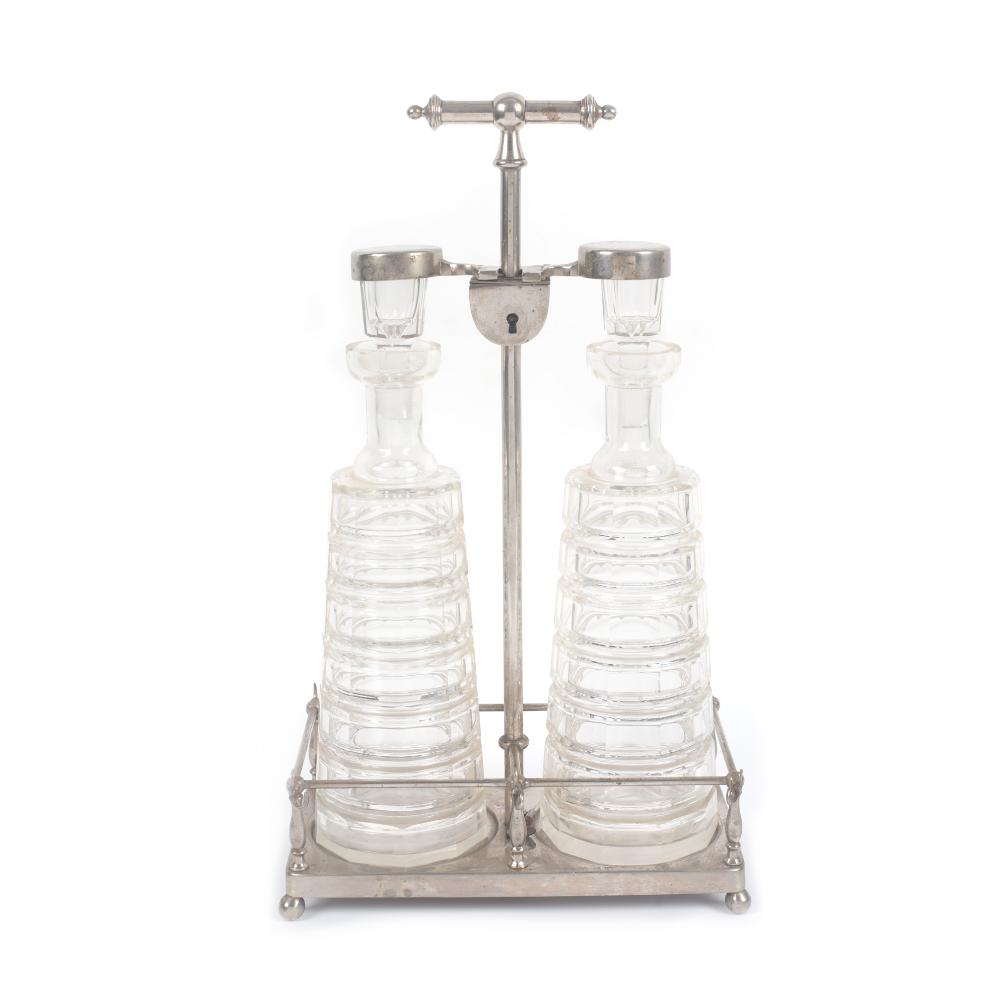 9. Interesant set Sezession, probabil de autor, format din suport cu cheie, două decantoare și șase pahare pentru băuturi aperitiv, cca. 1900
