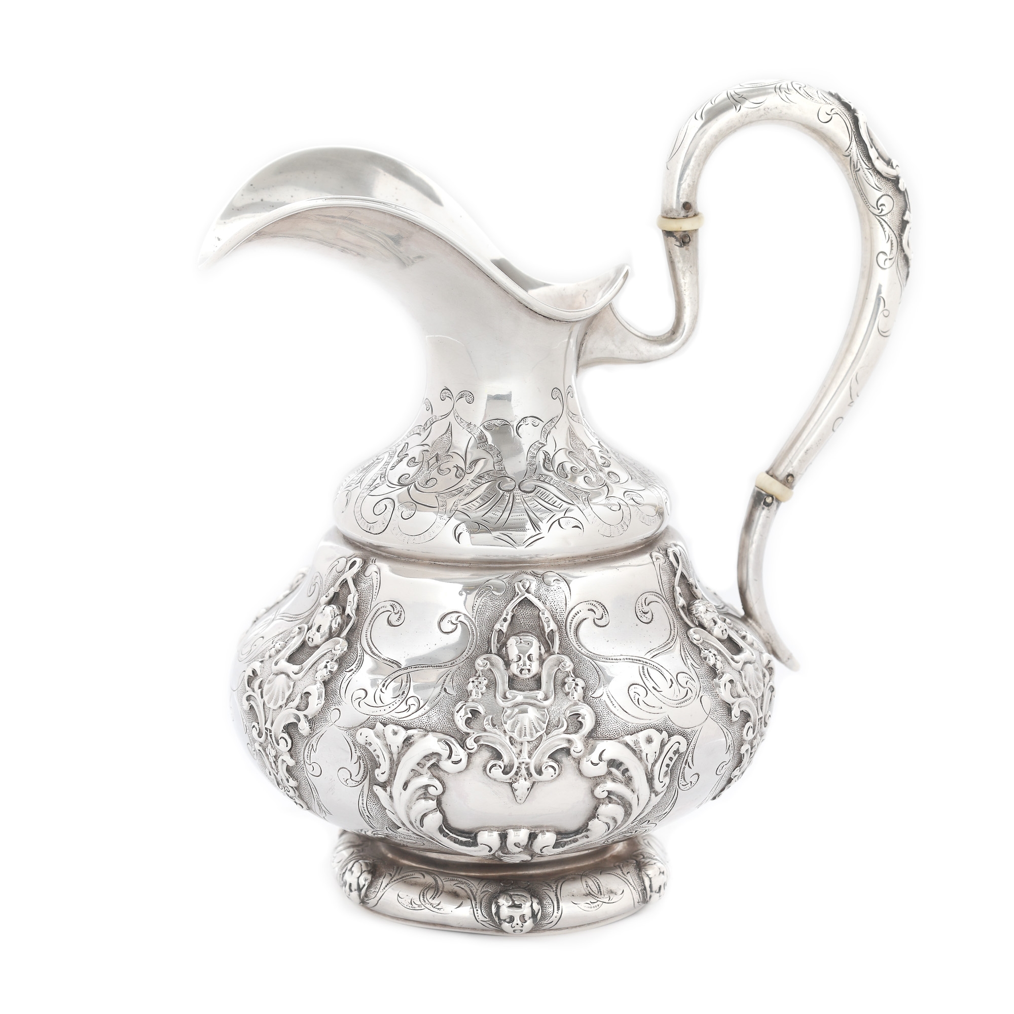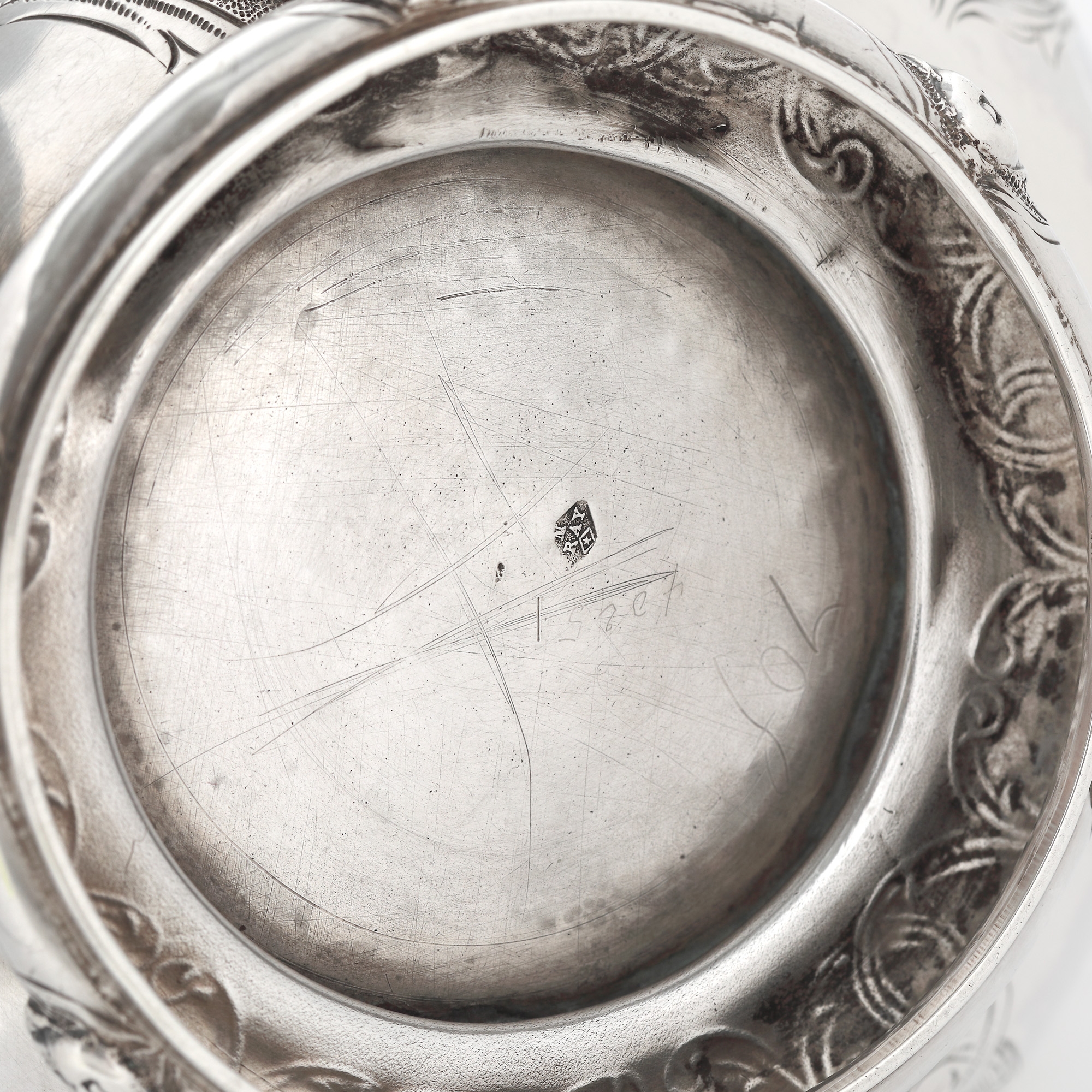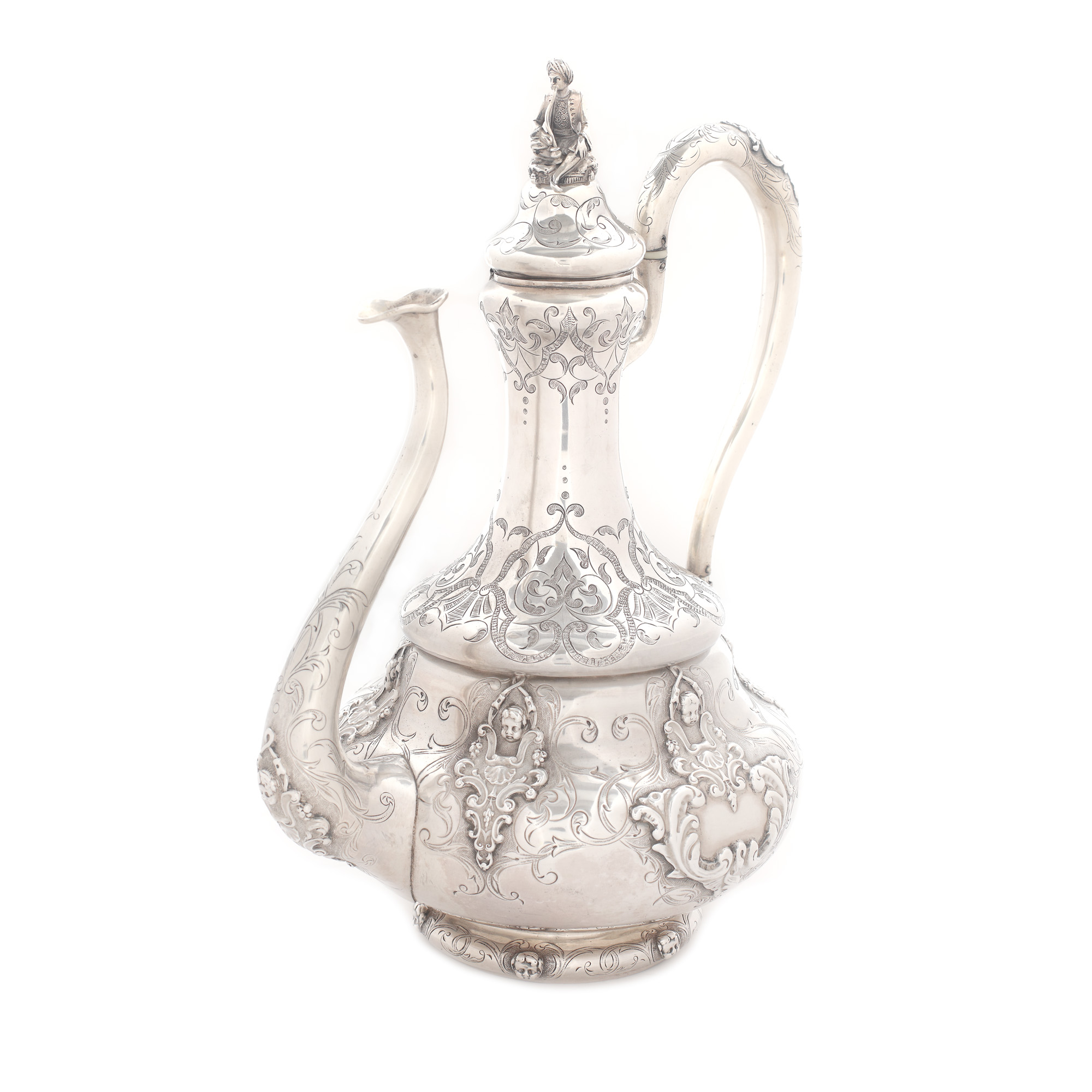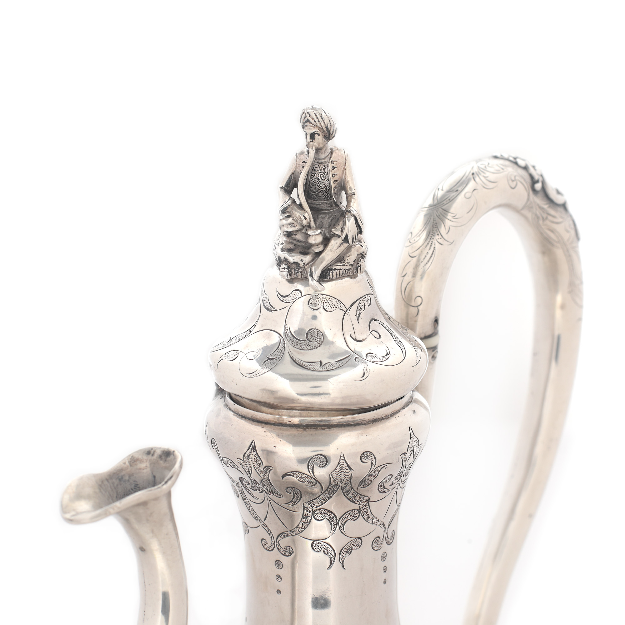 27. Set din argint, format din ceainic și letieră, cu amplu decor și personaj oriental surmontând capacul, cca. 1880