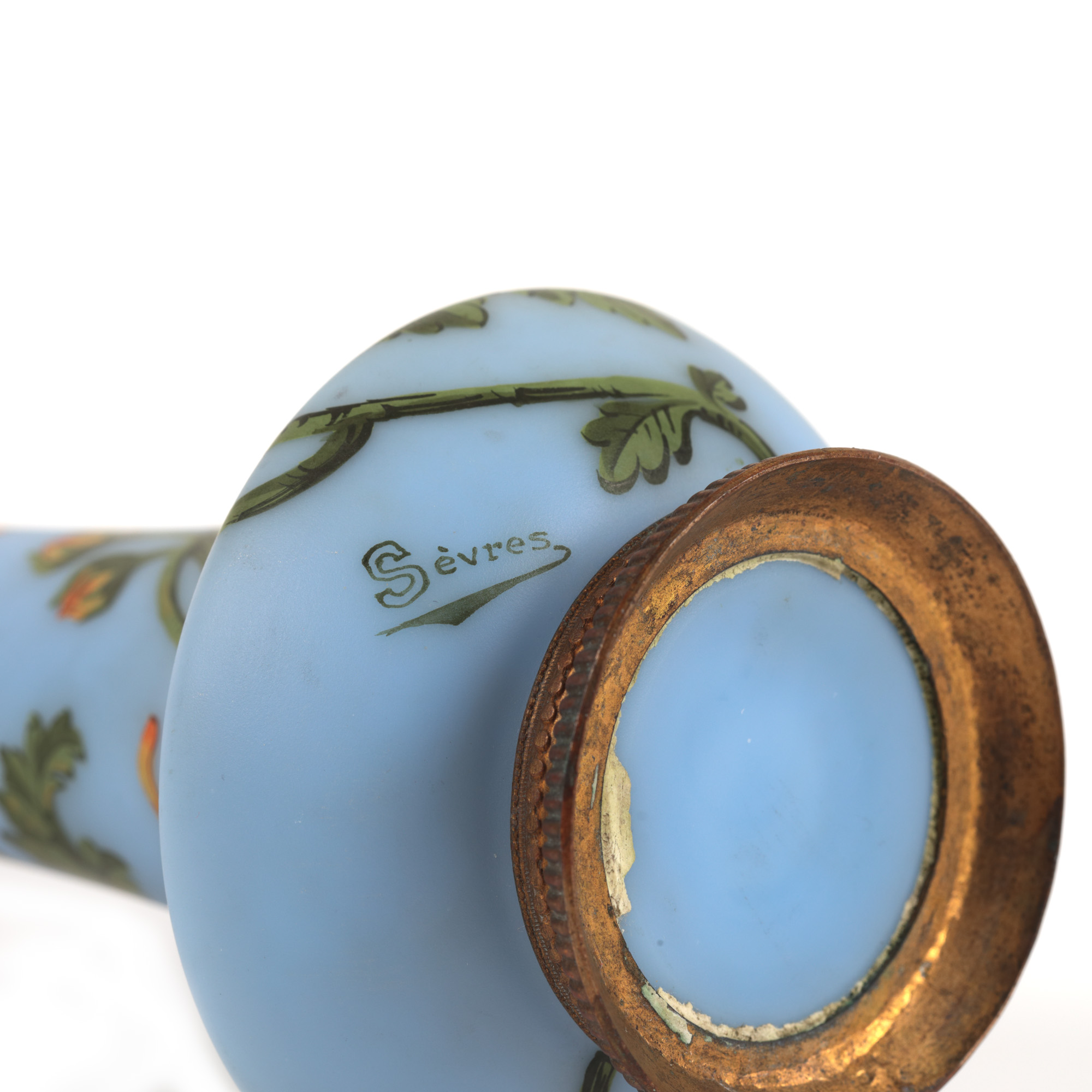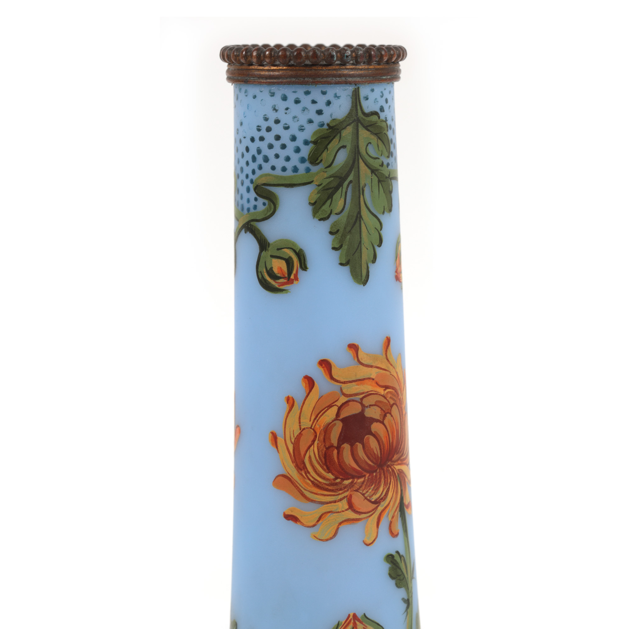 33. Vas soliflor Sèvres din sticlă pictată, cu montură din bronz, decorat cu crizanteme, cca. 1930-1935
