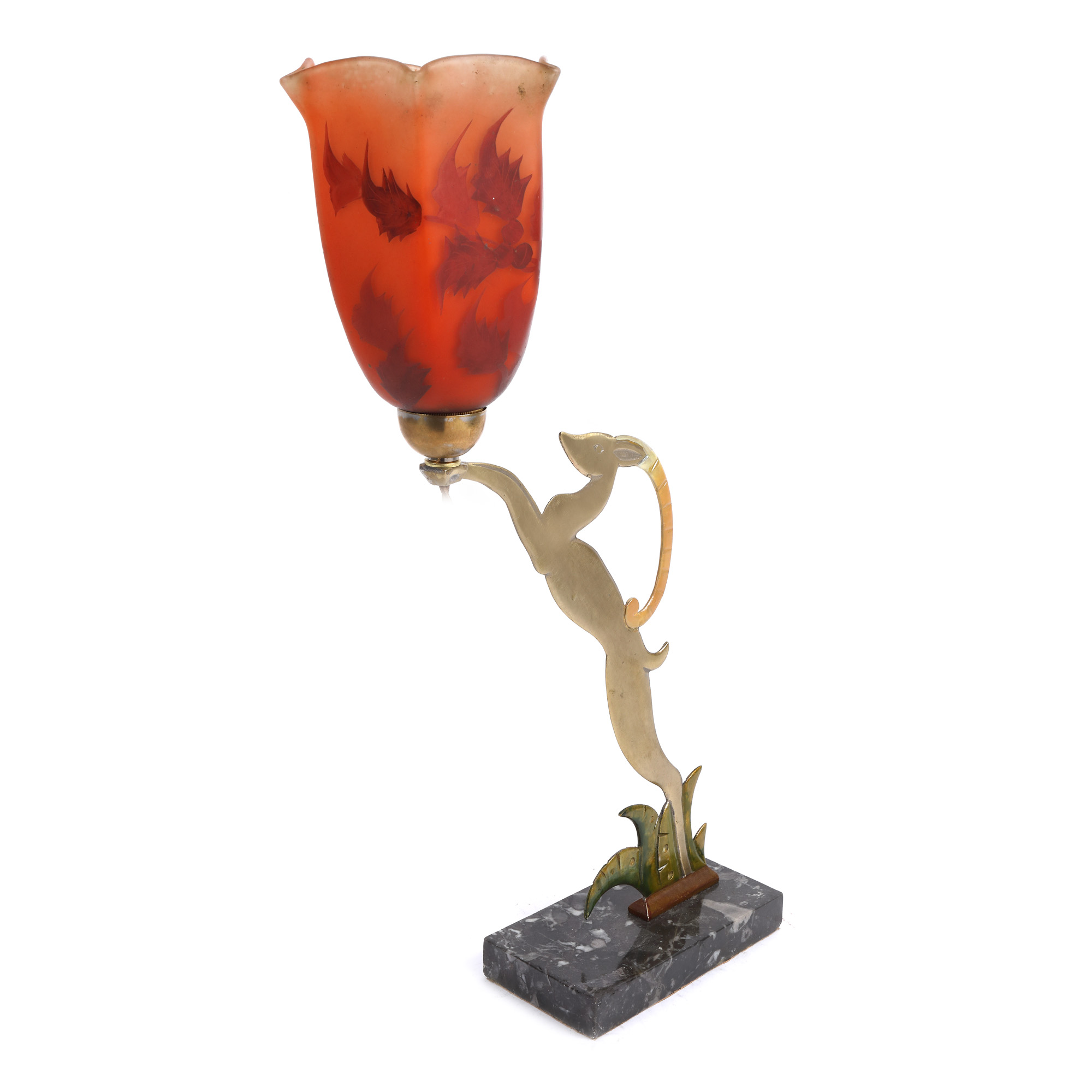 45. Lampă Art Deco pentru birou, din bronz și sticlă, cu soclu din marmură, autor Jean-Simon Peynaud pentru Atelier Cristallerie Pantin, cca. 1930