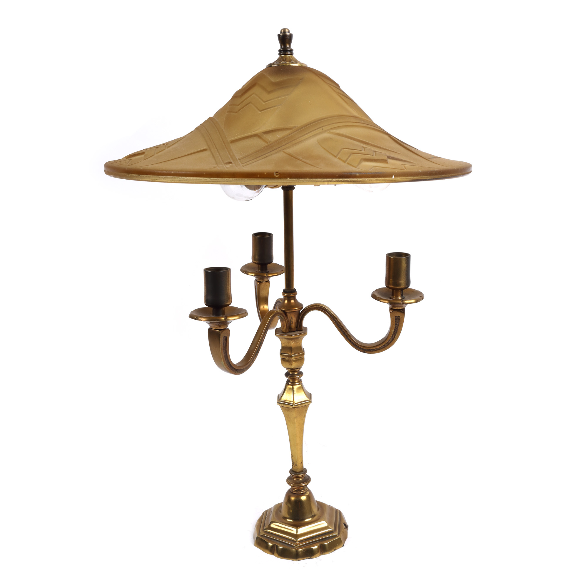 43. Lampă-sfeșnic Art Deco de masă, cu abajur din sticlă Degué, cca. 1930