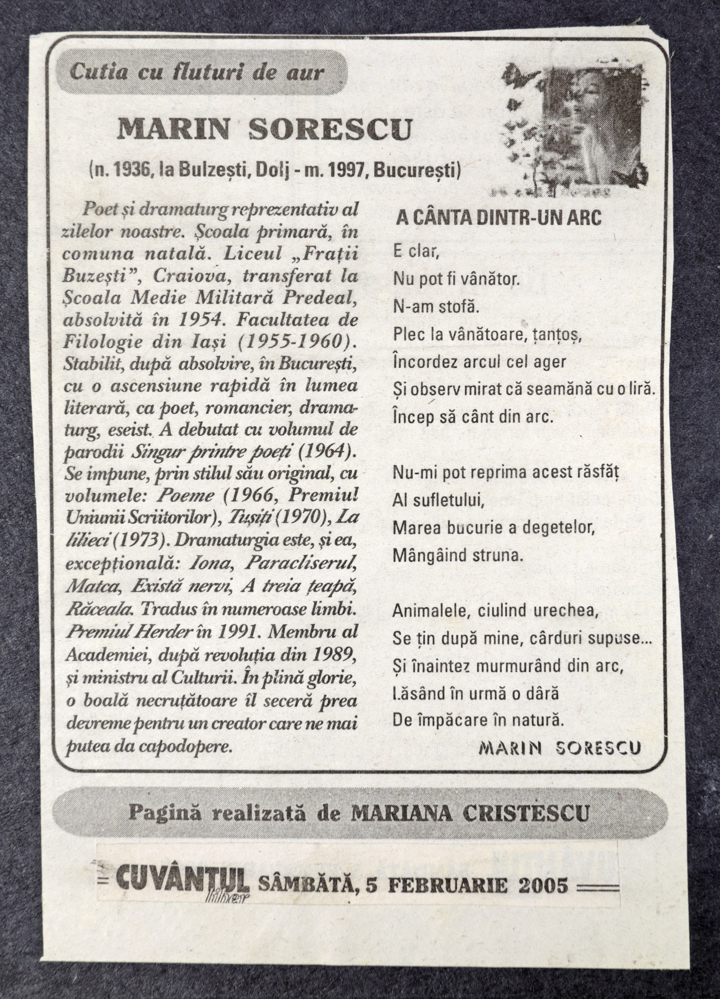 33. Album fotografic, cuprinde 25 de fotografii ale lui Marin Sorescu, 4 desene realizate, datate și semnate de acesta, precum și o dedicație a lui către Valeriu Vaida