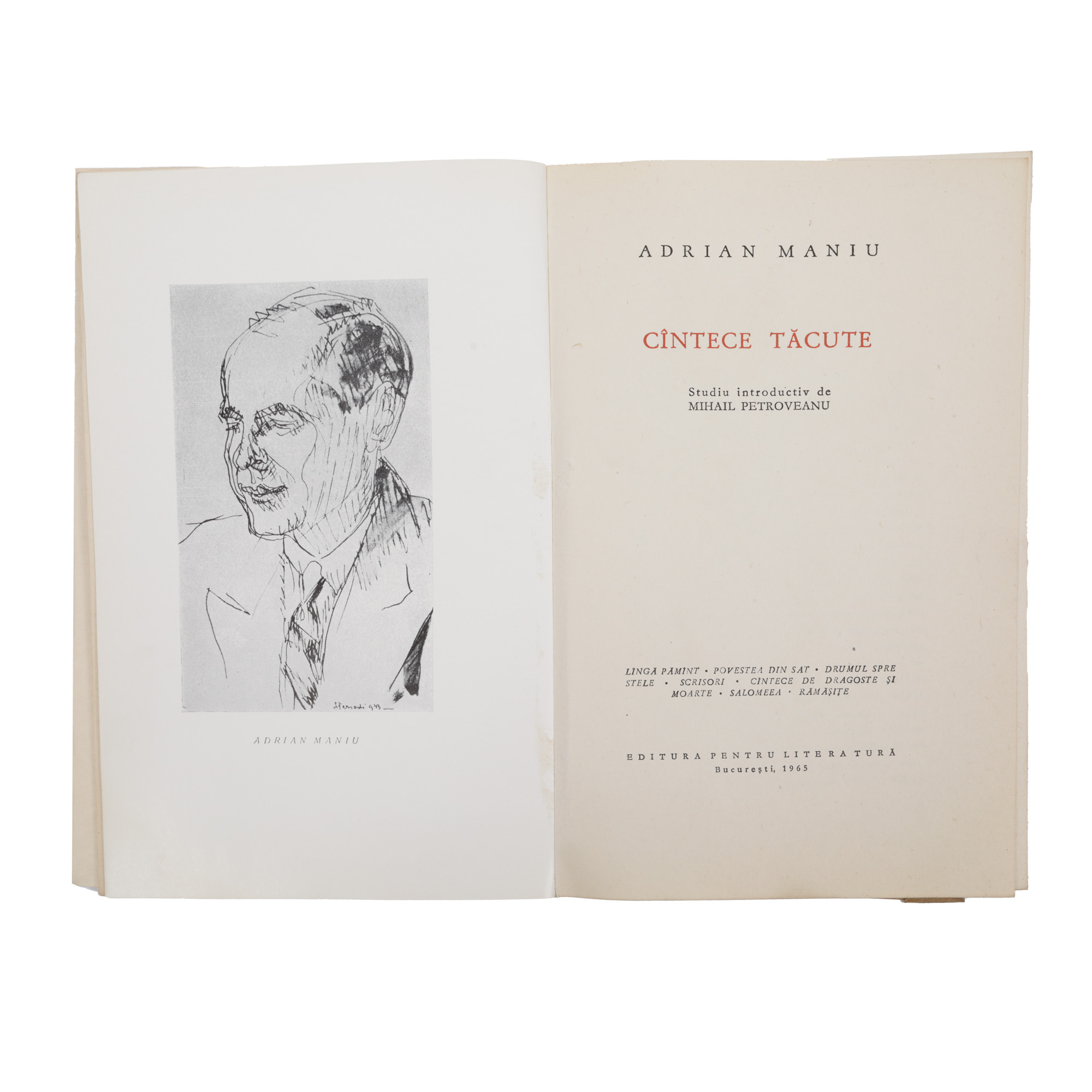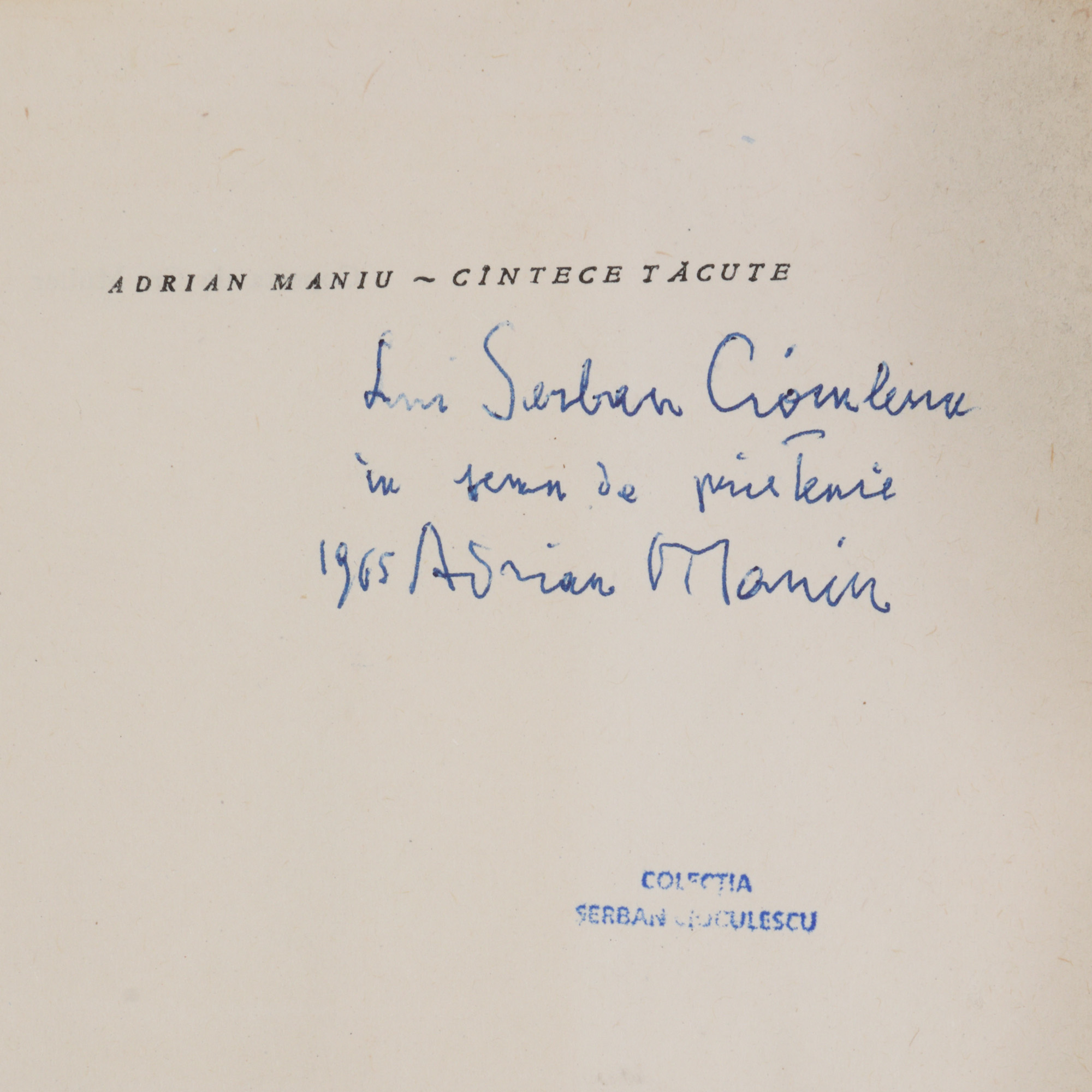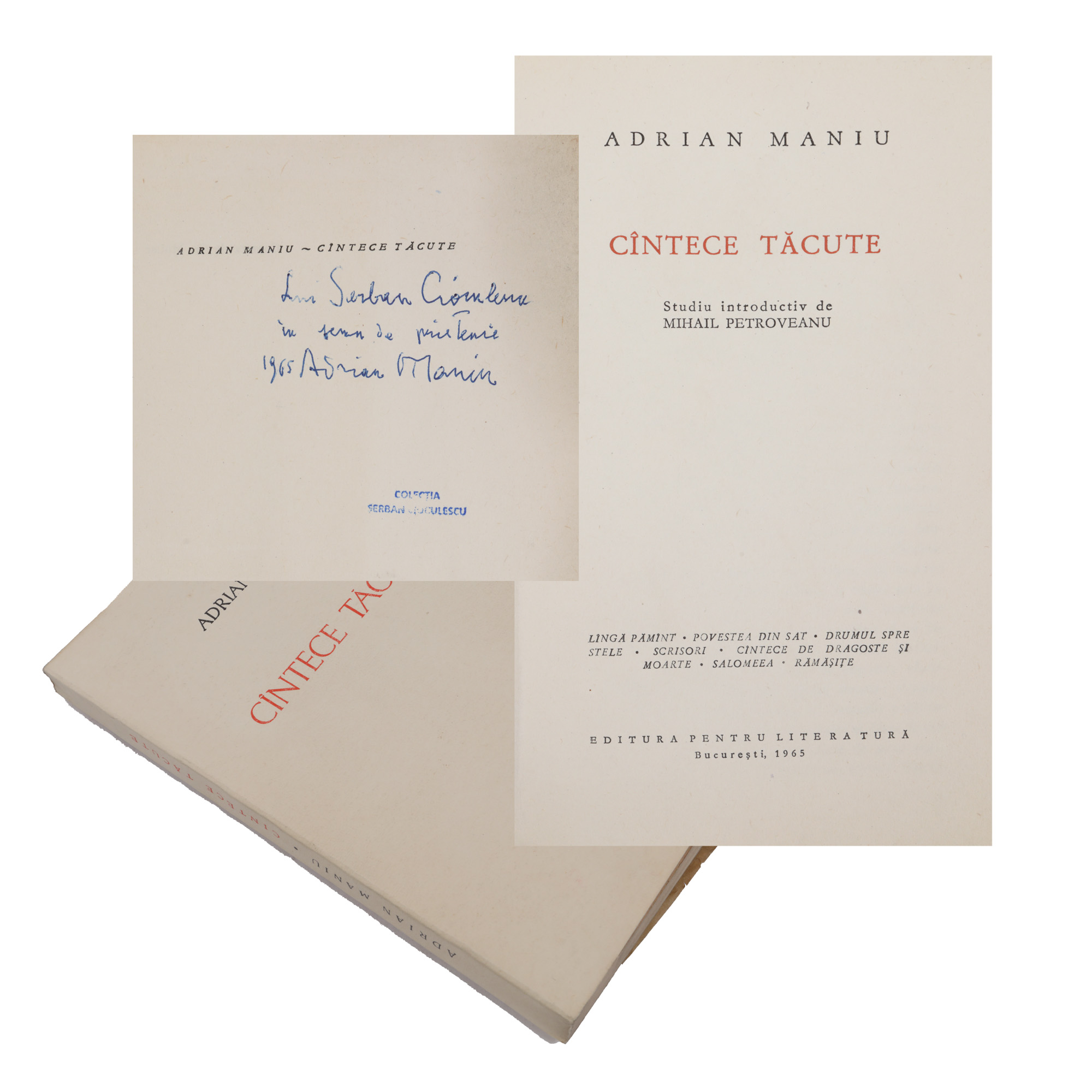 37. ”Cîntece tăcute”, de Adrian Maniu, București, 1965, cu dedicația autorului către Șerban Cioculescu, provine din colecția criticului literar Șerban Cioculescu