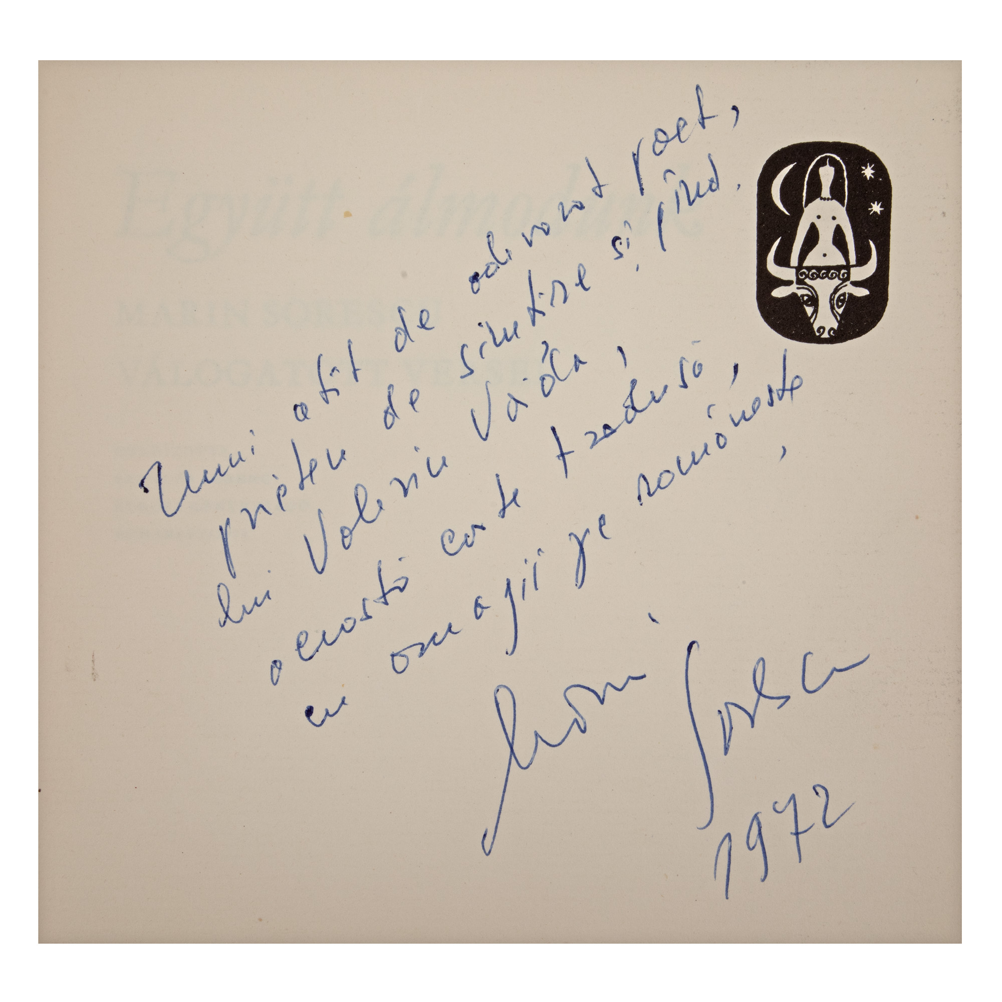 19. "Dormim împreună", de Marin Sorescu, în limba maghiară, Budapesta, 1971, cu ex-librisul scriitorului Valeriu Vaida si dedicația olografă a autorului