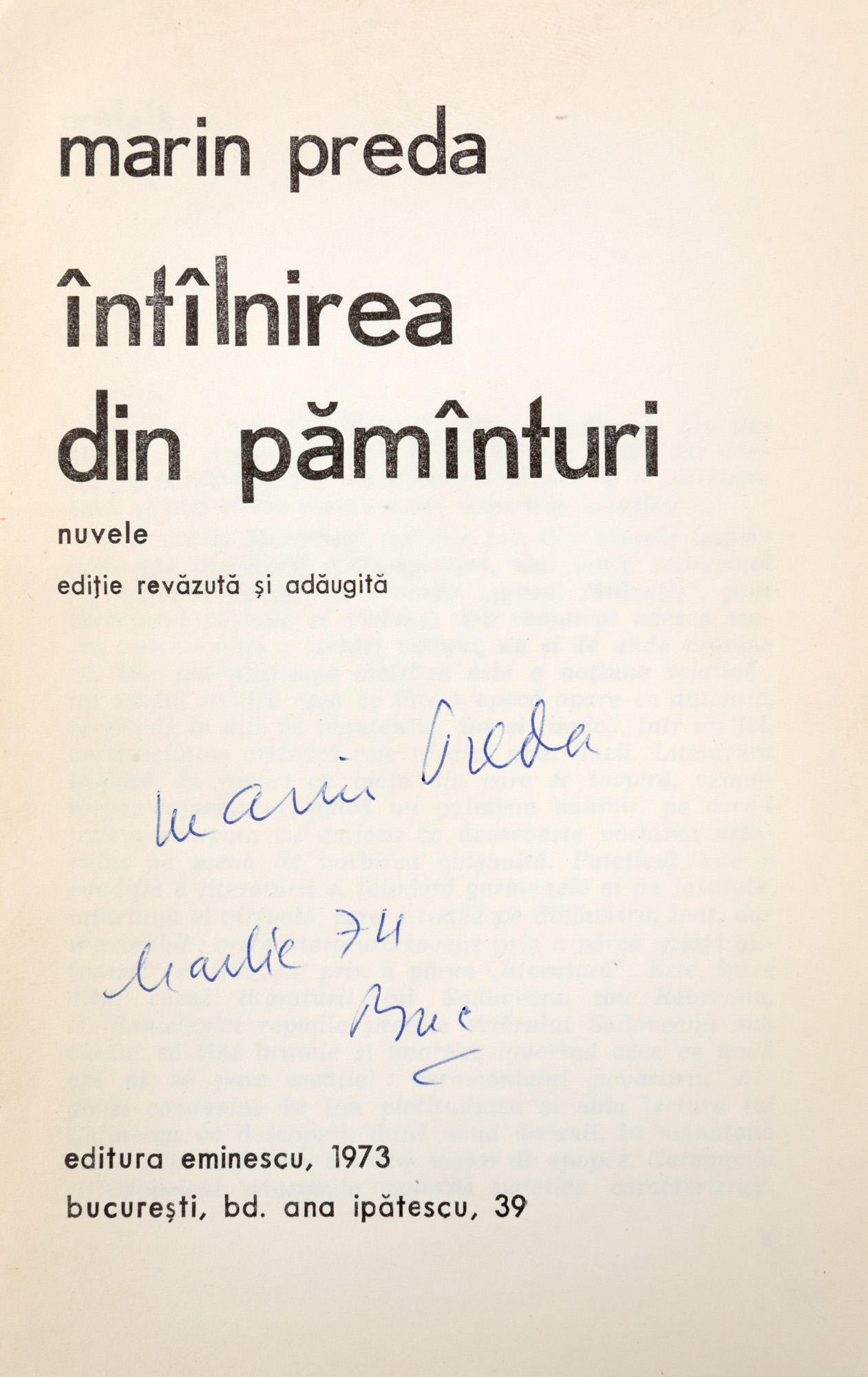 1. "Întâlnirea din Pământuri", de Marin Preda, București, 1973, cu semnătura olografă a autorului