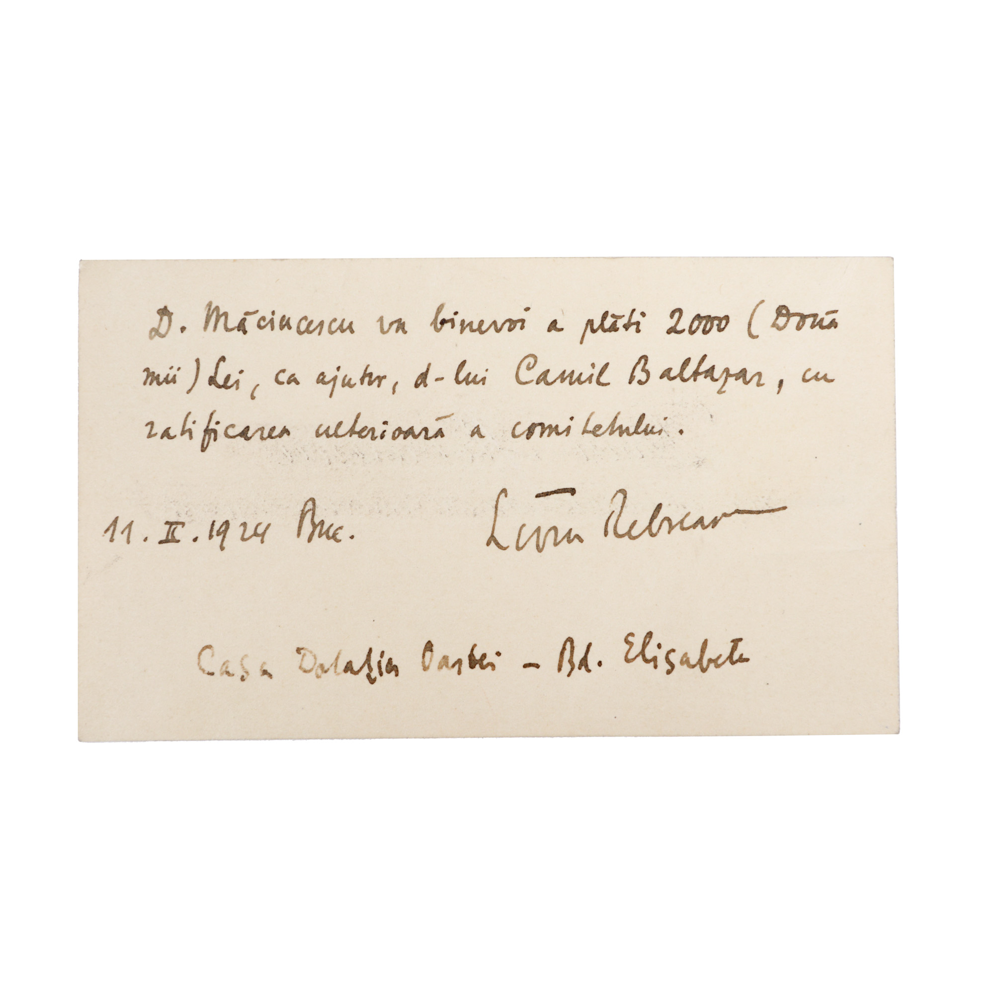 14. "Ion", de Liviu Rebreanu, două volume, București, 1920, ediție princeps, și cartea de vizită a autorului cu o însemnare olografă