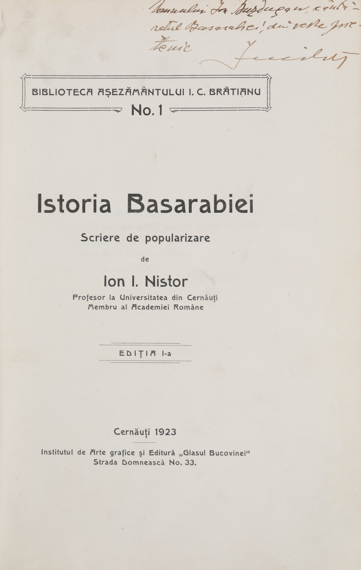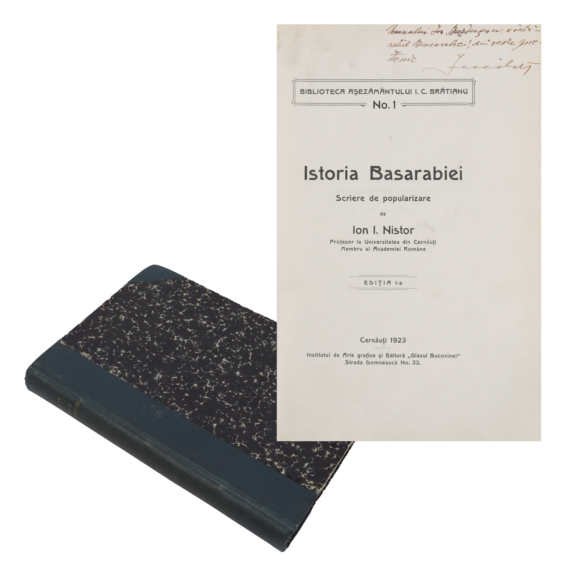 50. ”Istoria Basarabiei”, de Ion I. Nistor, ediție princeps, Cernăuți, 1923, cu dedicația autorului către poetul basarabean Ion Buzdugan
