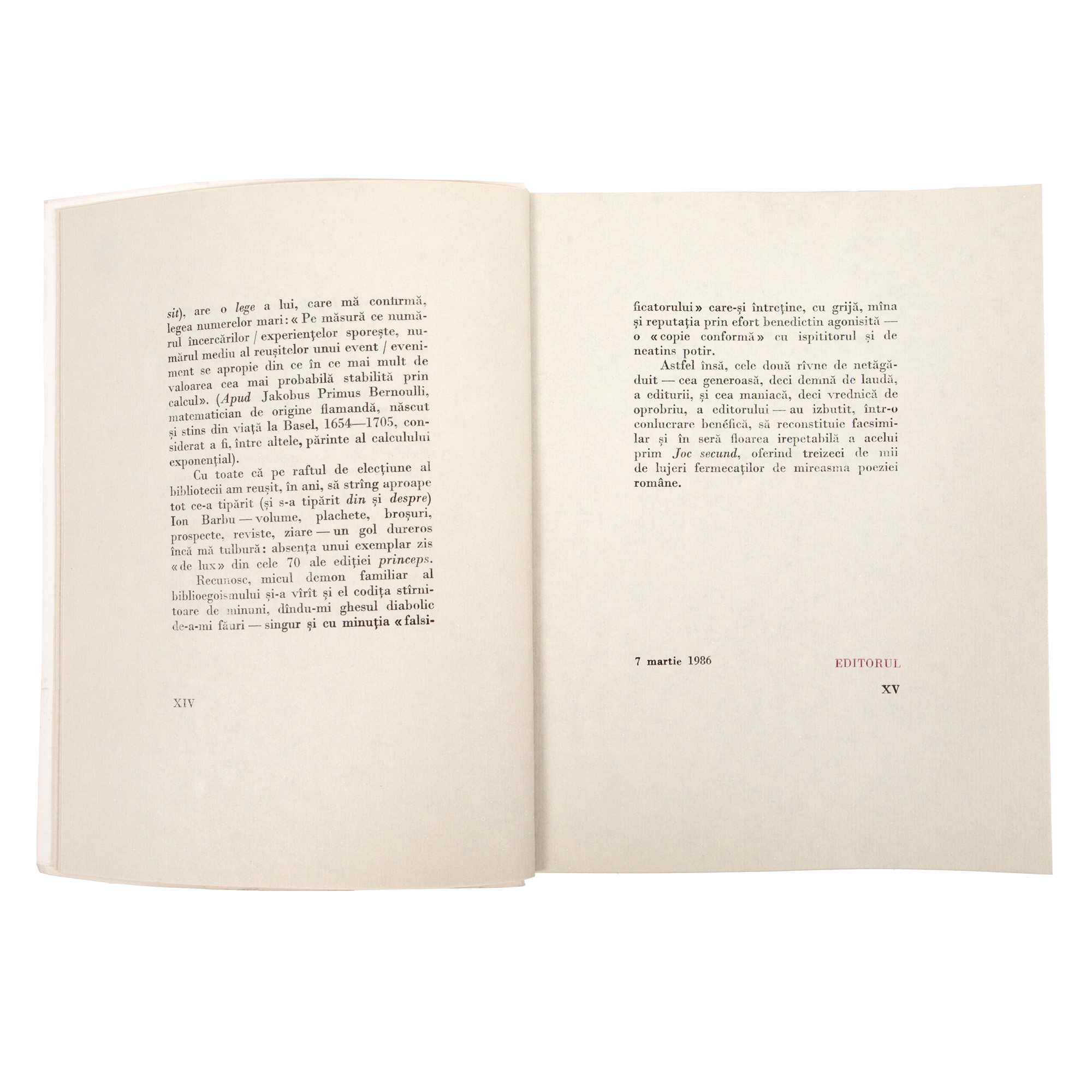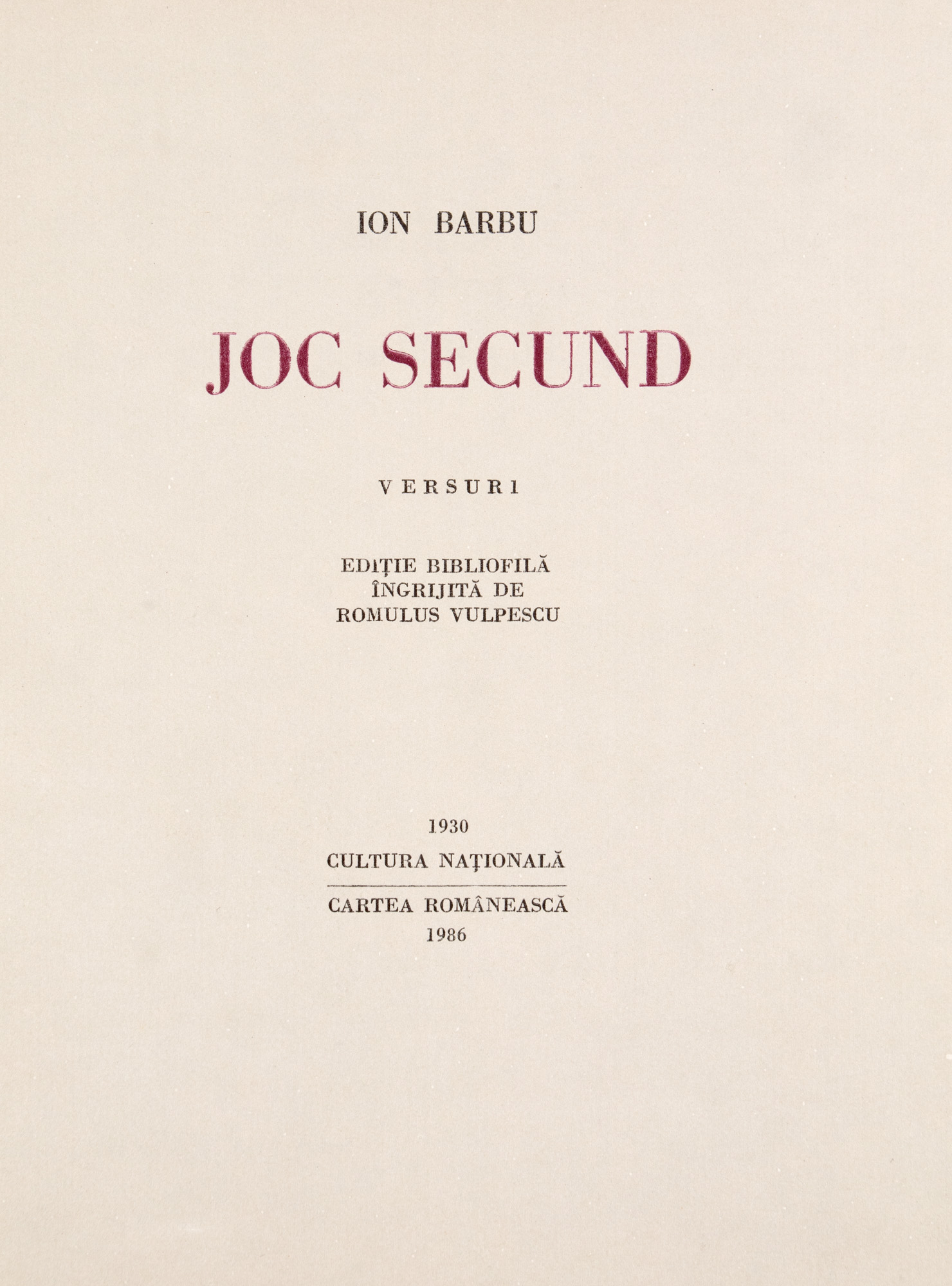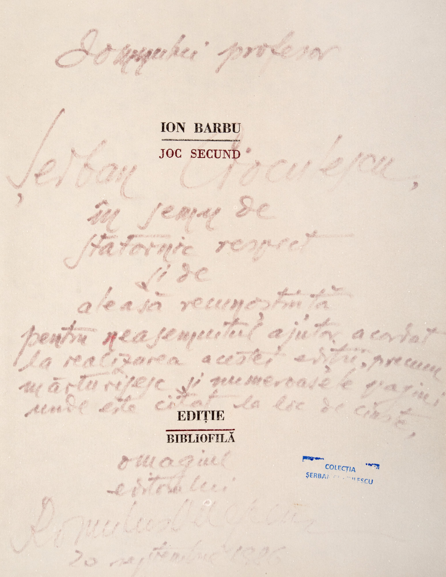 7. ”Joc secund”, de Ion Barbu, ediție bibliofilă îngrijită de Romulus Vulpescu, București, 1986, cu dedicația lui Romulus Vulpescu către Șerban Cioculescu, provine din colecția criticului literar Șerban Cioculescu