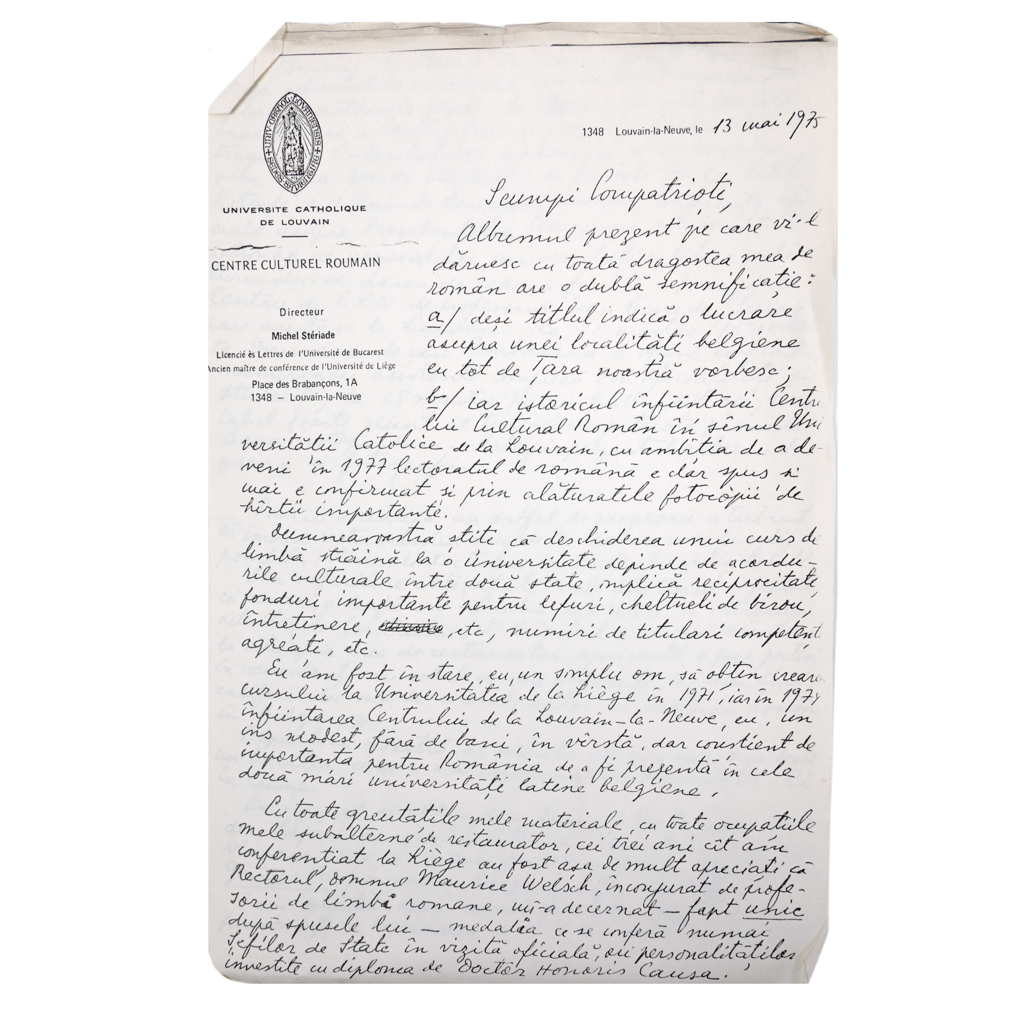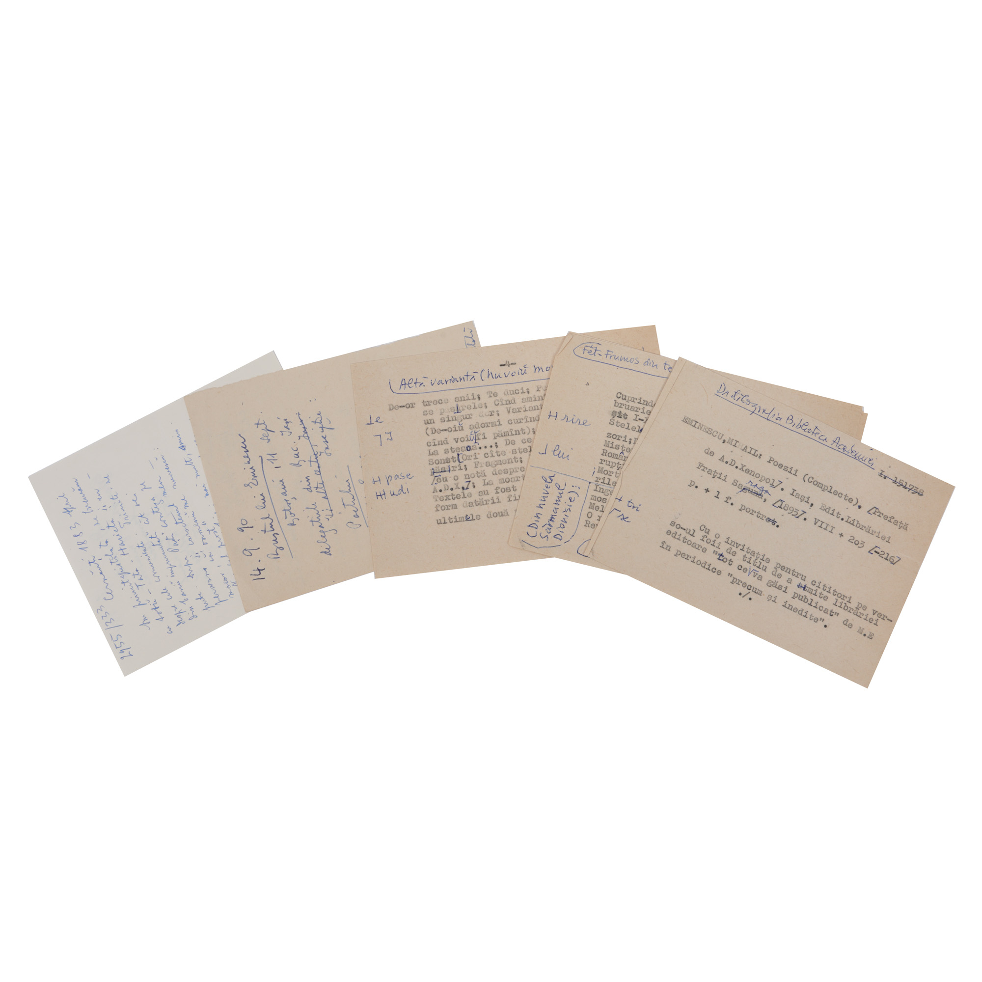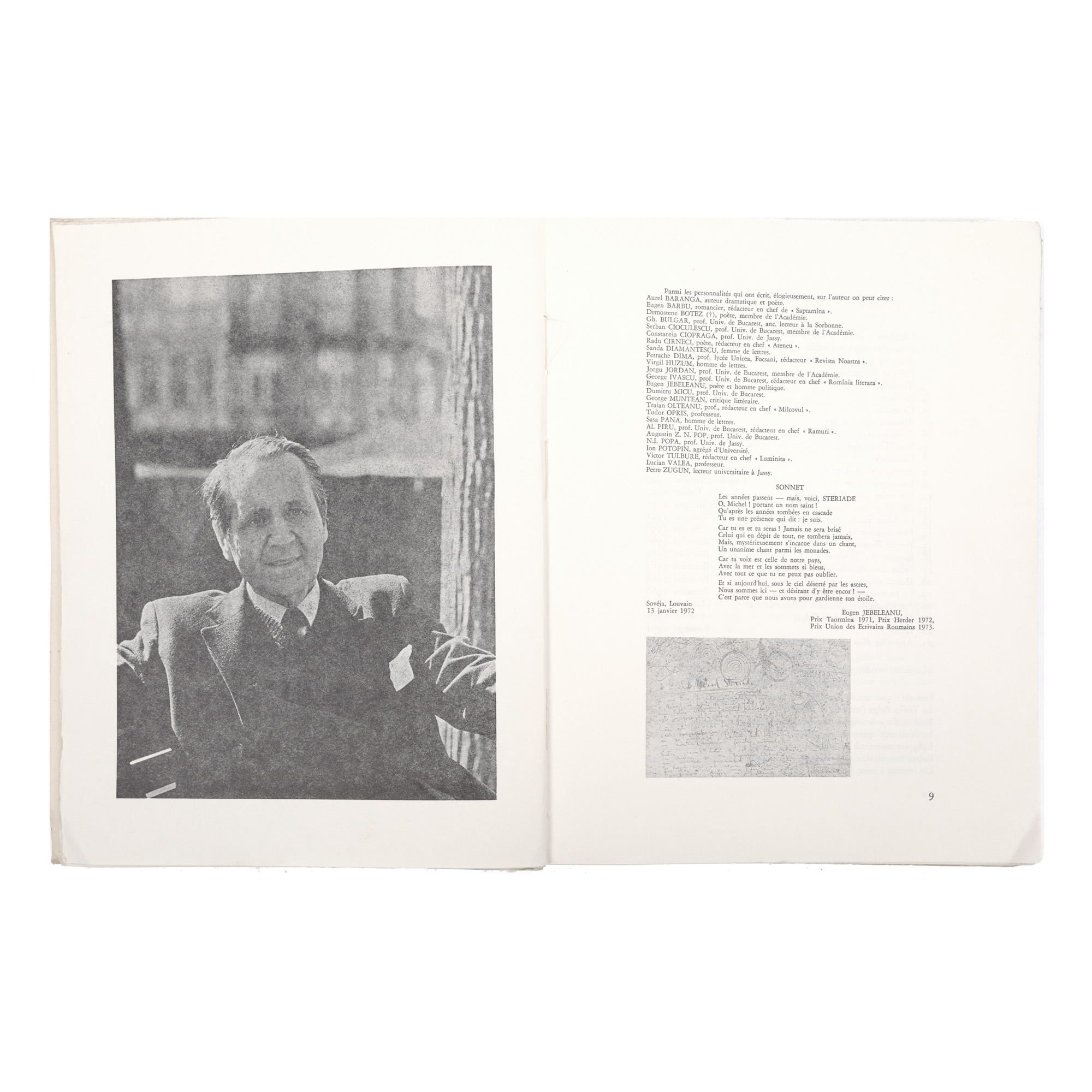 Lotul este alcătuit din următoarele piese: 1. Michel Steriade, Eminescu, Editions Soveja, Louvain, cu un citat din Nicoae Ceaușescu referitor la Eminescu tradus în franceză, cu numeroase heliogravuri după sculpturi de Idel Janchelevici. 2. Scrisoare dactilografiată și semnată olograf a lui Florin Steriade, fratele lui Michel Steriade, către directorul Bibliotecii Academiei Române, Șerban Cioculescu. 3. Broșură publicitară a Centrului Cultural Român din Louvain bogat ilustrată. 4. Copie șapirografiată după un discurs ținut de Michel Steriade la Centrul Cultural Român amintit. 5. Programul spectacolului de teatru Eminescu, piesă în două părți de Mircea Ștefănescu. 6. Planul rețelei de metrou a orașului Paris, cca. 1970. 7. Opt fișe de lectură redactate de Șerban Cioculescu. 8. Trei tăieturi din ziare pe tema Eminescu. 9. Studiu Vasile Netea, Din legăturile lui M. Eminescu cu Transilvania, cu dedicația olografă a autorului către Șerban Cioculescu. 10. Studiu Nicolae Liu, Mihai Eminescu și activitatea dramatică din Transilvania și Banat, cu dedicația olografă a autorului către Șerban Cioculescu. 11. Felicitare de anul nou semnată olograf de istoricul Nicolae Lui către Șerban Cioculescu. Punerea la un loc a acestor piese i-a parținut lui Șerban Cioculescu.