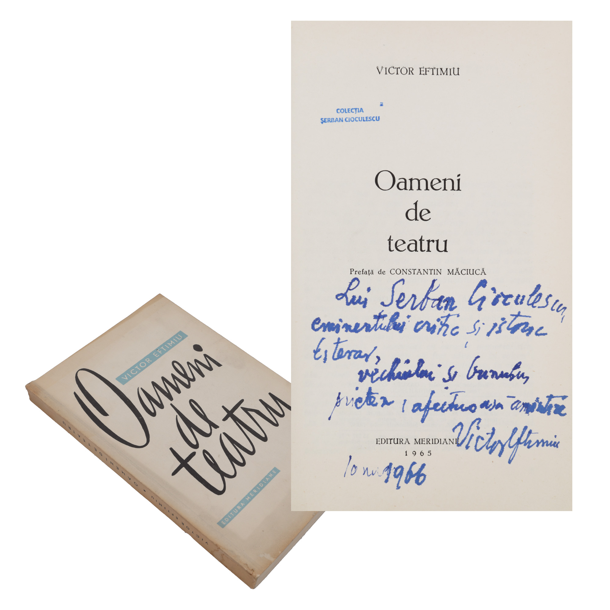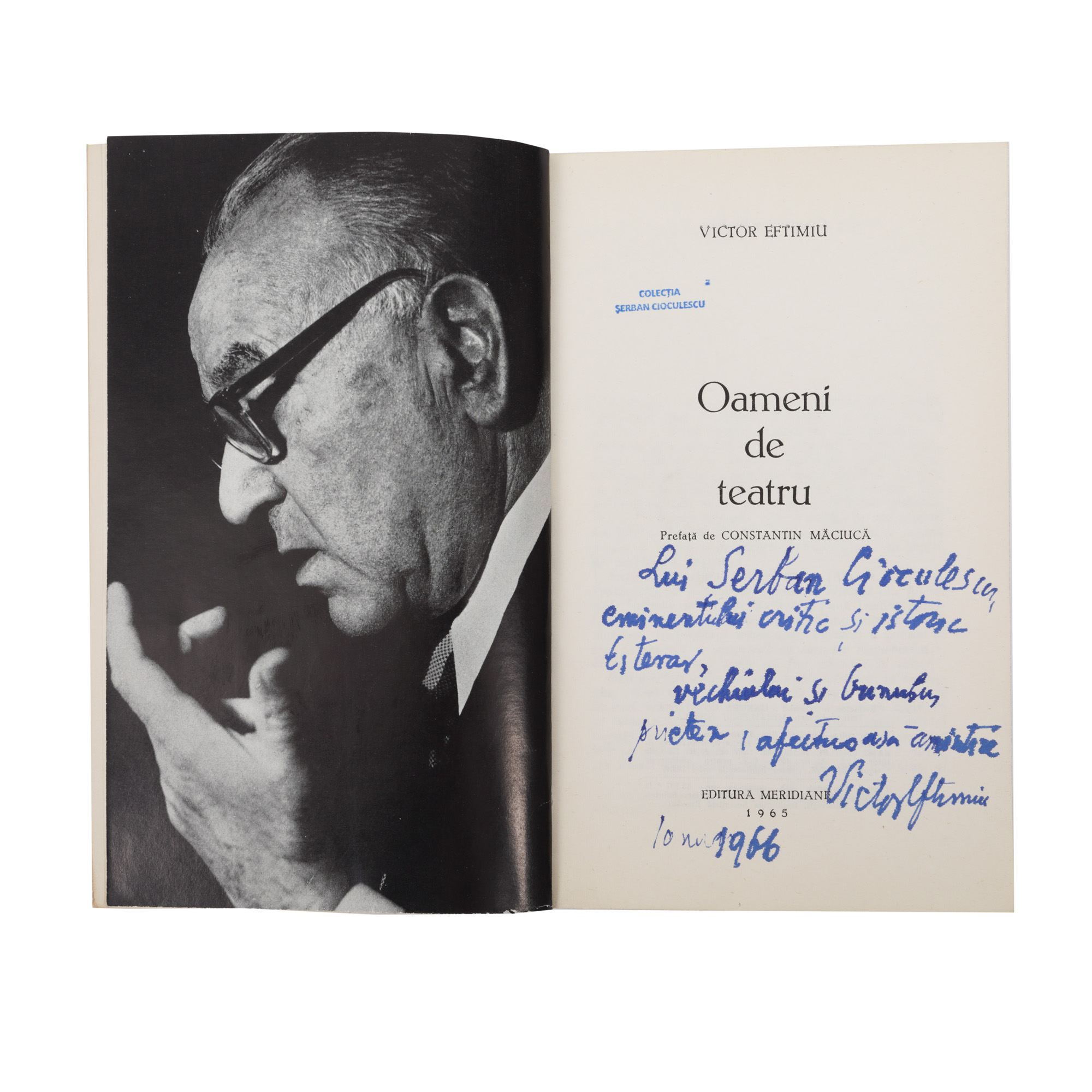 43. ”Oameni de teatru”, de Victor Eftimiu, București, 1965, cu dedicația autorului către Șerban Cioculescu, provine din colecția criticului literar Șerban Cioculescu